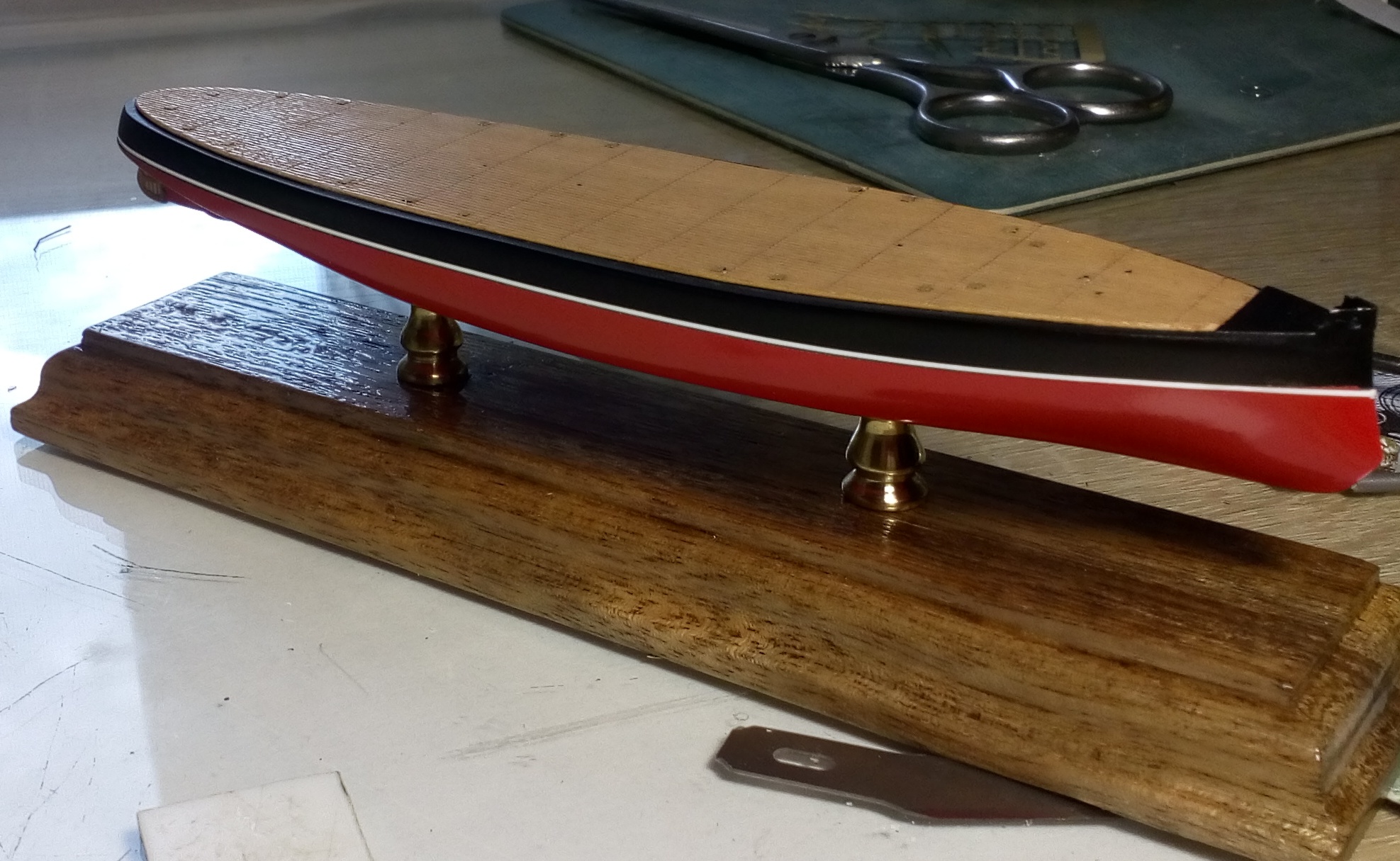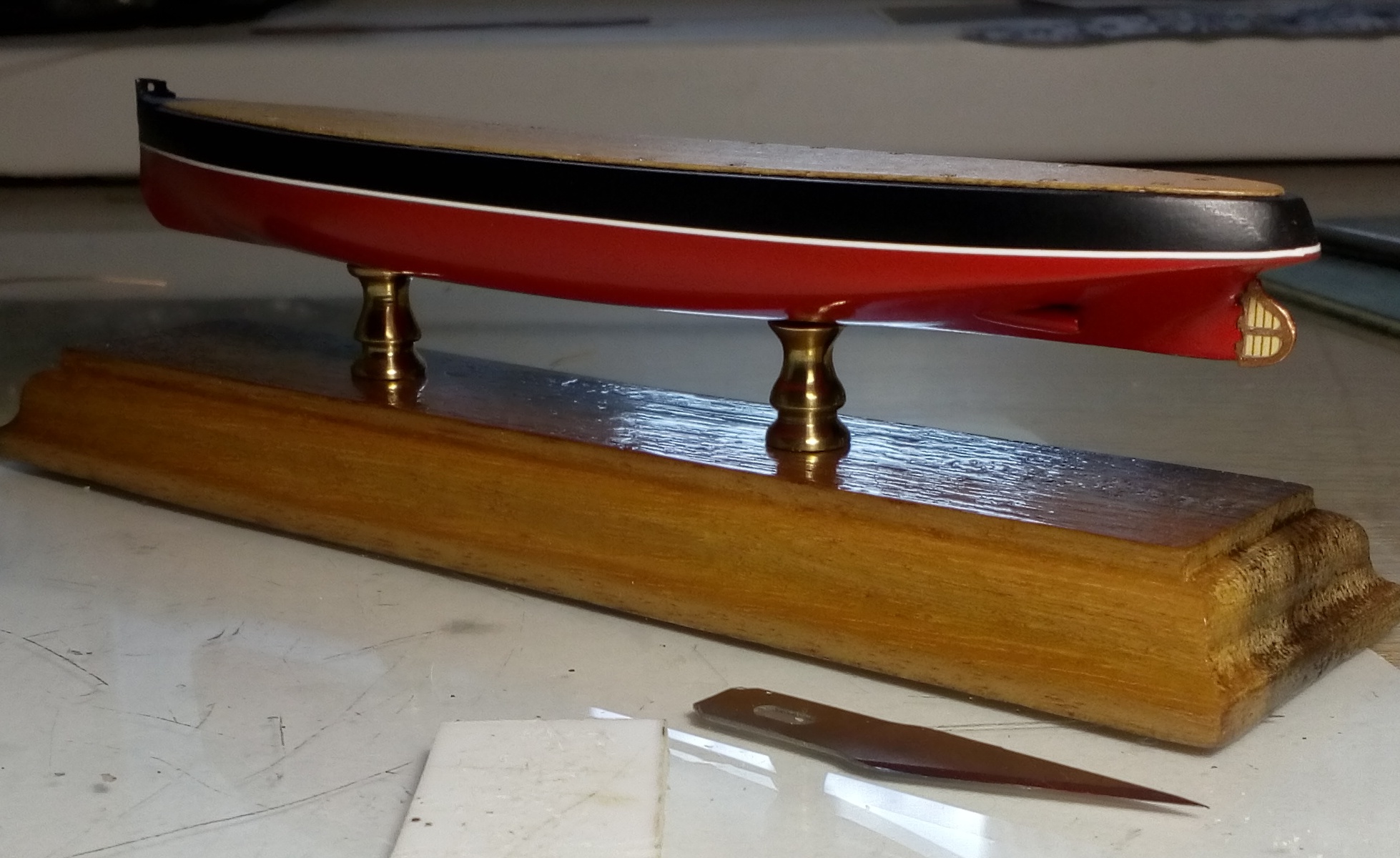 Ватерлинию наклеивал самоклеящейся пленкой, типа оракал только раза в два тоньше и порезанной на плотере на полоски 0,3мм. Даже в бинокулярных очках не заметил на модели , а на фото благодаря Вашему замечанию увидел в носу, ну ничего исправлю.