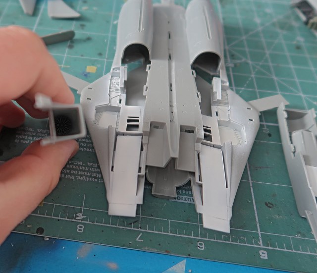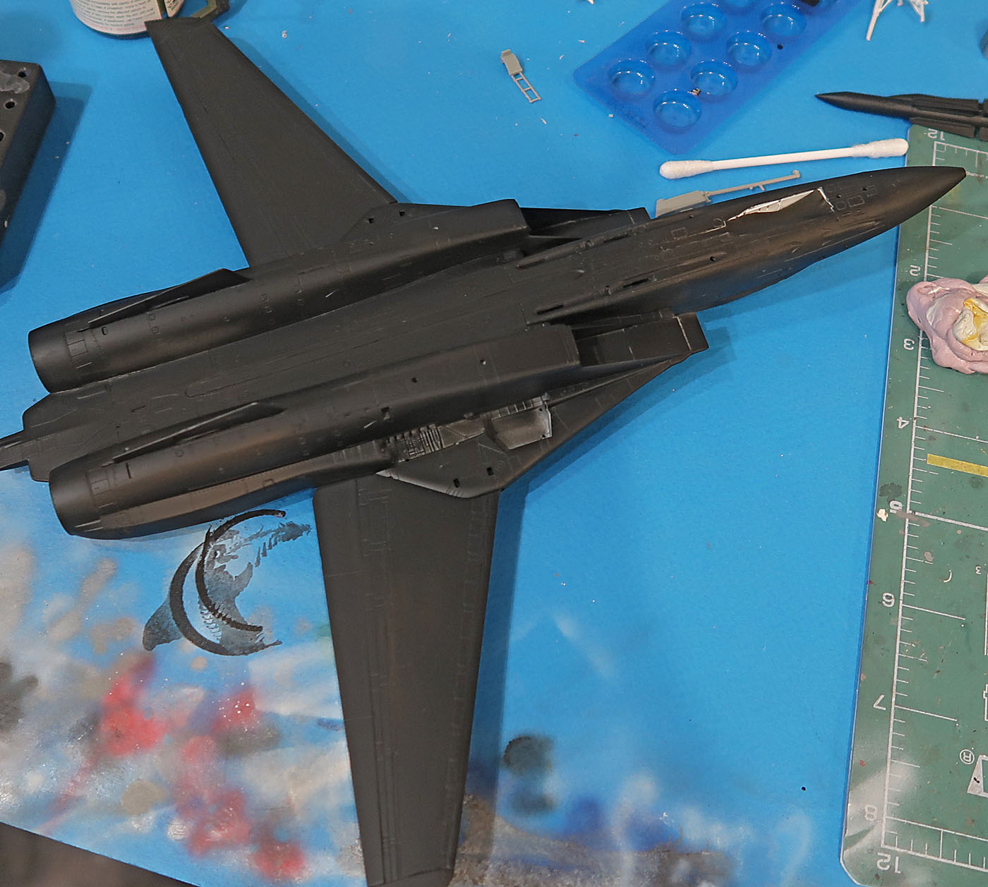 Как и задумывалось - накрасил редкие нечОрные элементы: кок, резинки в зоне складывания крыльев, полоска металла на воздуханах и карбон на жопке