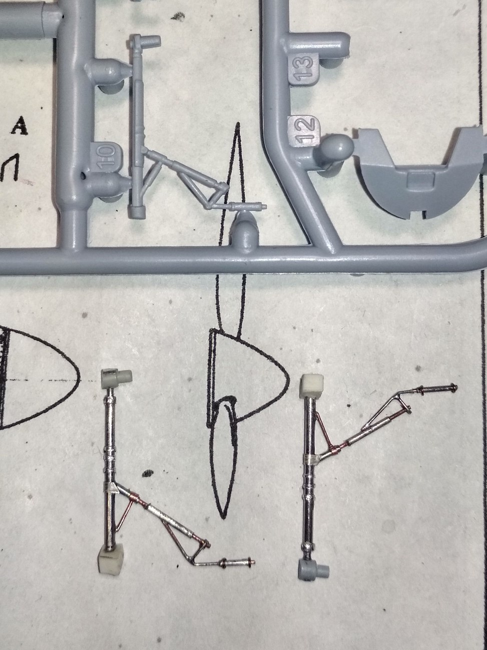Стойки шасси сделал по образцу модели от Айрфикс, из игл и медной проволоки, крепил все на суперклей и немного паял.