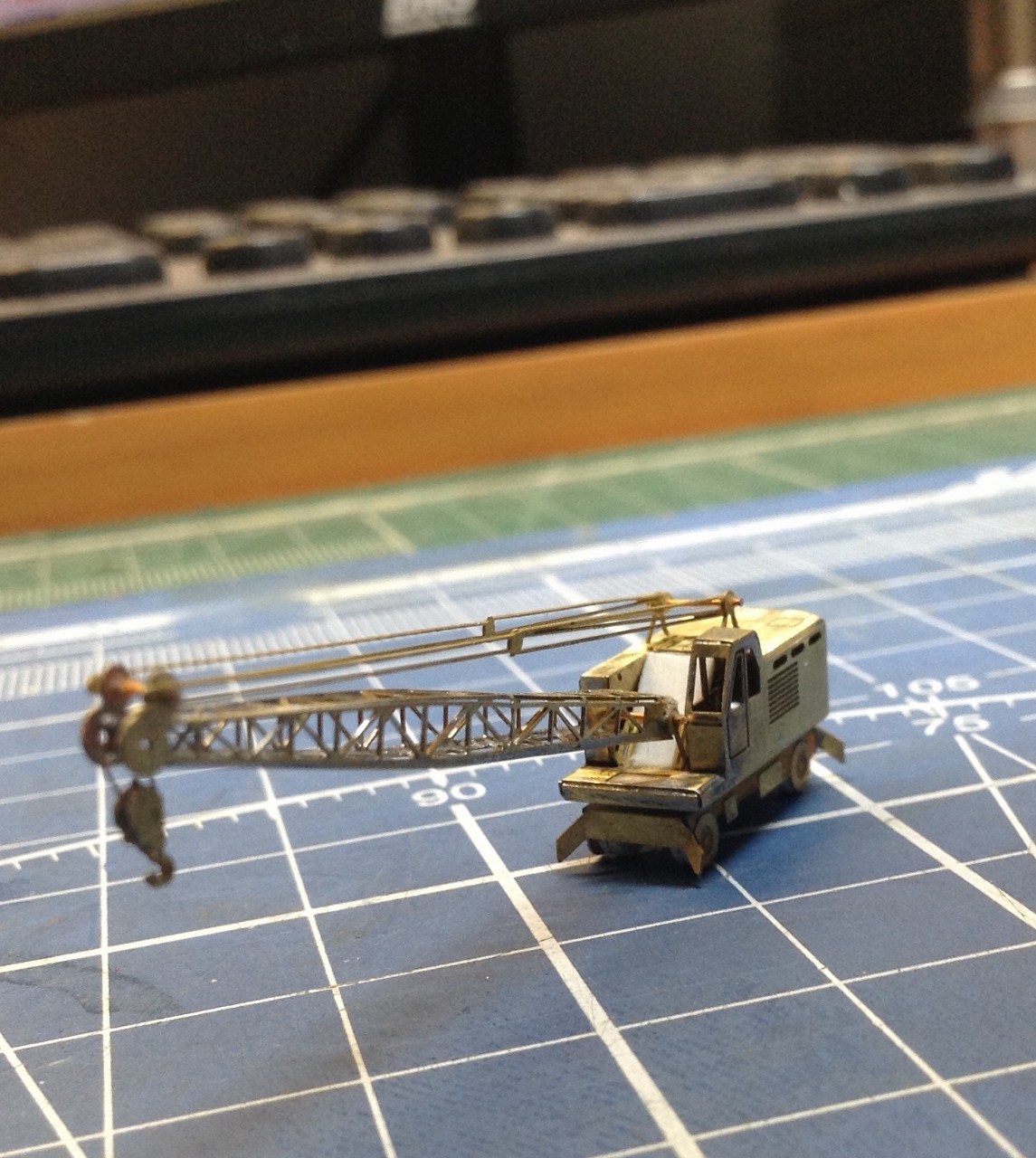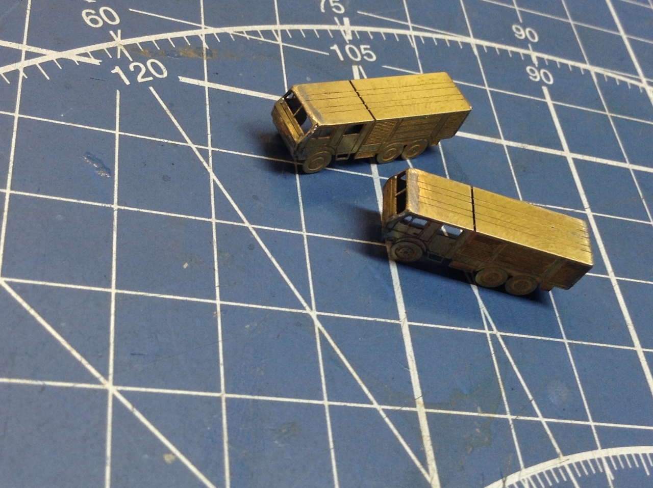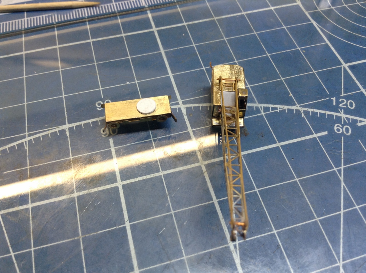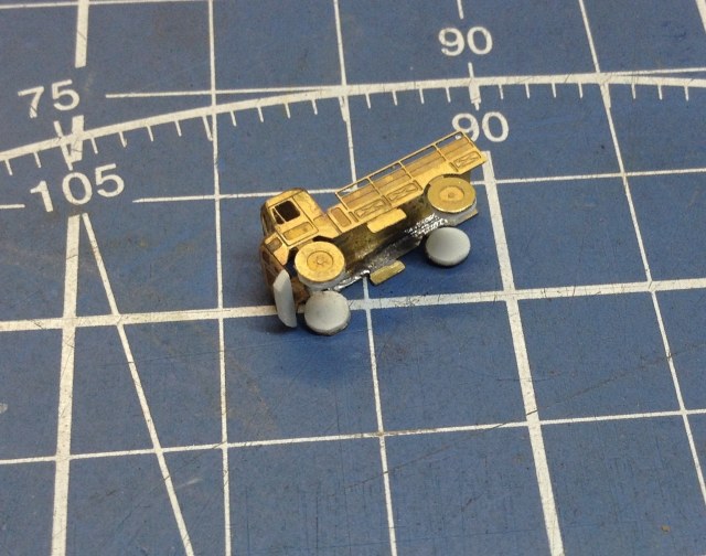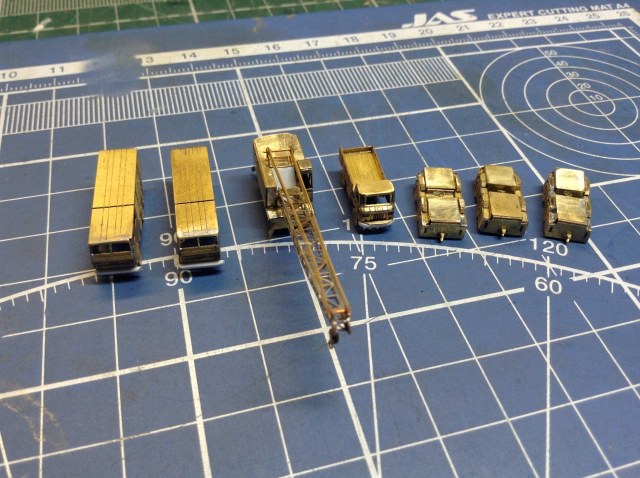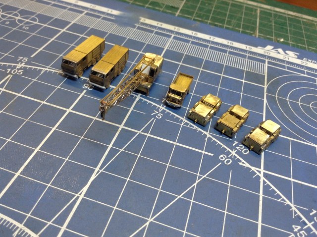 На фото видно и доработки ФТД из пластика , так что сам процесс работы в подробностях не нуждается.Единственное что хочется озвучить, так это отсутствие на плате ФТД детали "лобовой части" башенки Крана на пневмо-ходу, Очевидно что что-то у "Микродизайна" "не срослось". Пришлось сделать таковую из пластика. И ещё хочу отметить что схемы сборки "автопарка" в Инструкции по сборке ФТД НЕТ!! Нет её и на официальном сайте фирмы " Микродизайн". И если "шишигу"и "пожарки"собрать не требуется большой интуиции., то вот собрать "Палубные тягачи"- это ещё та задачка! На каждой детали ФТД этих тягачей имеется "полутрав" с каждой стороны. Поэтому вначале НЕПОНЯТНО - КУДА и В КАКУЮ СТОРОНУ НУЖНО ГНУТЬ ту или иную деталь.