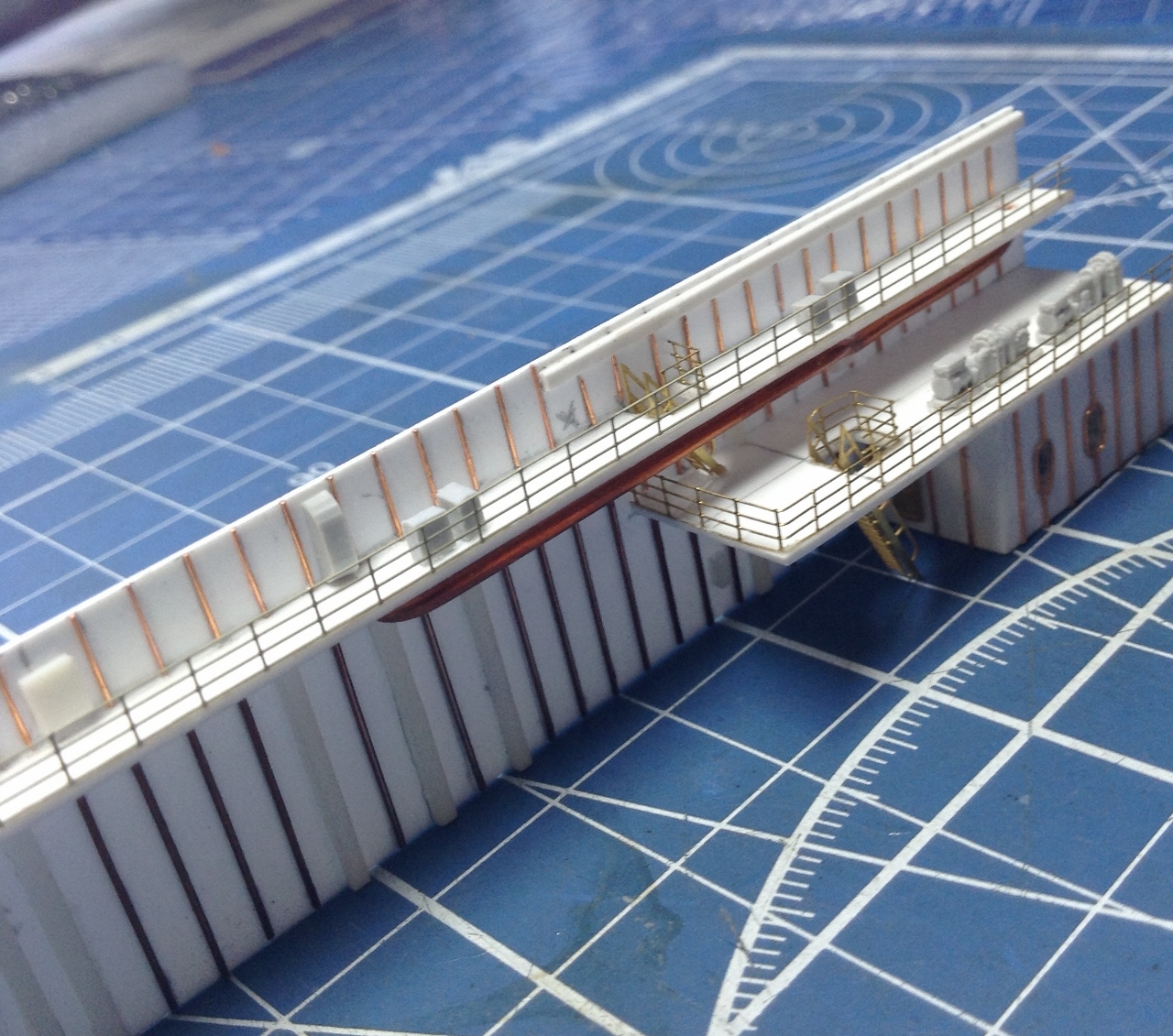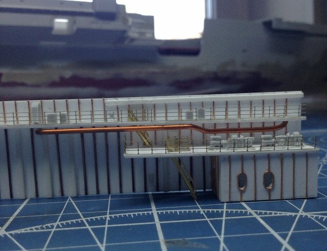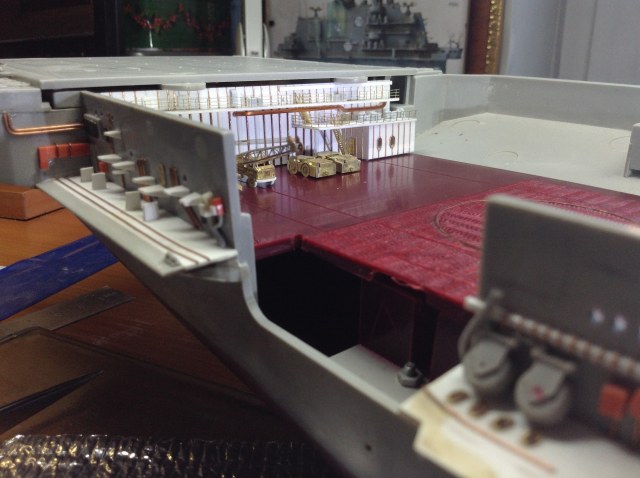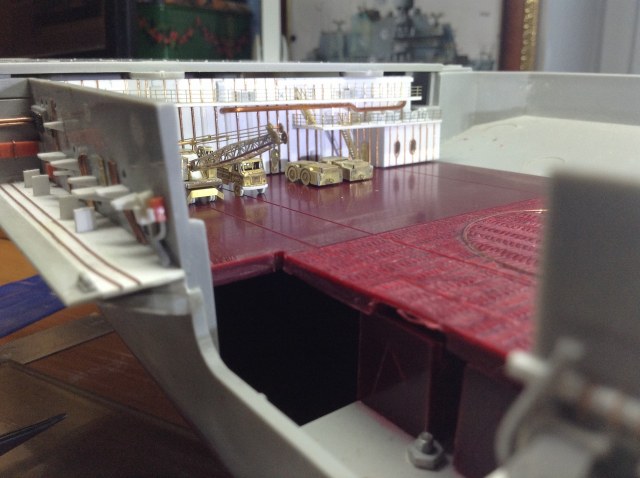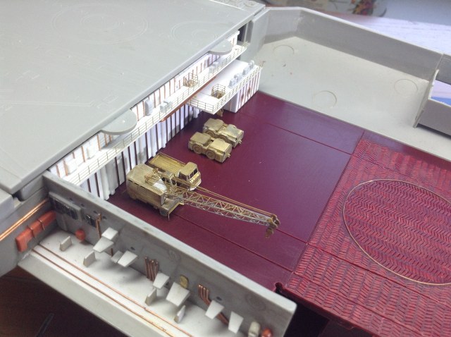 Правый Борт - приклеить ГОТОВЫЕ Носовые спонсоны . В нишах Лифтоподьемников растановить на Свои Места Вертикальные и наклонные трапы (это всё детали ФТД.) Самостоятельно изготовить систему передачи грузов типа "Струна" ( по ним пока работы = 0) Приклеить на свои места ПЕРЕДЕЛАННЫЕ консоли лифтоподьемников и самих лифтов.