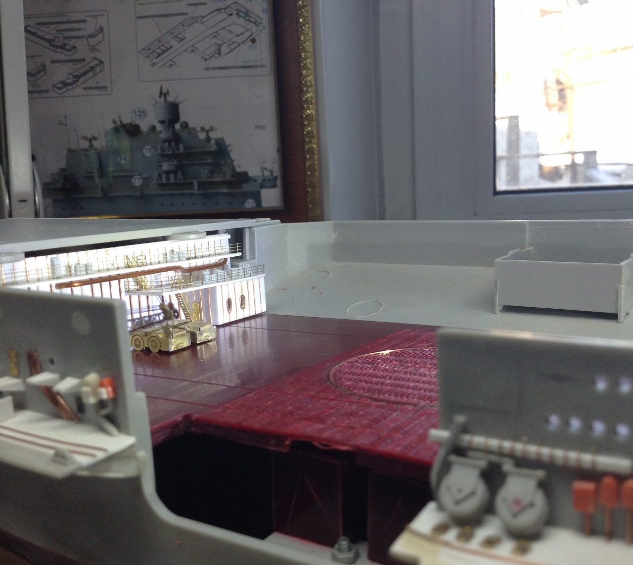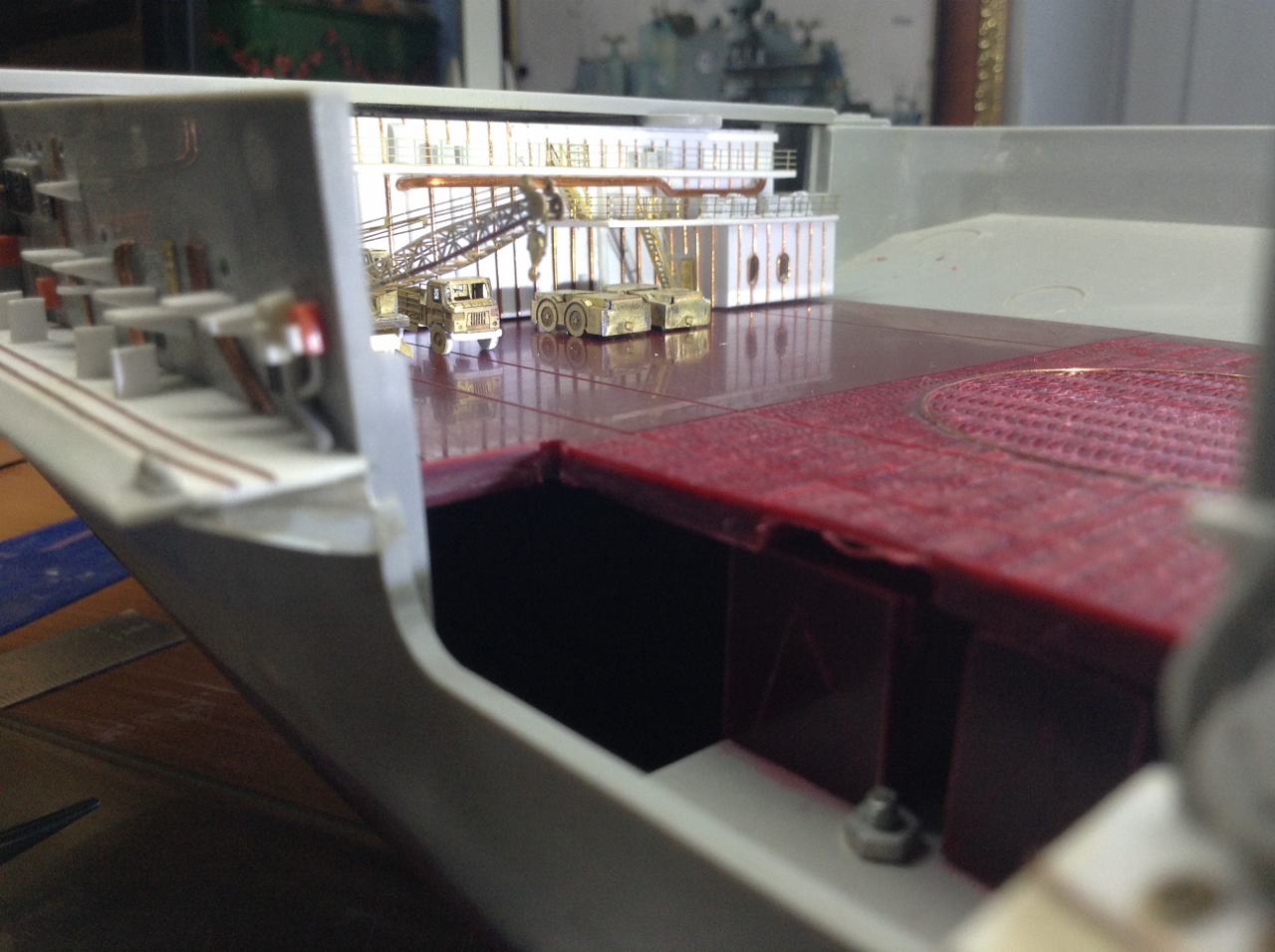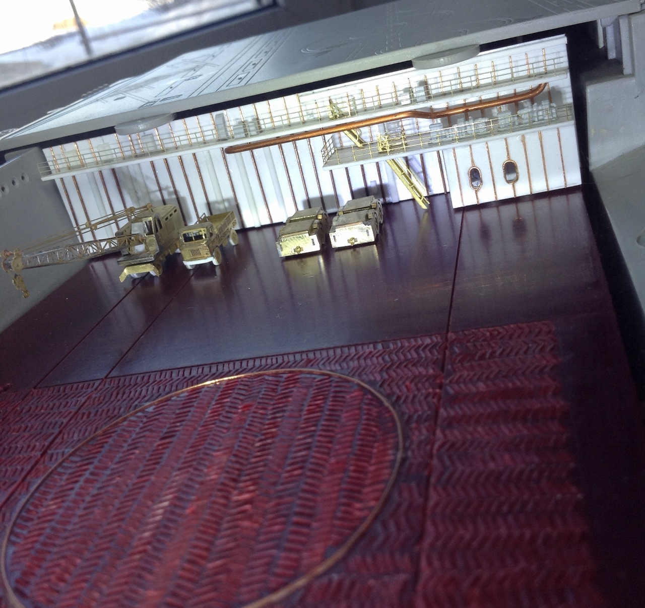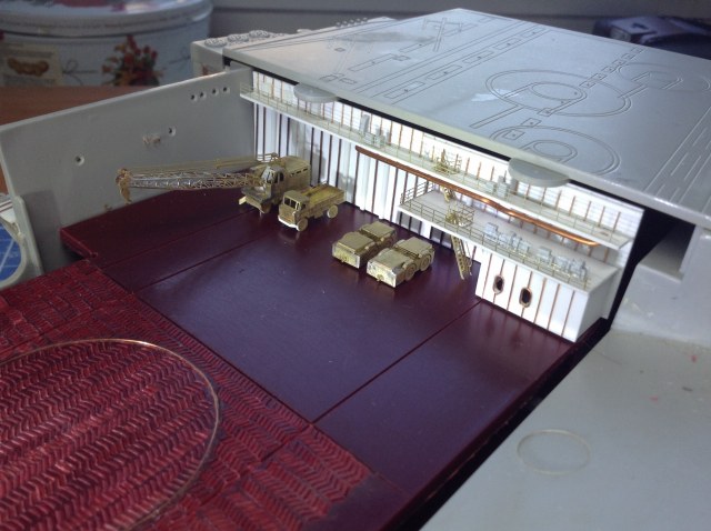 Ангар - будет ВТОРОЙ полностью ОКрашенной деталью но после изготовления переборок .Планирую его сделать "под ключ " с полным наполнением.самолетами вертолетами и автомобилями..То есть ангар- это своеобразный БЛОК- который можно будет вставить в модель на любом финишном этапе. Который я в данное время и работаю. ("шлея под хвост попала"-сделать именно сейчас ангар, хотя "по плану" было завершить работы с Левым бортом и "разобраться" с иллюминаторами.