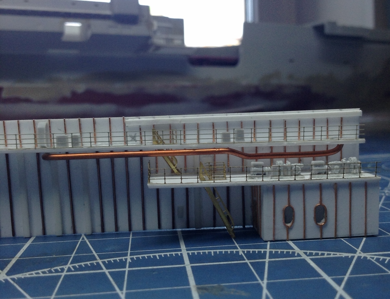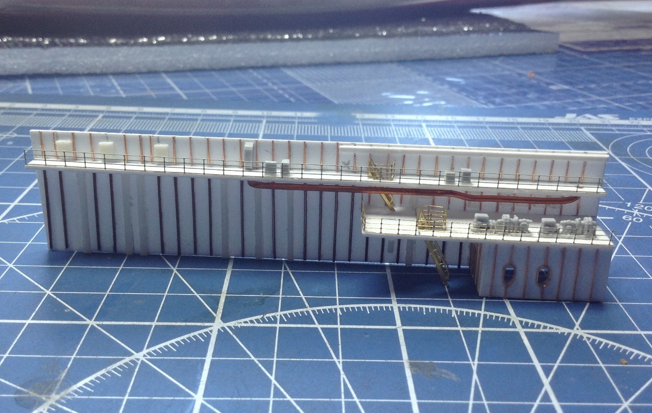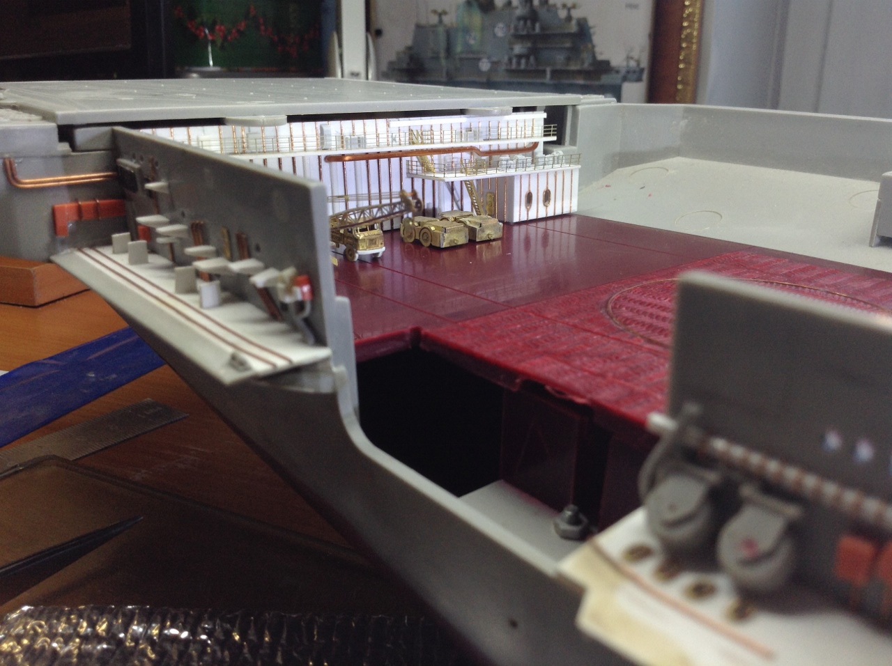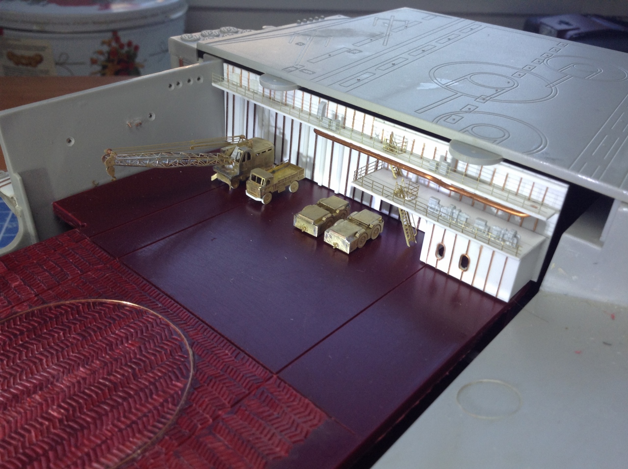 Ангар - будет ВТОРОЙ полностью ОКрашенной деталью но после изготовления переборок .Планирую его сделать "под ключ " с полным наполнением.самолетами вертолетами и автомобилями..То есть ангар- это своеобразный БЛОК- который можно будет вставить в модель на любом финишном этапе. Который я в данное время и работаю. ("шлея под хвост попала"-сделать именно сейчас ангар, хотя "по плану" было завершить работы с Левым бортом и "разобраться" с иллюминаторами.