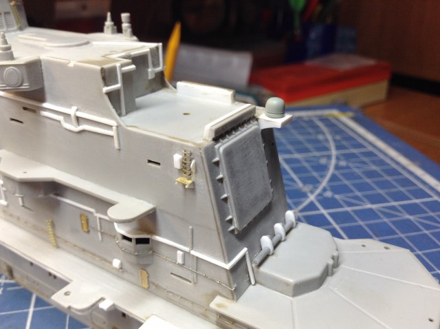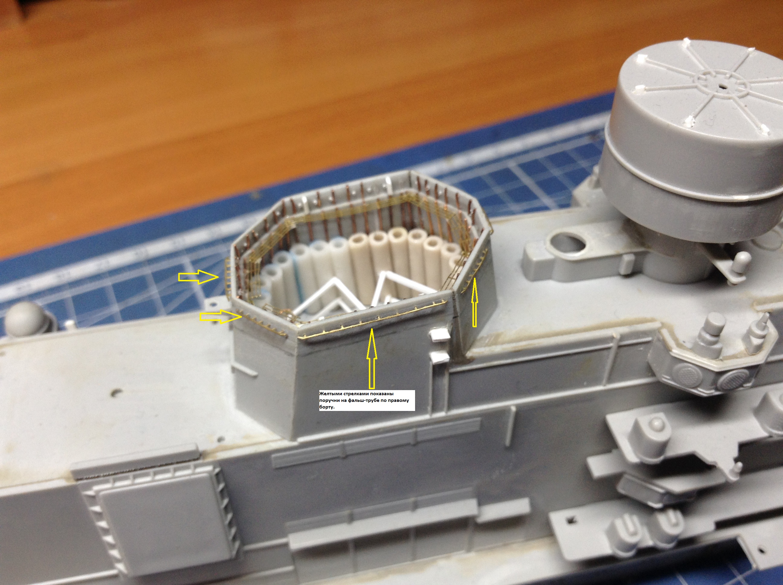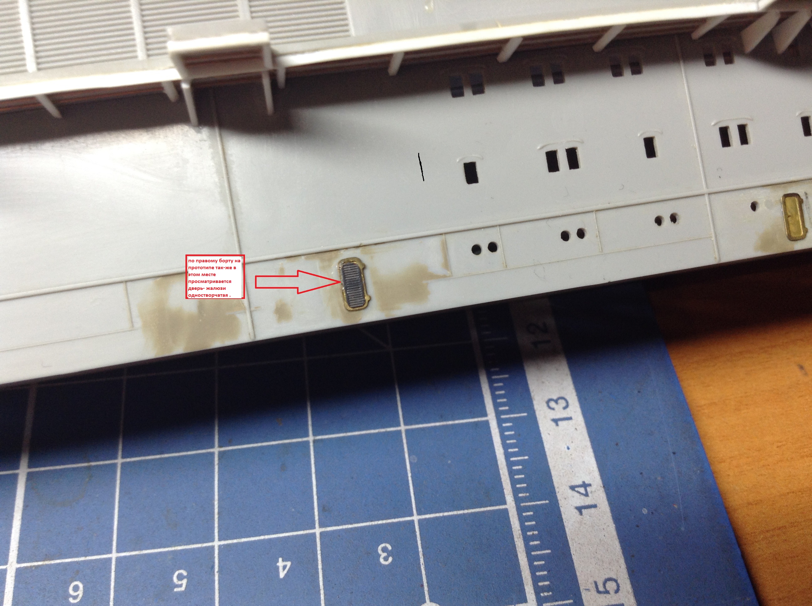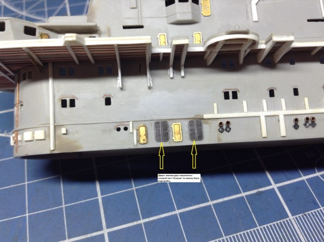 а далее "разогнавшись" "восстановил справедливость" и на левом борту надстройки и приклеил лючки-жалюзи оставшиеся "без внимания со стороны товарищей" от фирмы "Trumpeter" На фото все показано стрелками и пояснительным текстом к ним- и добавлю фото "самого"- где данные "лючки- жалюзи"хорошо видны.