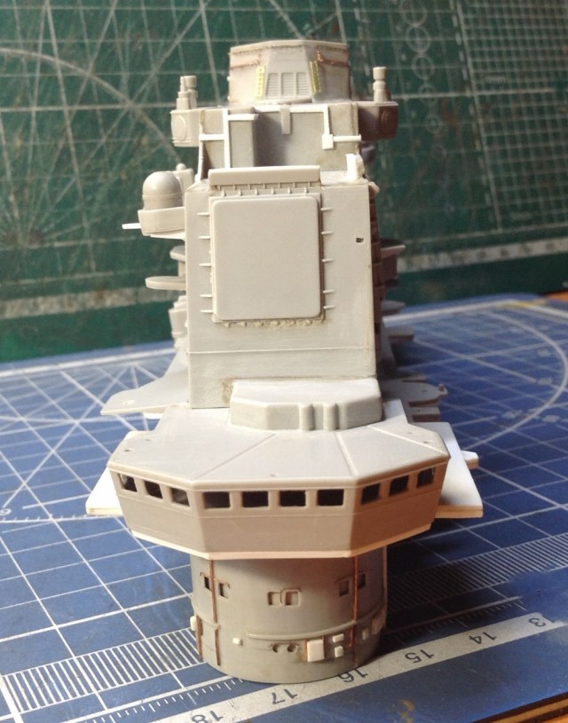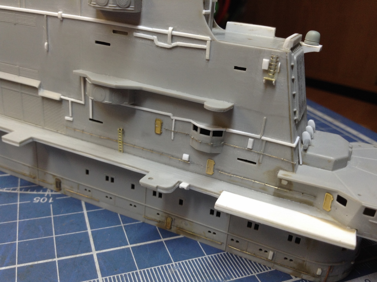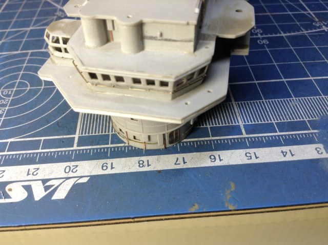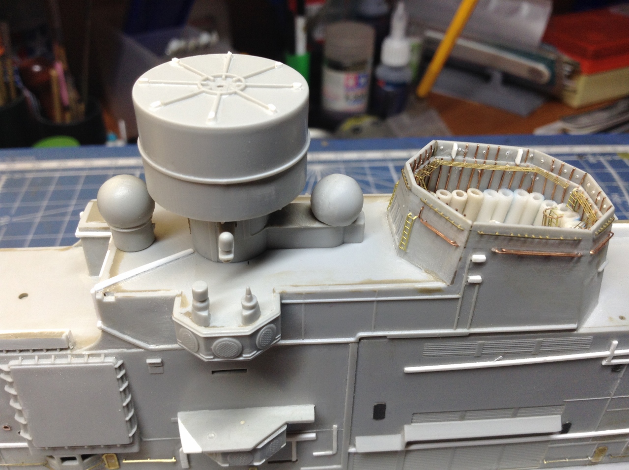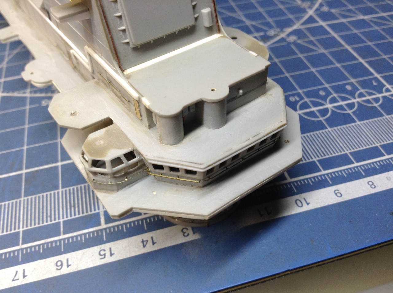 За два дня "упорной "работы над " островом"кроме "проступей" на дымовой трубе и вертикальных трапов "до этих самых проступей" удалось сделать на носовой оконечности "острова" "кабель- каналы" на выгородке по правому борту и на лобовой переборке что расположена выше "Марс - Пассата" .