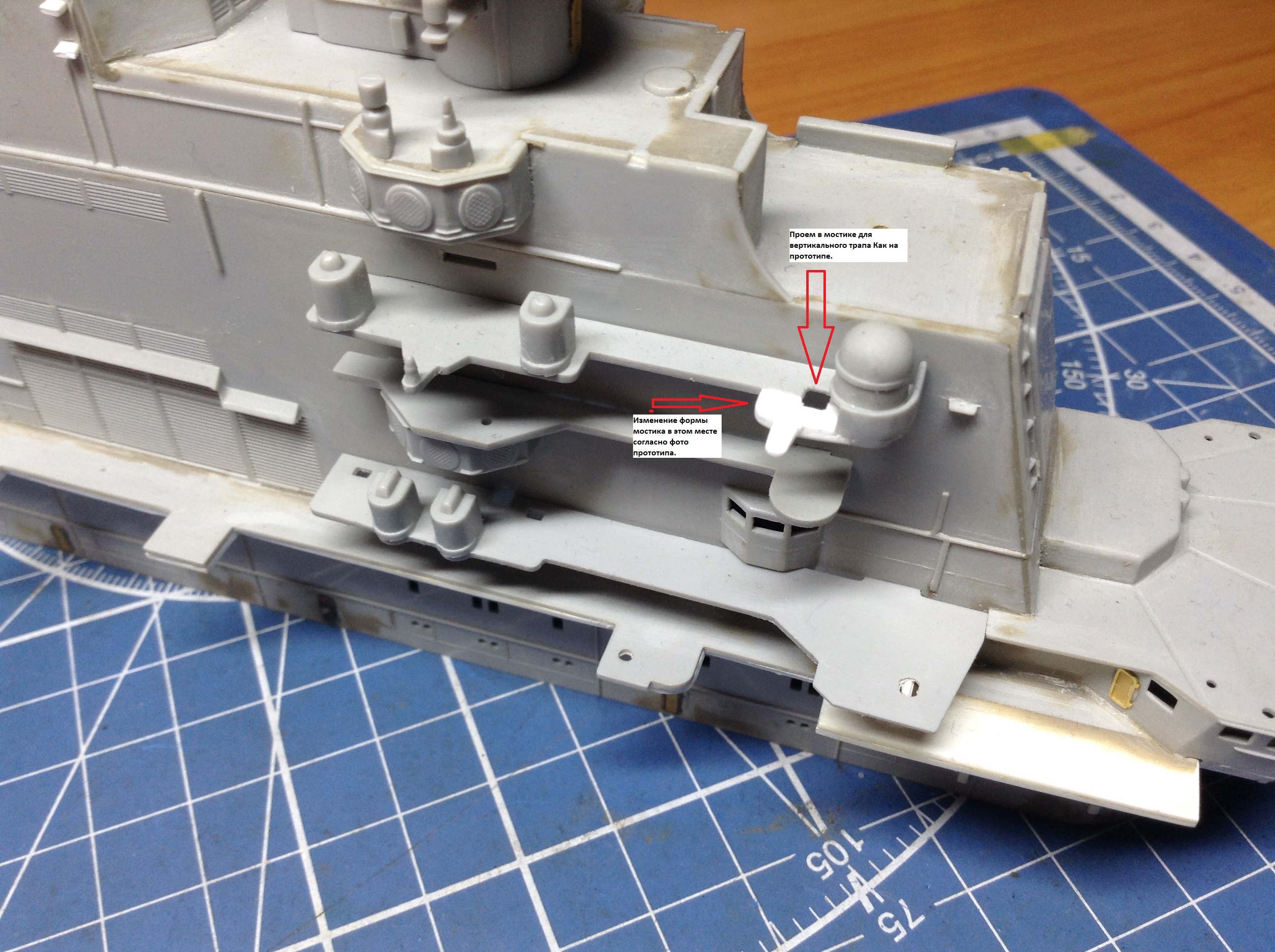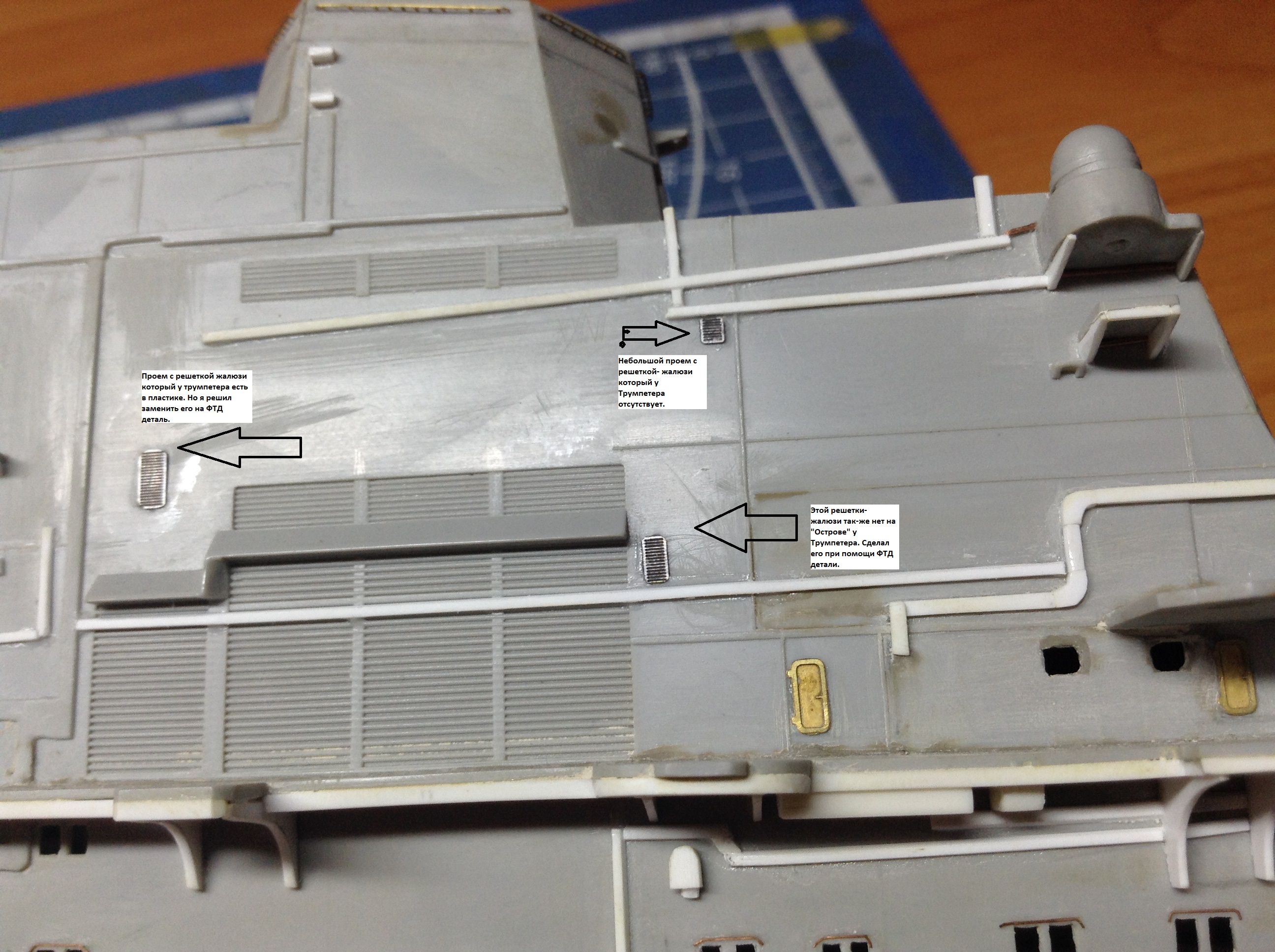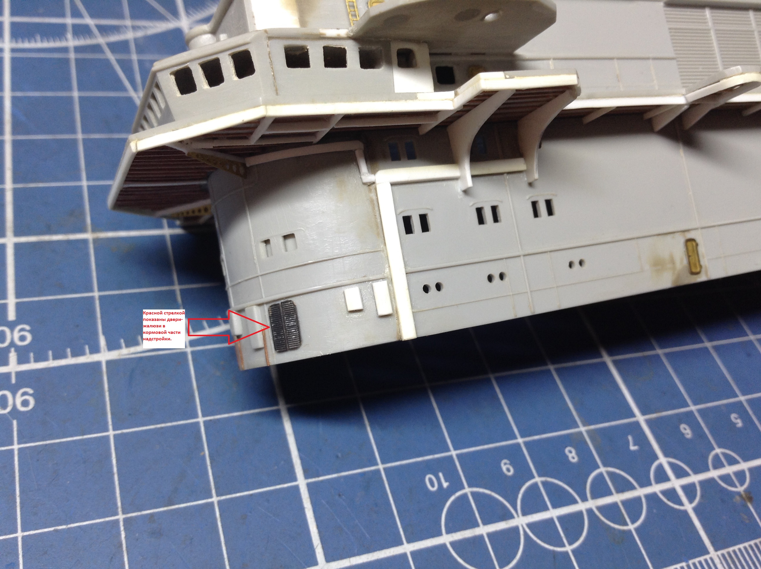 http://scalemodels.ru/articles/13244-Trumpeter-1-350-tjazhelyjj-avianesushhijj-krejjser-admiral-kuzn... фото взял отсюда. Тут видно. Человек многое указывает. И еще при работе с корпусом первый "балкон", перед трамплином тоже нужно будет переделывать форму. В сети не видел, чтобы ктото замечал этот недостаток. При чем с обеих сторон.