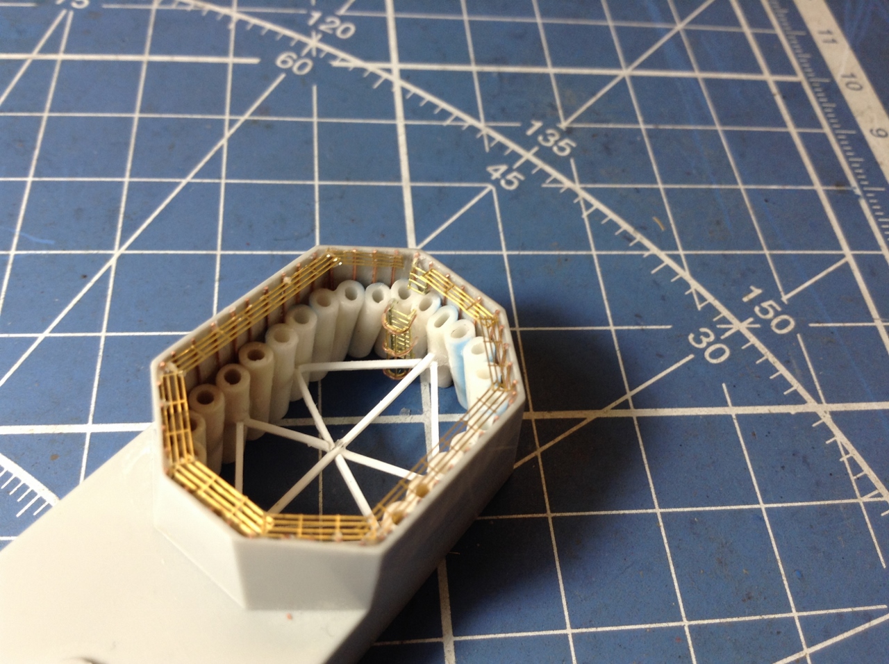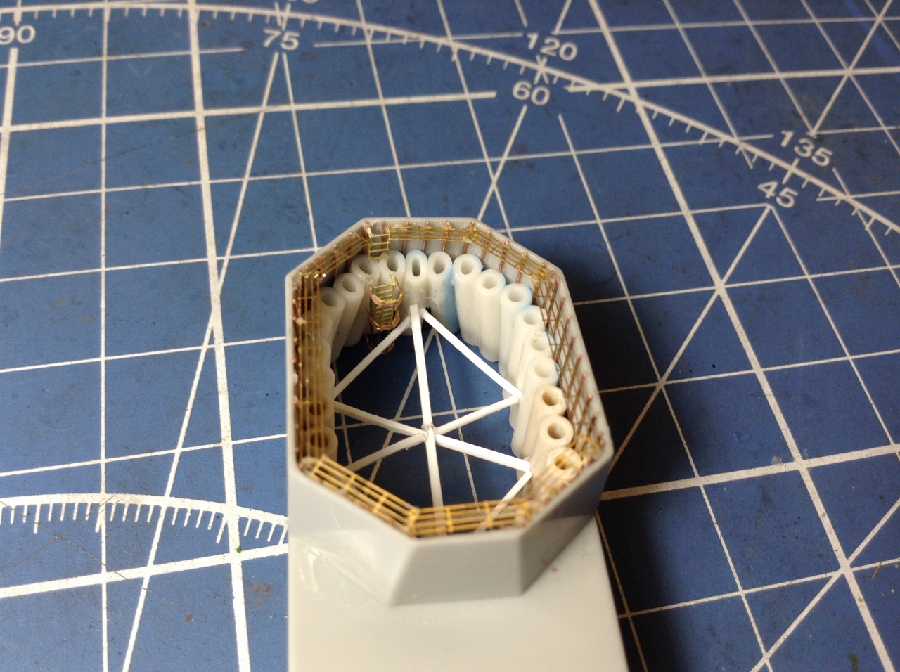 ) И теперь уже можно считать работу по Дымовой трубе законченной. Да на нее ещё нужно приклеить фермы мачты -но эти детали уже ЕСТЬ в наборе ФТД от "Микродизайн" и "самоделом" их изготавливать не придется! Данное ФТД будет устанавливаться на стенки дымовой трубы почти на финишных работах -иначе их можно просто измять и поломать. Ведь ещё какое-то время придется "вертеть в руках" весь "остров" доделывая на переборках "острова" те или иные элементы. О целесообразности воспроизведения которых я ещё пока не решил! Это относится к бортовым поручням на продольном мостике и мостике второго яруса. (да "дофига" там , на "острове" этих самых поручней" . А так-же на прототипе видны различные трубопроводы и... много ещё чего что "украсило -бы" модель если стремиться все это воспроизвести основываясь на фото прототипа!.