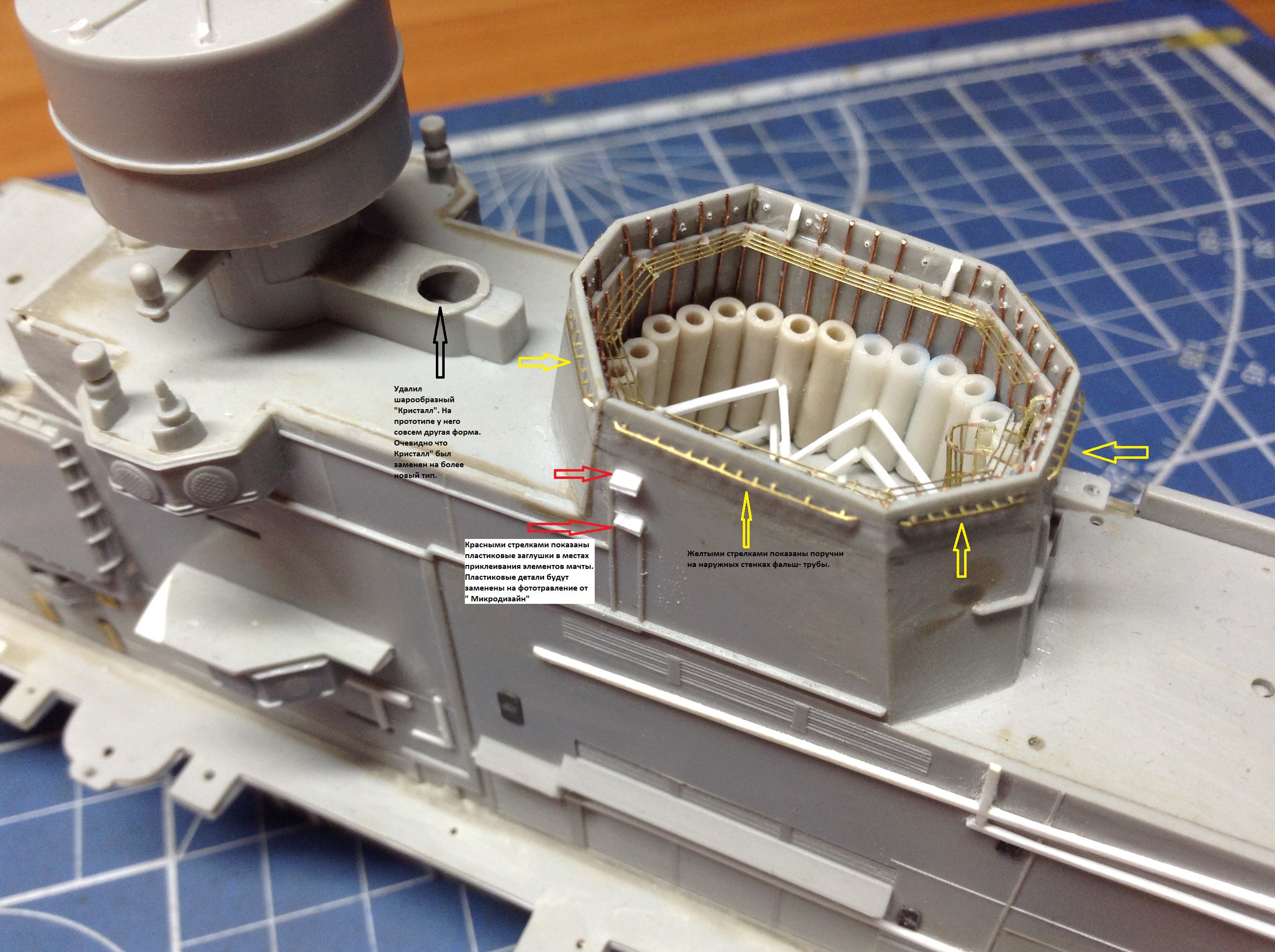 Ну так продолжу пожалуй с того что на дымовой трубе сделал из обрезков лееров для 700-го масштаба ПОРУЧНИ по верхней части наружной обшивки фальш- трубы. Так-же на месте где за "Резистор М" у Трумпетера дан шарообразный "Кристалл" появилась дыра по той причине что на тот временной период что я строю модель форма этих "Кристаллов" уже была совершенно не шарообразной а в виде цилиндра с о сферической верхней частью.По тому стилю что решил в начале этой "сказки" я фото "прогнал" через "Paint"и стрелочками и надписями к ним все это "безобразие№ подписал и обозначил. Так что смотрите(кому интересно) и фото ,на них всё что делал, "расписано".Не совсем уверен, что это удобный вариант рассказа о стройке- но думаю, пока без пояснительных стрелочек с надписями не обойтись.