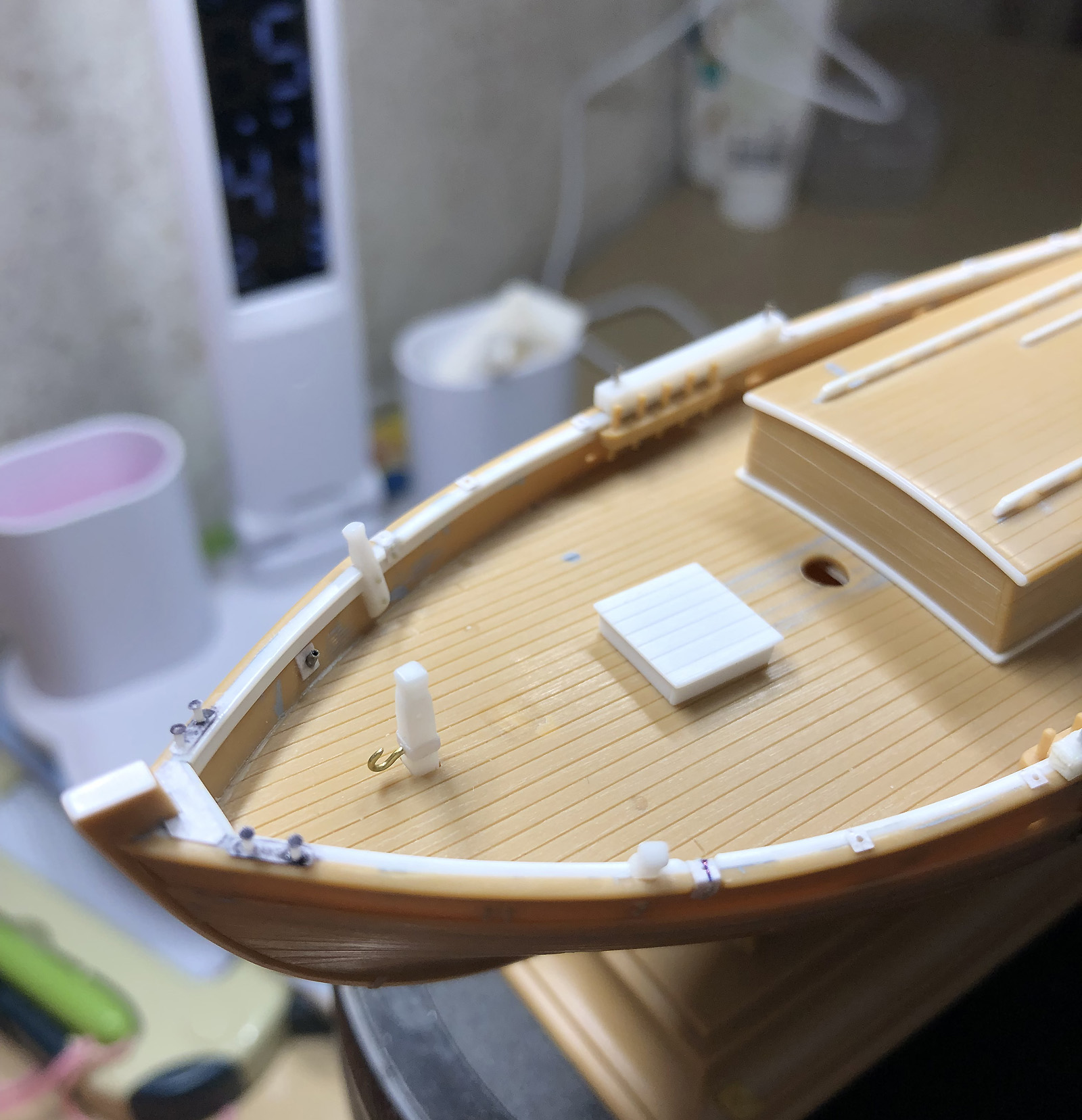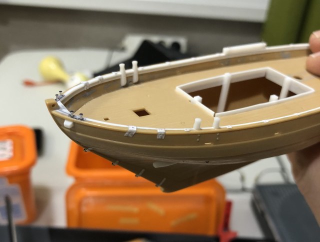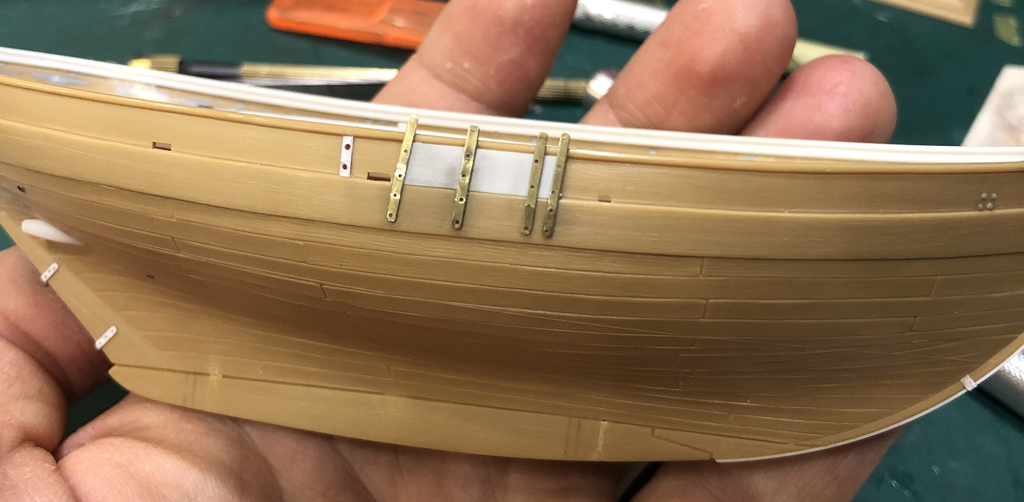 Накладки, а точнее основания леерных стоек готовы (бумага, пропитанная цианокрилатом), так же доработал планширь в местах установки скоб.