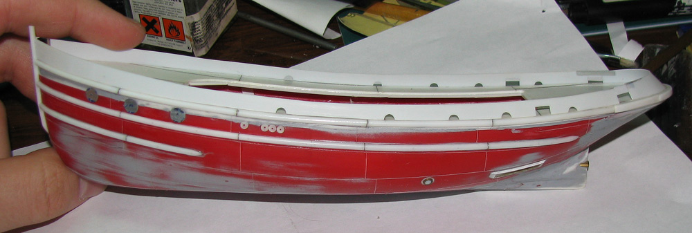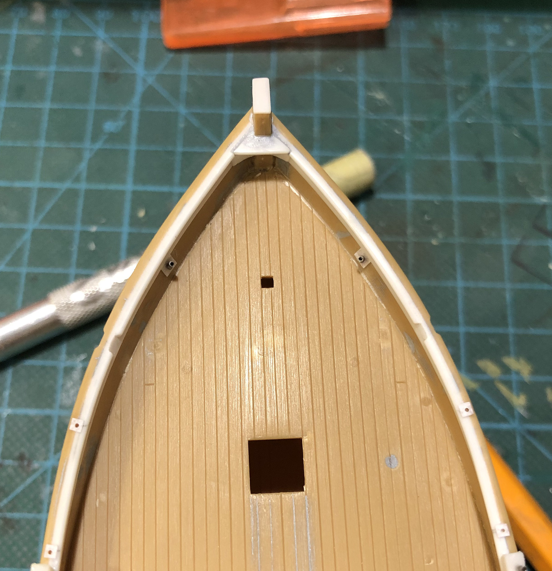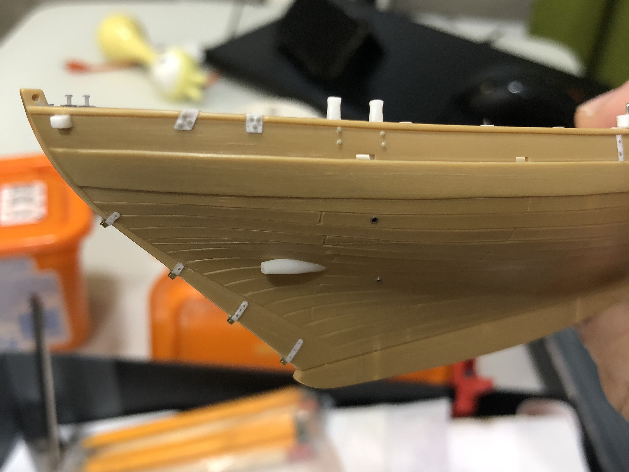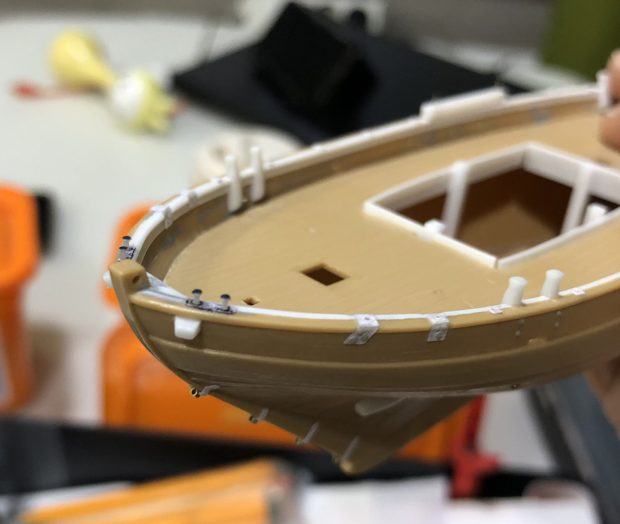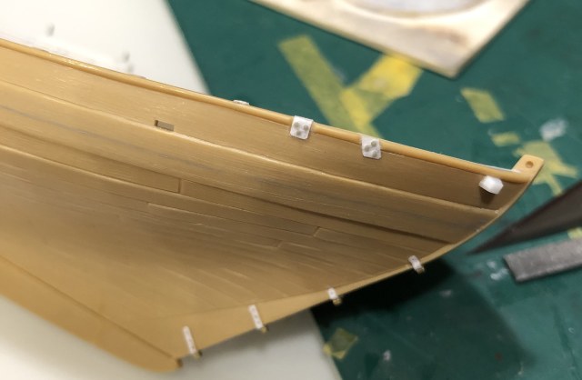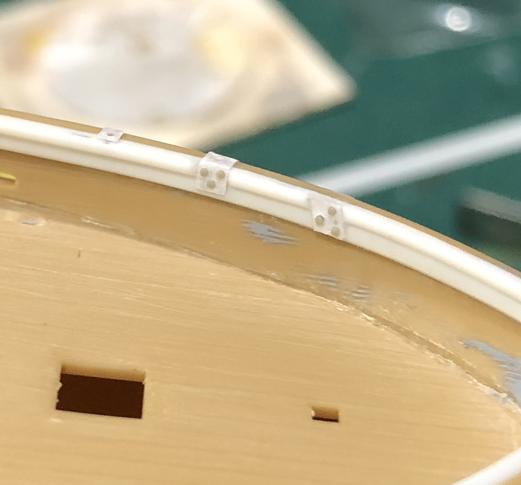 их сложно нормально рассмотреть, так как после приклейки к планширю оснований я их прокрасил черным маркером, потом шкурил, снова красил и снова шкурил. По итогу - вот этот размазанный цвет с непонятными границами. Всё проявится и обретет четкие границы только после грунтовки
