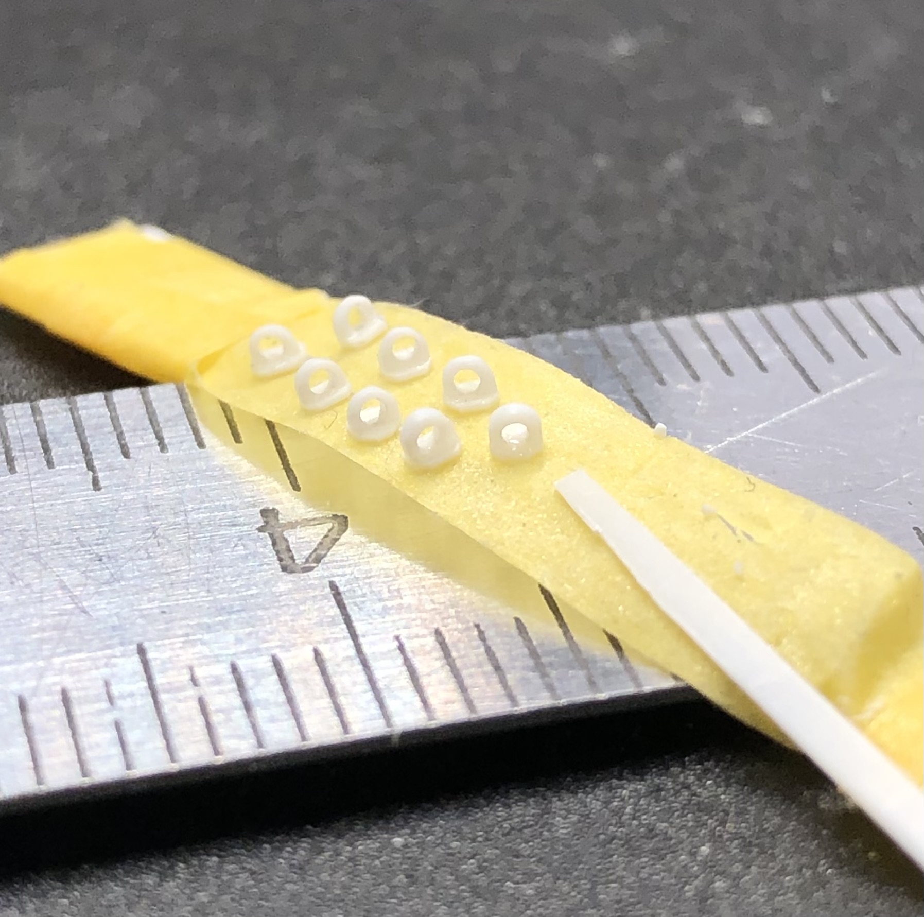 Соорудил скобы с "заклепками", которые мне всю кровь выпили. Так противно в этой модели еще ни одна операция не проходила. Обычно я ставлю заклепки без каких-либо проблем, но тут пришлось обрезать ножки до длины 0,5мм и вот эти мини-грибочки так неохотно вставали на свои места, что на 3 смонтированные заклепки иногда уходило по 10 заготовок. Ошибкой было решение закладывать клей в просверленное отверстие перед монтажом заклепки. На последнем этапе до меня дошло, что нужно ставить заклепки на сухую и подавать жидкий клей снаружи, убирая потом его излишки. Последние 6 заклепок встали, как родные, а вот все предыдущие - боль и страдание