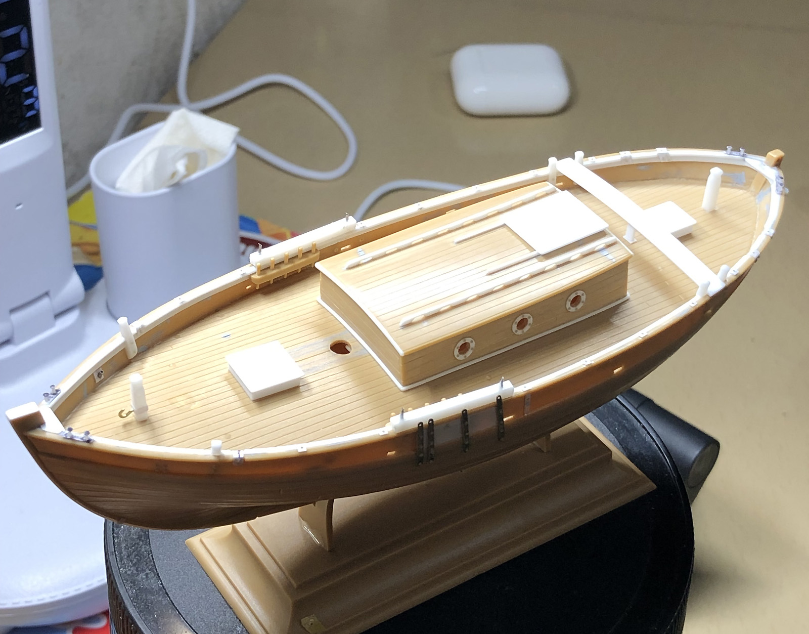Буксир забросил, я думаю. в том числе и потому, что подход был какой-то раздолбайский. Делал-делал, потом переключился на другое что-то, с другого переключился на что-то еще - так и остался буксир в недоделках. Хотя там готовность весьма внушительная - корпус на 95% (все основные работы сделаны, не хватает только пары десятков рымов для крепления всякой навесной утвари), всё палубное хозяйство готово на 100%, часть рубочных элементов тоже. Нет только надстройки с рубкой. Ну т.е. бери, да доделывай, что собственно и входит в мои планы.