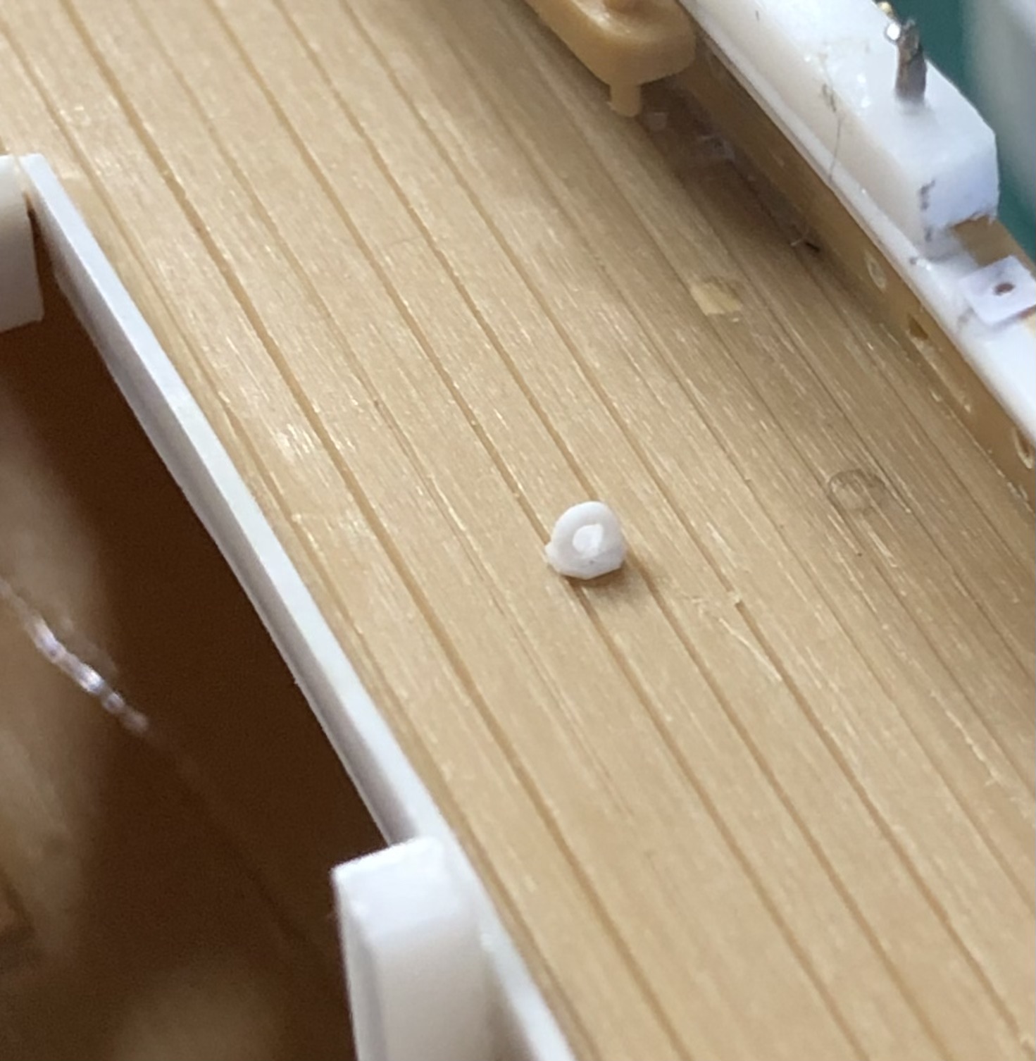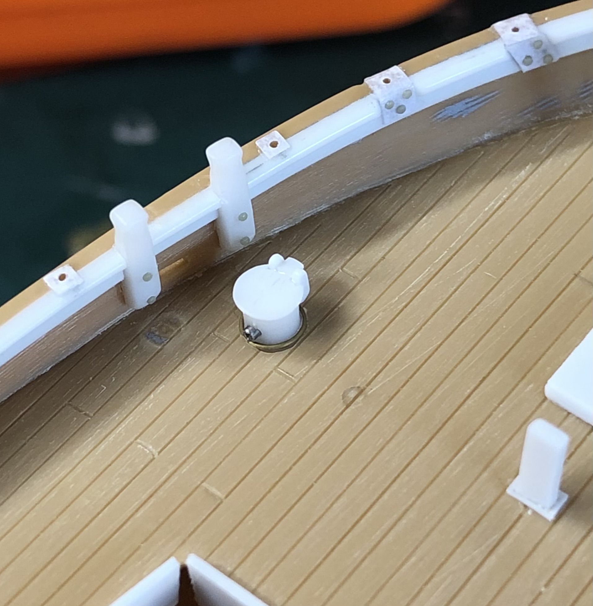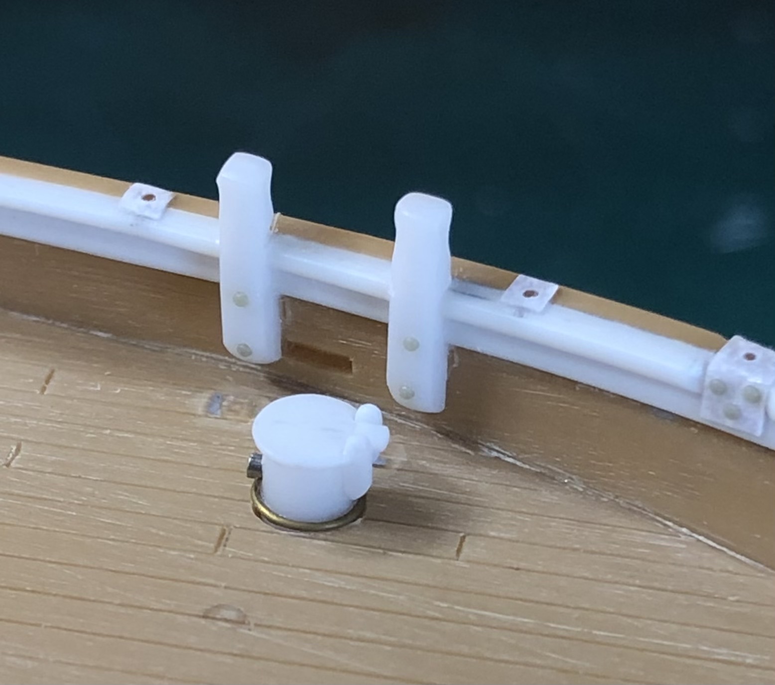В итоге сначала клеил на планширь основание кнехта, потом сверлил в нем отверстия одинаковой глубины и потом вклеивал "гвоздики". Материал - тянутый литник и бумага. Длина кнехта около 5 мм, диаметр "гвоздика" 0,5
