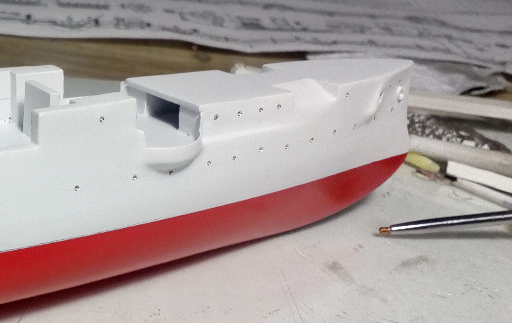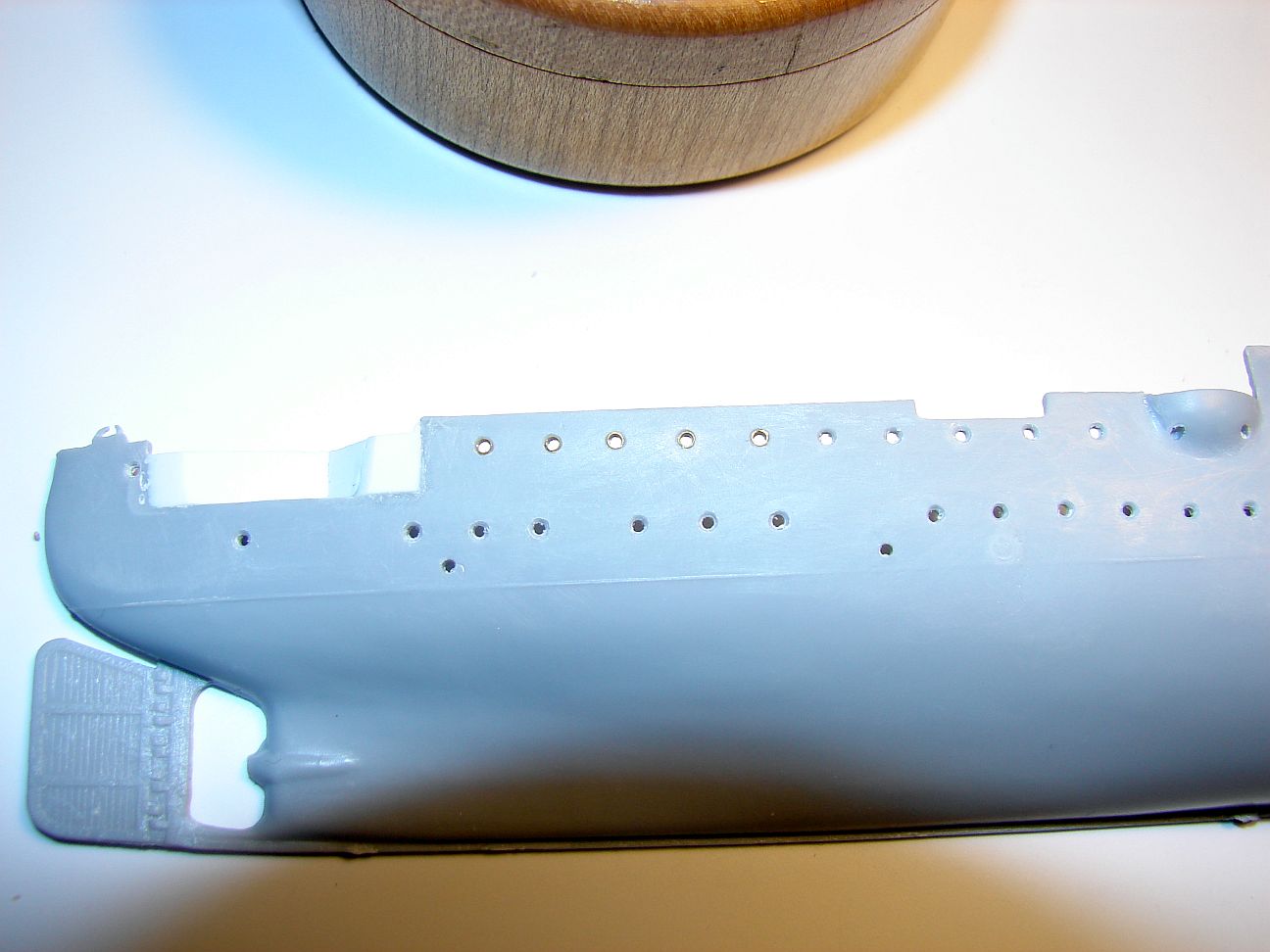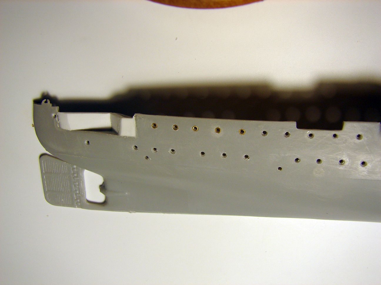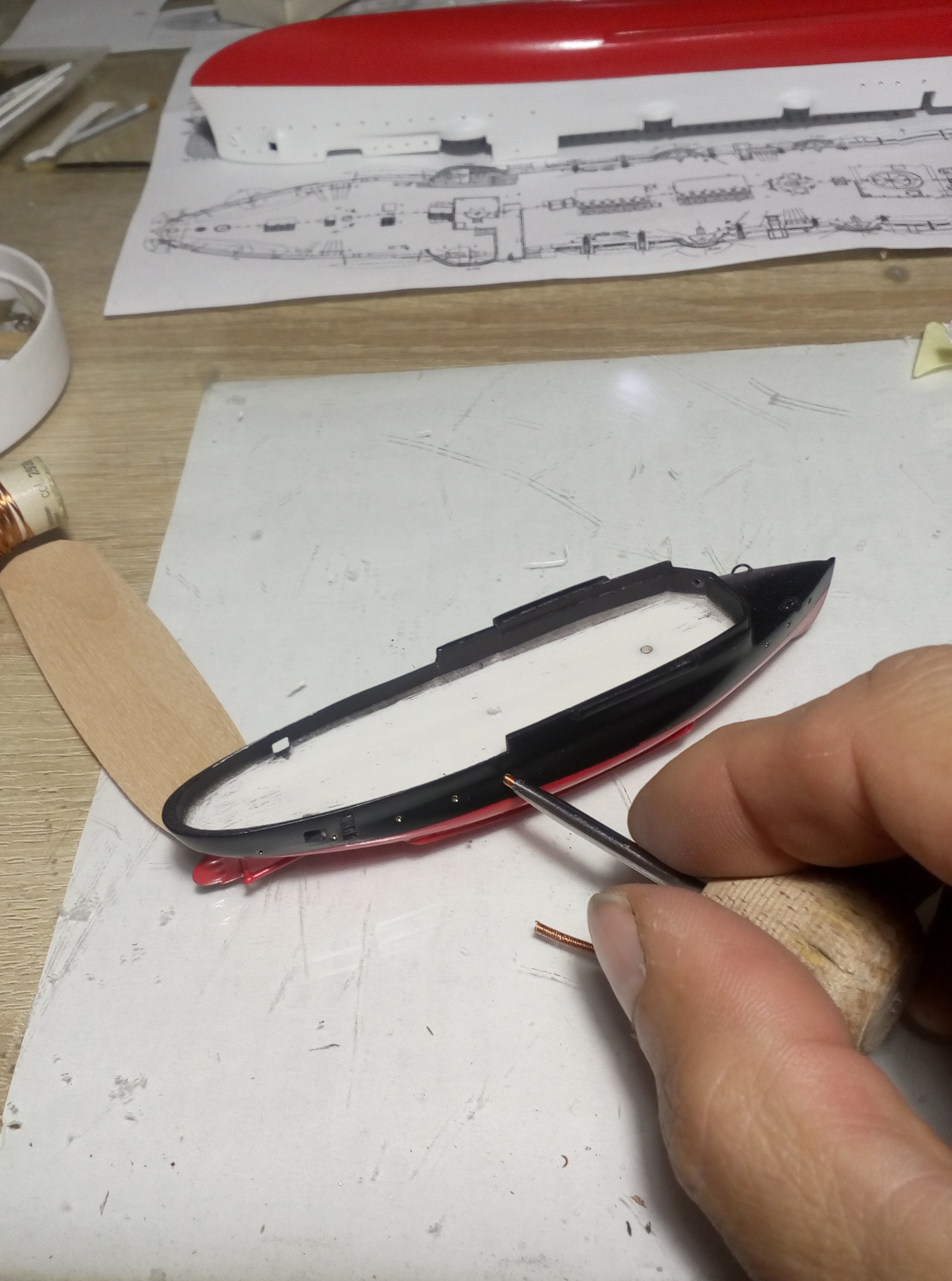 Я вставляю в борт не 1 колечко, а 3мм свитую пружинку, (если бы была трубка то ее конечно лучше для иллюминаторов использовать), затем проклеиваю цианопаном , после высыхания немного шлифую полученный ряд иллюминаторов с последующим их рассверливанием. вот так выглядит на модели. Наименьший диаметр делал 0,6мм.