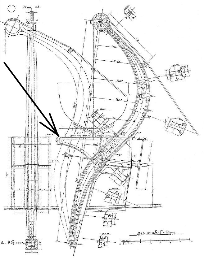 Итак, как я их называю, станины шлюпбалок. Вопрос сразу – откель такой “клювик” взялся? На чертеже его нет, на фото его нет (по крайней мере я не вижу ни в упор ни в …в другом месте). Думаю, единственно это может быть связано только с положением при спуске-подъёме катеров.