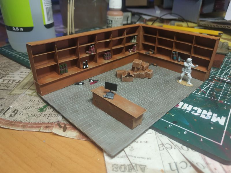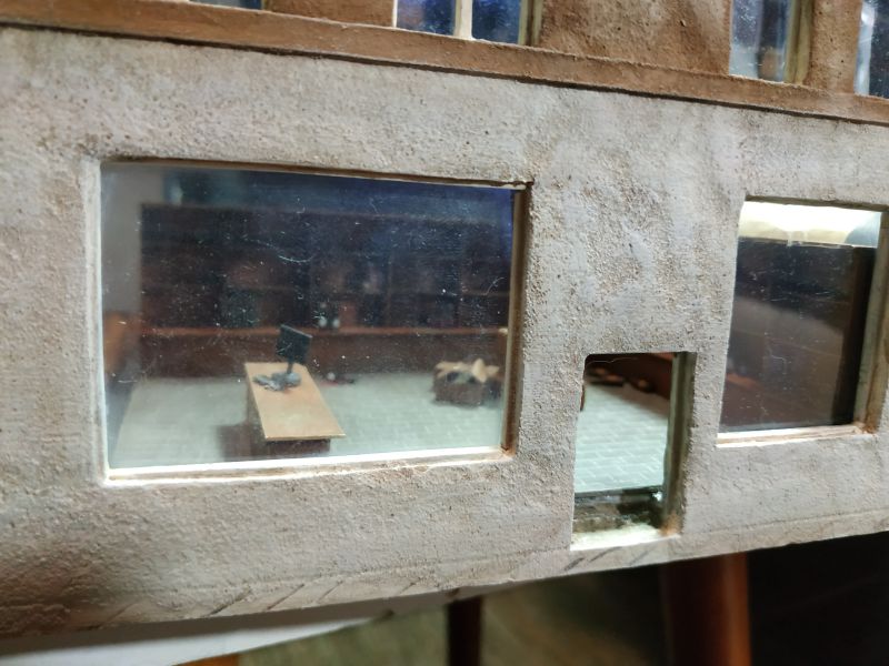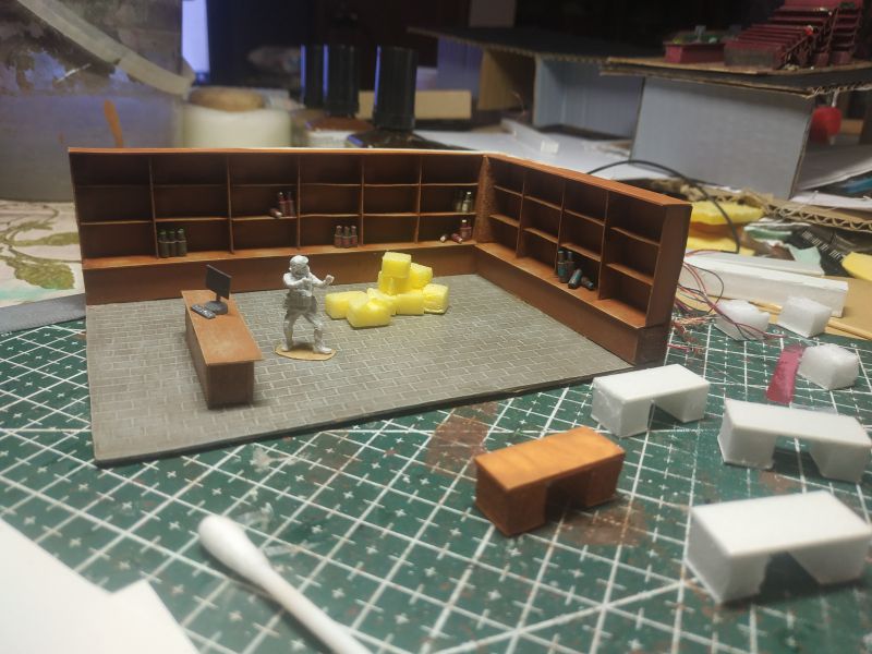 В торце дома будет аптека. Так как окна широкие, а внутри освещение не планирую, все равно будет внутренность видно снаружи. Решил сделать внутренний интерьер. И для остальных магазинов тоже буду делать.