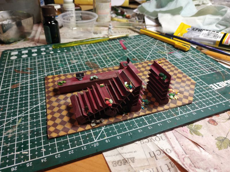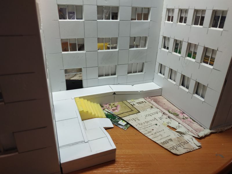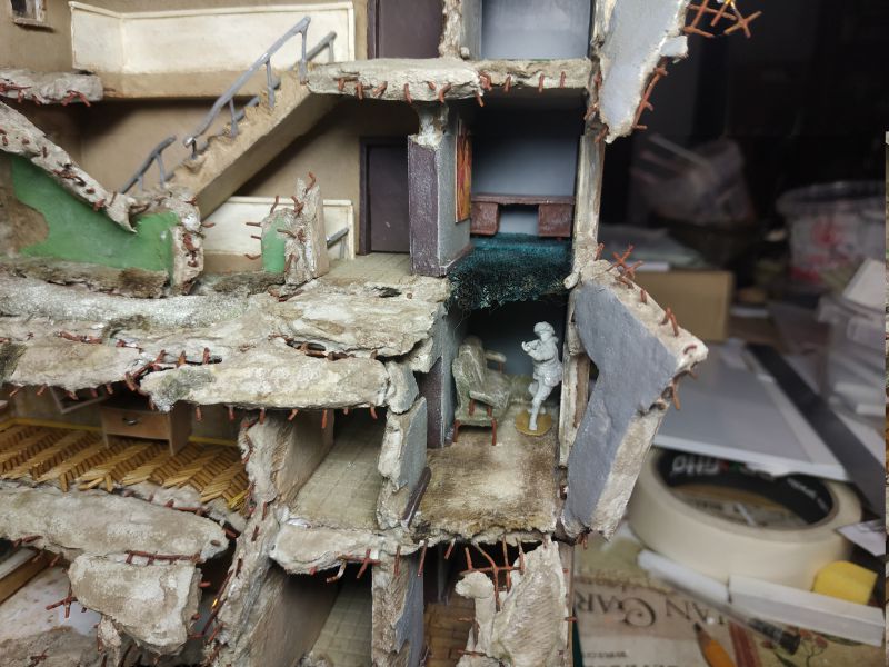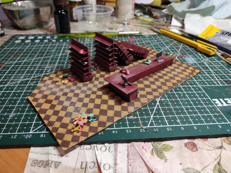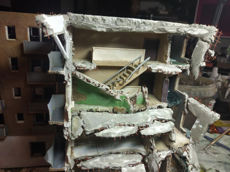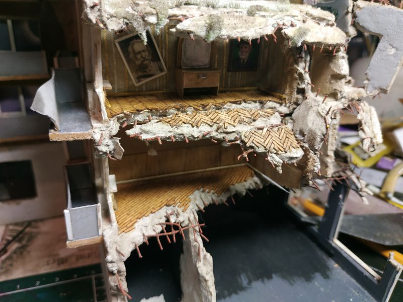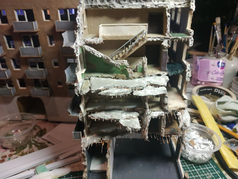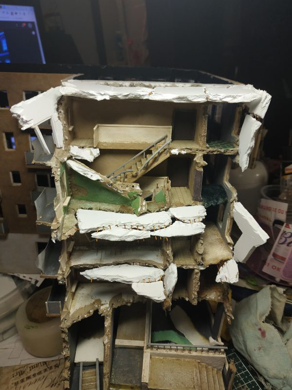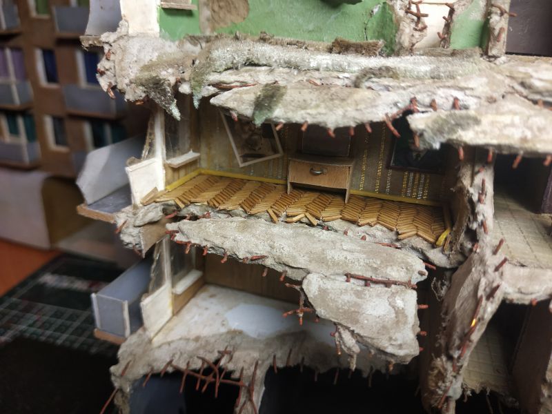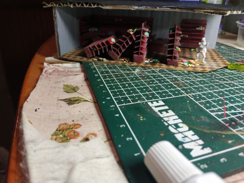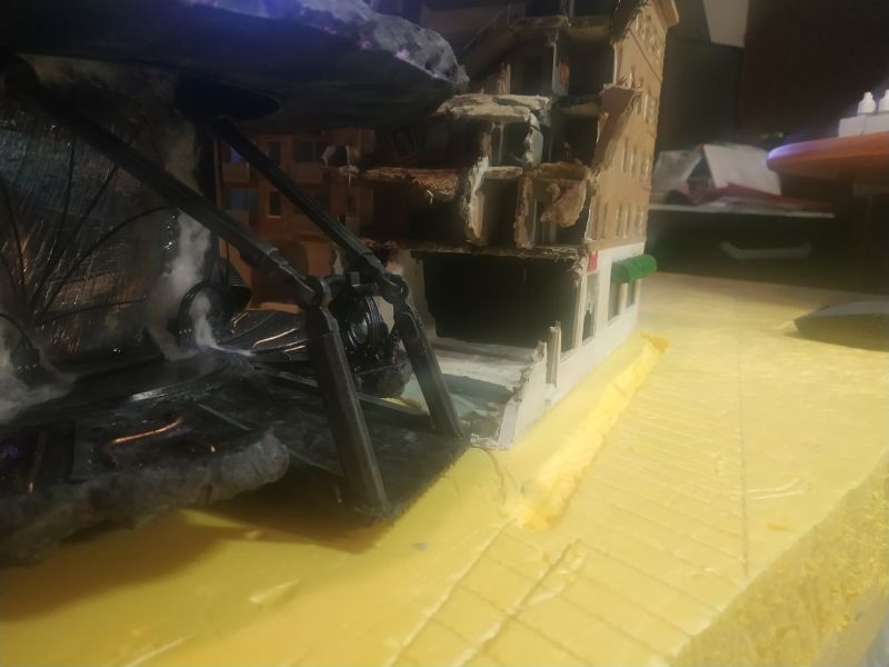 Примерил разрушенный дом и то что его разрушило. Склеил основу для мусора вокруг дома и корабля. Приступаю к следующему домику.