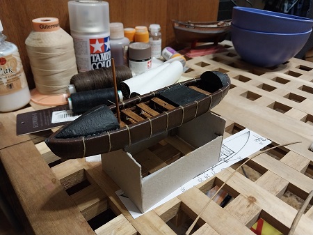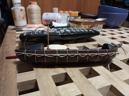 "Дратва для сшивания кож была скручена вручную из 14 прядей и пропитана смесью из шерстяного воска, пчелиного воска и смолы, так что она плотно закупоривала дырочки от шила. Шорник Джон О'Коннел и седельщик Эдди Хинтон предложили наиболее подходящий метод сшивания кож. По центральной линии корпуса мы применили сдвоенный шов, в остальных местах - двуручный: два человека работали попарно, размещаясь друг против друга с двух сторон сшиваемых кож. Средняя длина стежков была около сантиметра. Параллельно первому шву, примерно в 2 см шел второй; ширина напуска - около 5 см. Учитывая, что на носовую секцию придется особенно большая нагрузка от столкновения и задевания грунта, Джон О'Коннел для прочности сшил кожи в четыре слоя. Удвоили мы толщину обшивки и на корме, чтобы не пострадала при вытаскивании лодки на берег кормой вперед."