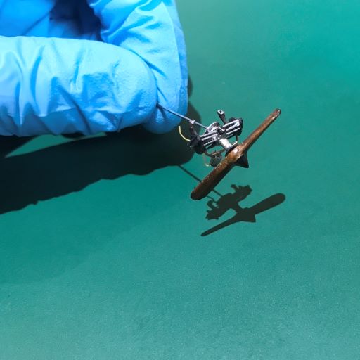 Выточен из-под палочки от мороженого. Тонирован водорастворимой морилкой (светло-коричневый №16). Для "живости" подрисовал прожилок. Далее задул аэрозольным яхтным лаком "KUDO durable matt coating". Своеобразный обтекатель (или кок) изготовлен из обточенного по форме конуса тянутого литника. Длина винта (м1\72) : 26 мм.