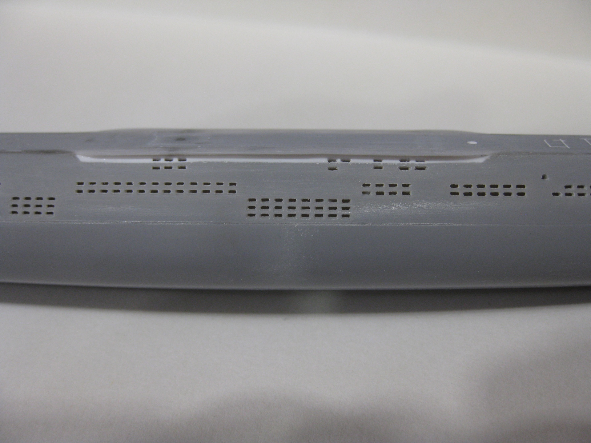 Поработал с одной половинкой, довырезал шпигаты. Разрезал детальку верха "жопки", приклеил на свое место и вырезал шпигаты, которые должны быть, но не даны изначально. Также в районе рубки вклеил полосу пластика, прошпаклевал, зашкурил и вырезал недостающие шпигаты. В носовой части вырезал недостающие шпигаты и "убрал" щиты ТА. Буду делать без них.