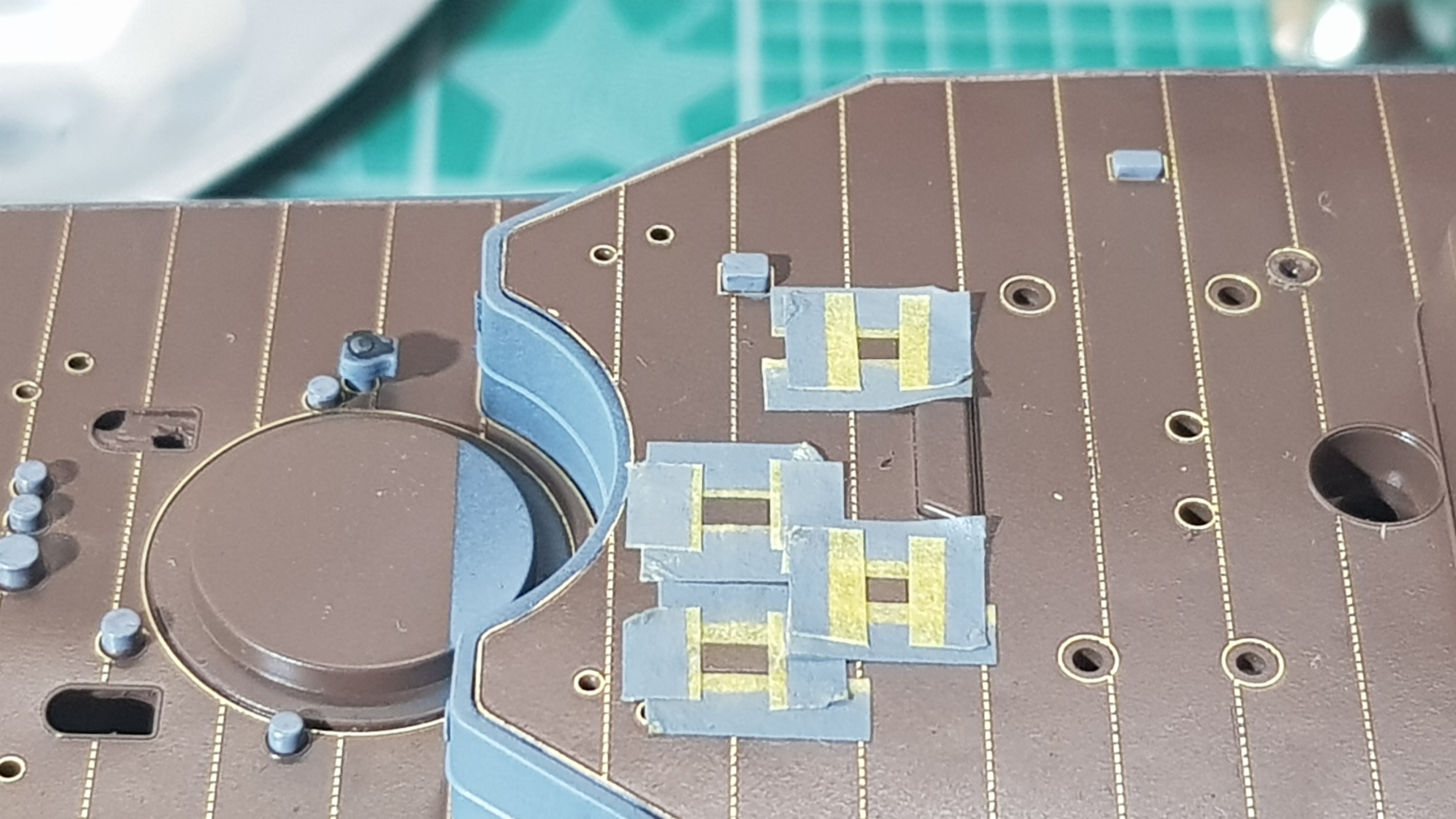 Вот такая делема. На центральной палубе есть места под что то. По фото из книги, которыми любезно поделился Дмитрий Кочегура, выяснилось что там должны быть люки с комингсом. Самое интересное. В пластике они были. Я не помню, но по инструкции Тамии там есть какие то кубики. Час перебирал травло и не нашел ни чего на это место(( и люков подходящих нет. В общем решил просто покрасить это дело. Ну, а если найдется что подходящее, установлю.