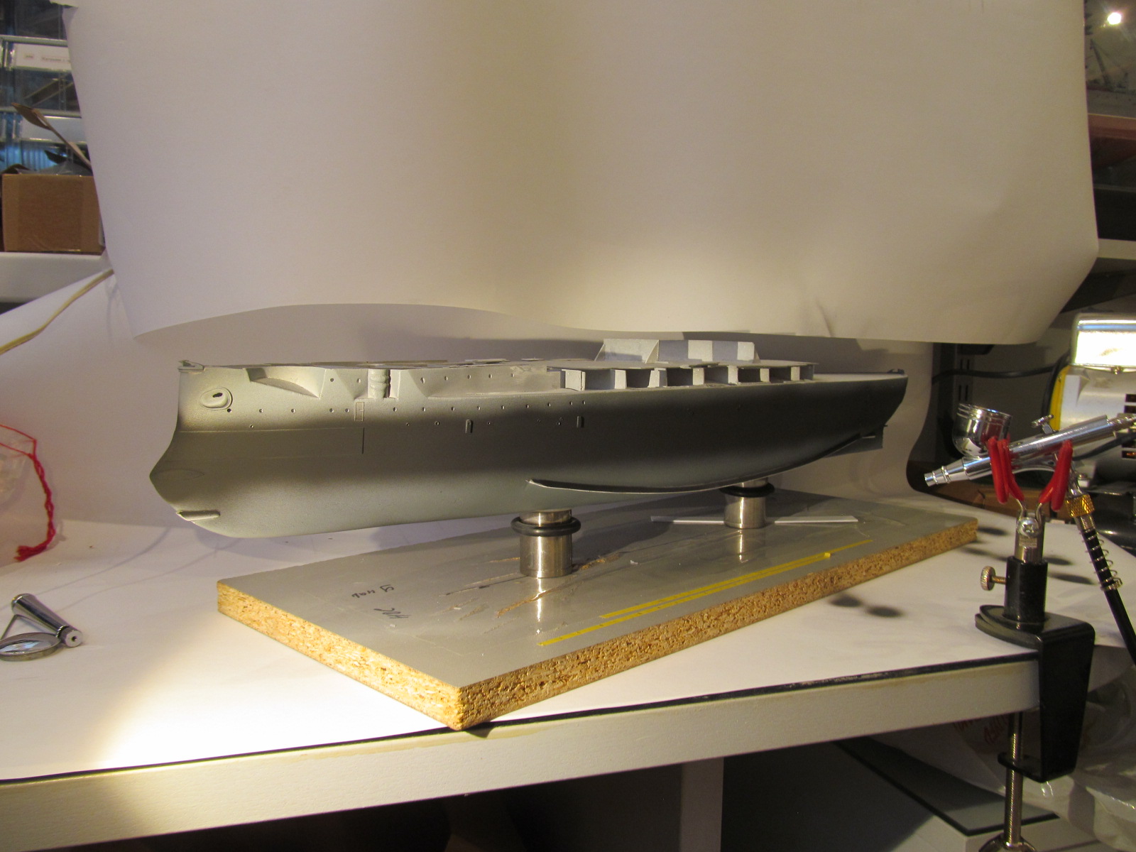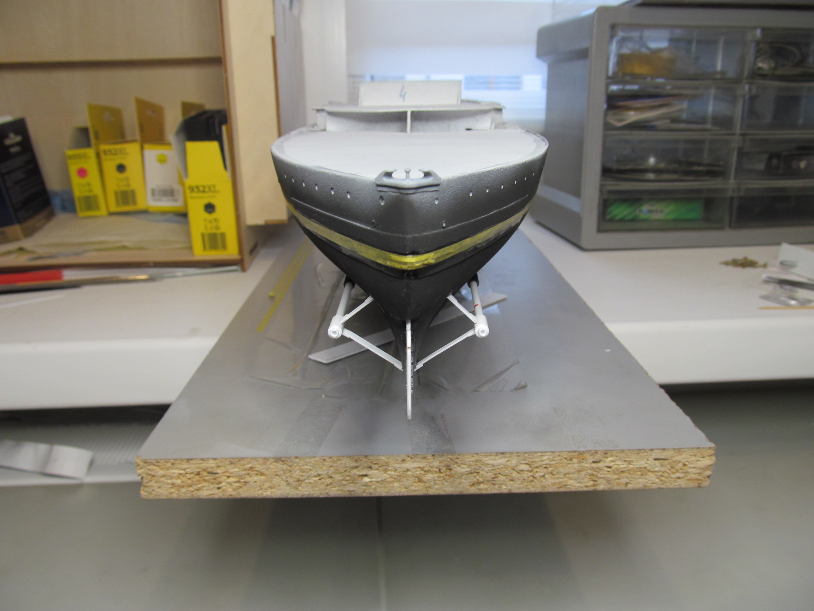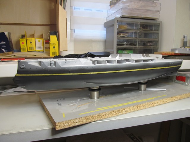да вроде ничего покрашено. мне нравится. тоже скоро предстоит красить низ корпуса своего Варяга, а затем и верх. Тоже думаю как избежать попадания краски под маски. когда Бородино красил из баллончика, этого всё же местами не удалось избежать