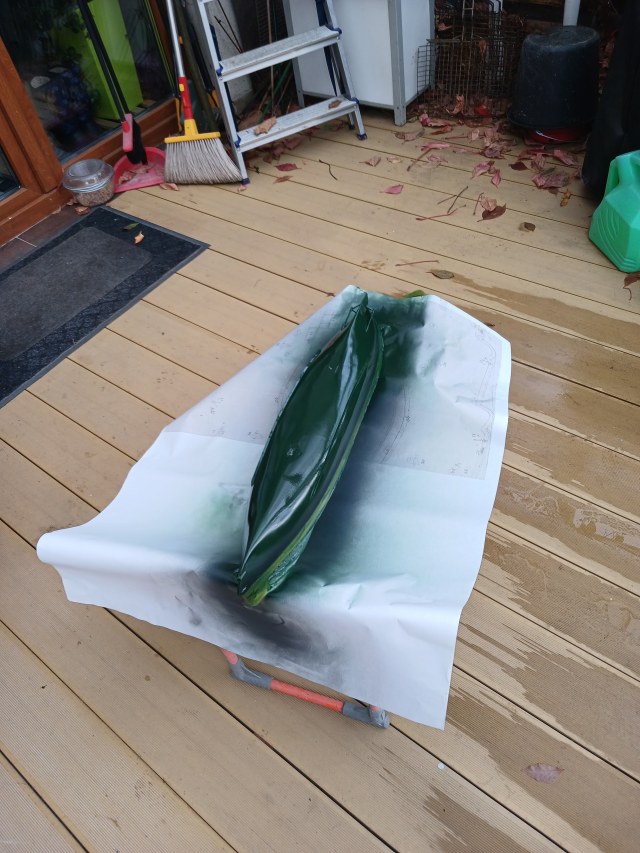 На улице помешал сильный ветер (ну, плохому танцору.....) хотя и погода была тёпленькая, в результате в двух местах произвёл "перелив" красочки, да и с укрывистостью получилось не очень..... теперь сутки ждать, пока всё затвердеет, зачистить "переливы" и второй слой.