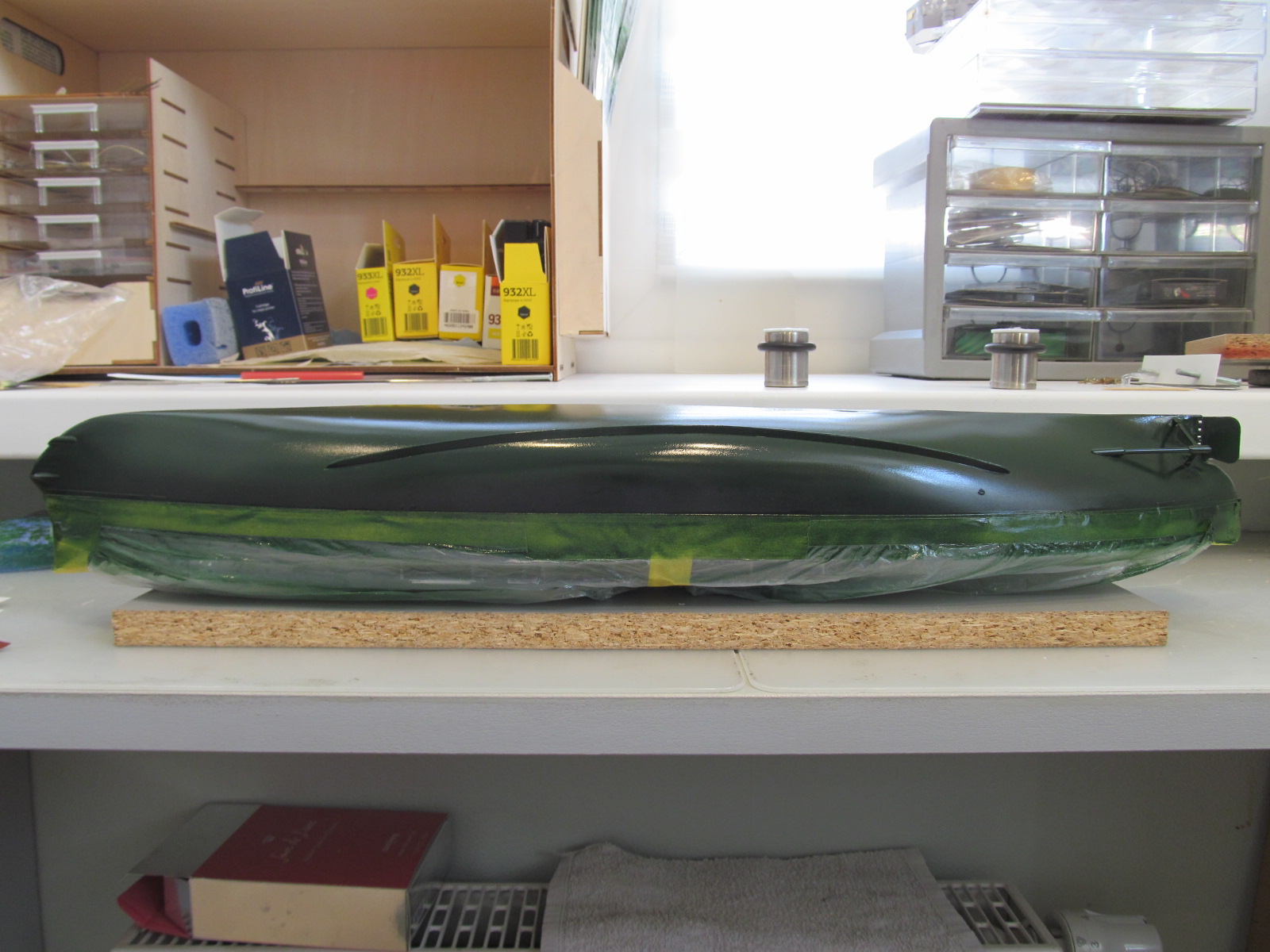 А пока где-то на "балансере" идут горячие споры есть ли жизнь на Марсе красить или не красить, или если красить - то как........ я тихо и спокойно наложил (в хорошем смысле этого слова) масочки на полосу переменных ватерлиний и прошёлся глянцевым лаком по торцам, дабы исключить подтекание краски под масочки.....