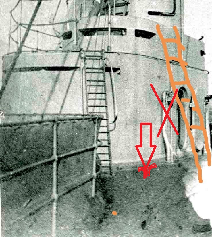 Ух ты, какая интересная фотка, не видел такой. А вот теперь, глядя на эту фото боевой рубки Златоуста, думаю, что фото с морячком сделана все-же да, у боевой рубки Евстафия. Идентичный дв. проем (теперь понятно, почему такая тонкая броня на срезе), сами трапы одной конструкции, идентичны. Кабель-канал или леер для тента одинаково проходят над входом на обоих фото. Ну а трап.., видимо на Евстафии немножко по другому был организован доступ на крышу рубки, вот так, например :