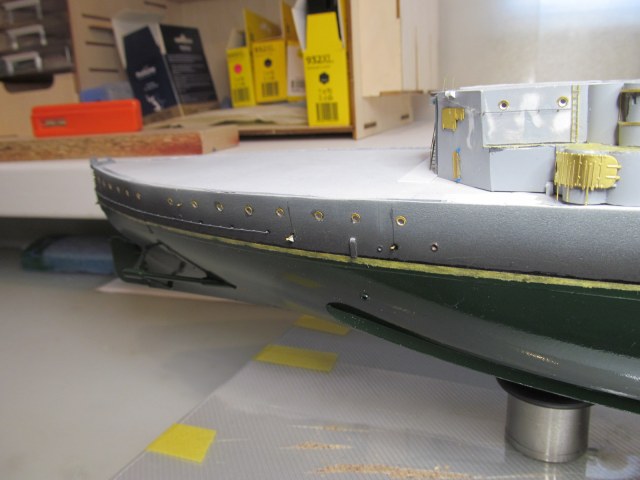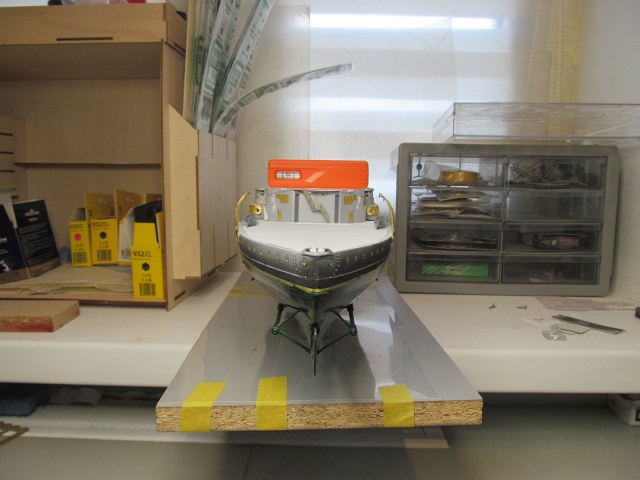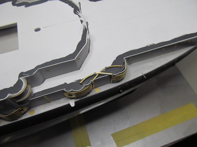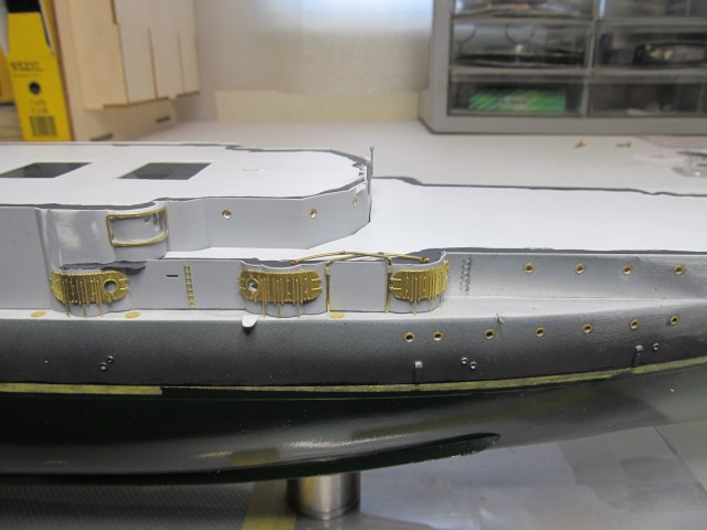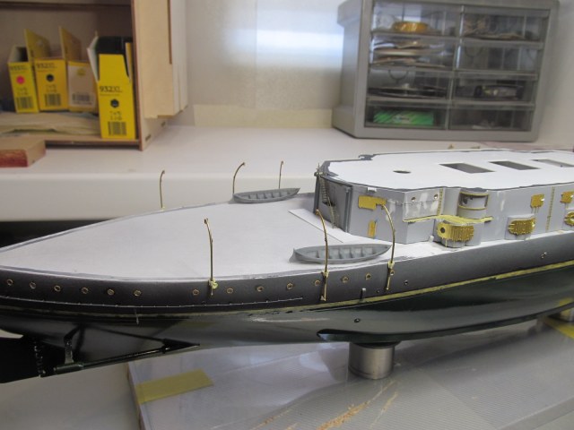 Как по мне, лучше сделать шлюп-балки в рабочем положении. Это придаст объём и зрелищность модели, позволит показать шлюпки, оживит довольно скучную палубу. Шлюпбалки это всегда красиво. А ещё решит проблему с леерным ограждением, ведь теперь, при сложенных шлюп-балках, установка и подавно окраска леерного ограждения значительно усложнятся.