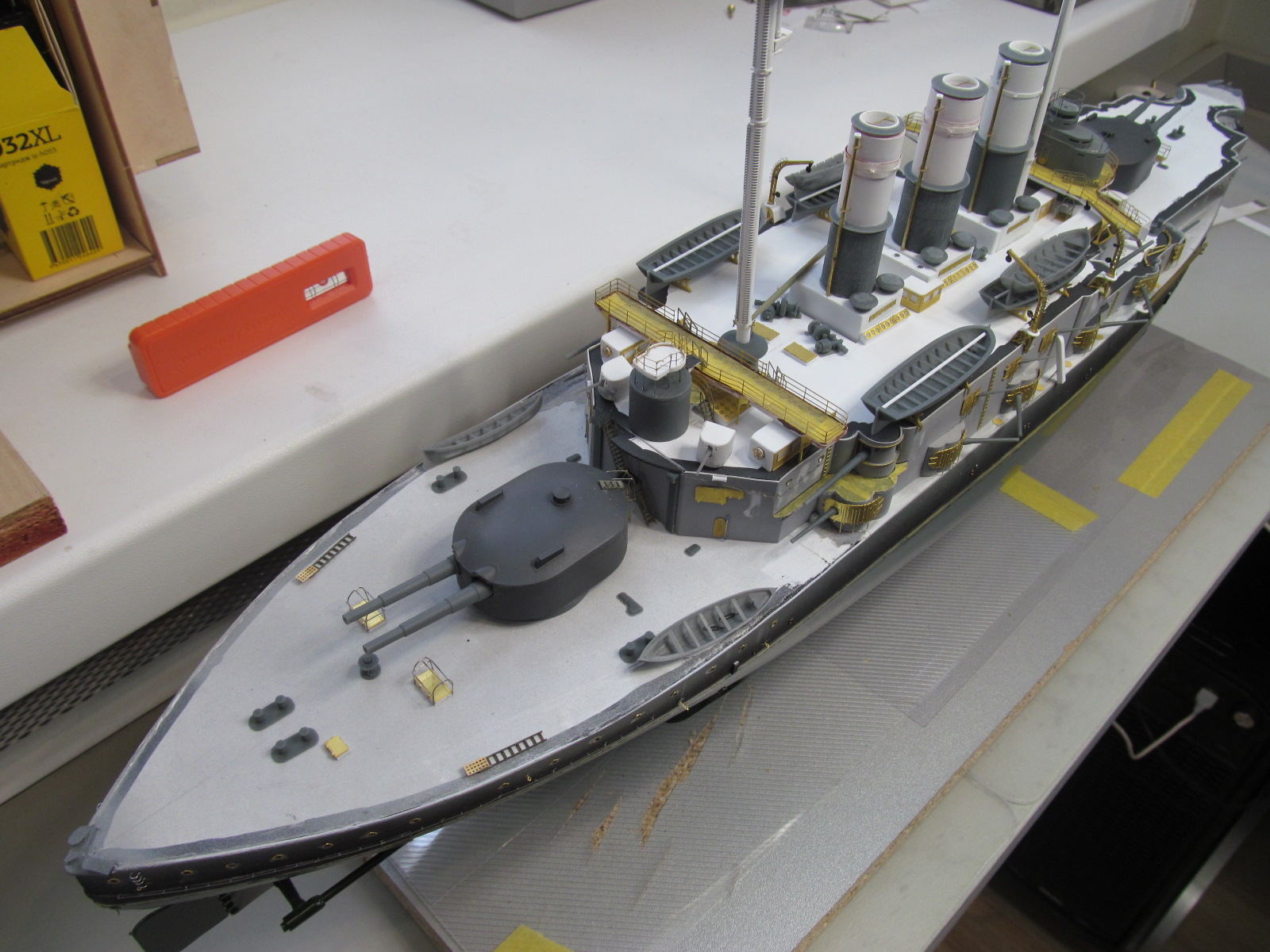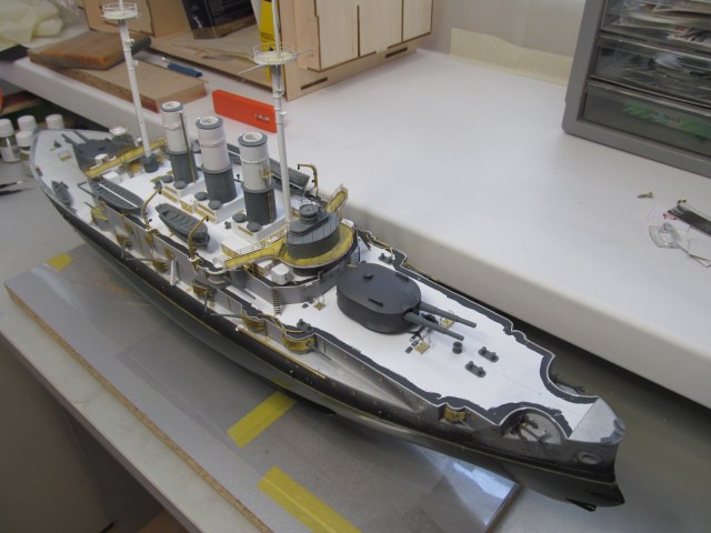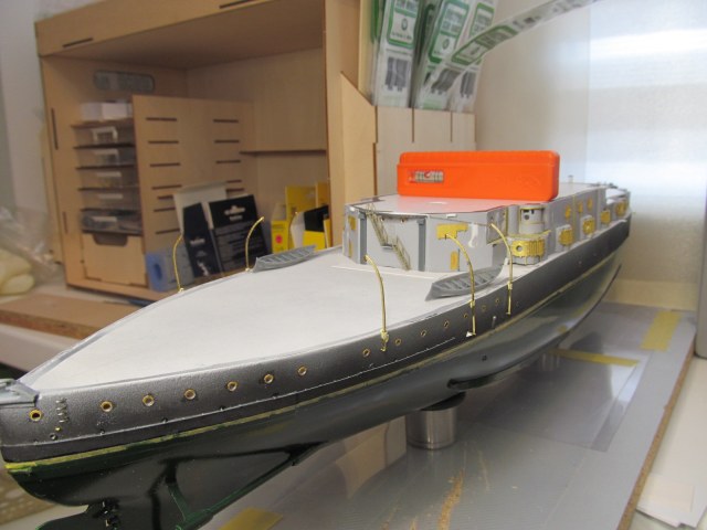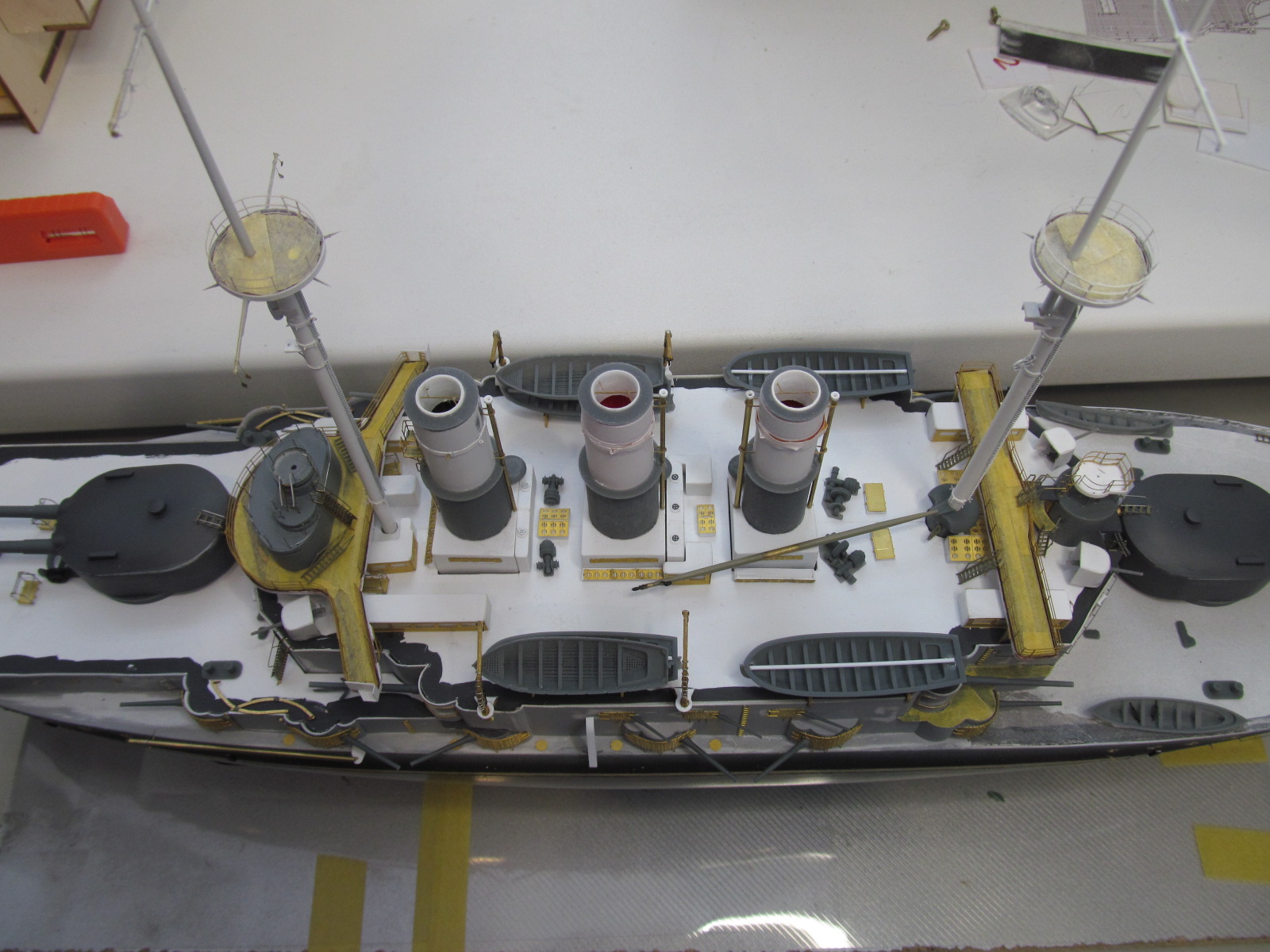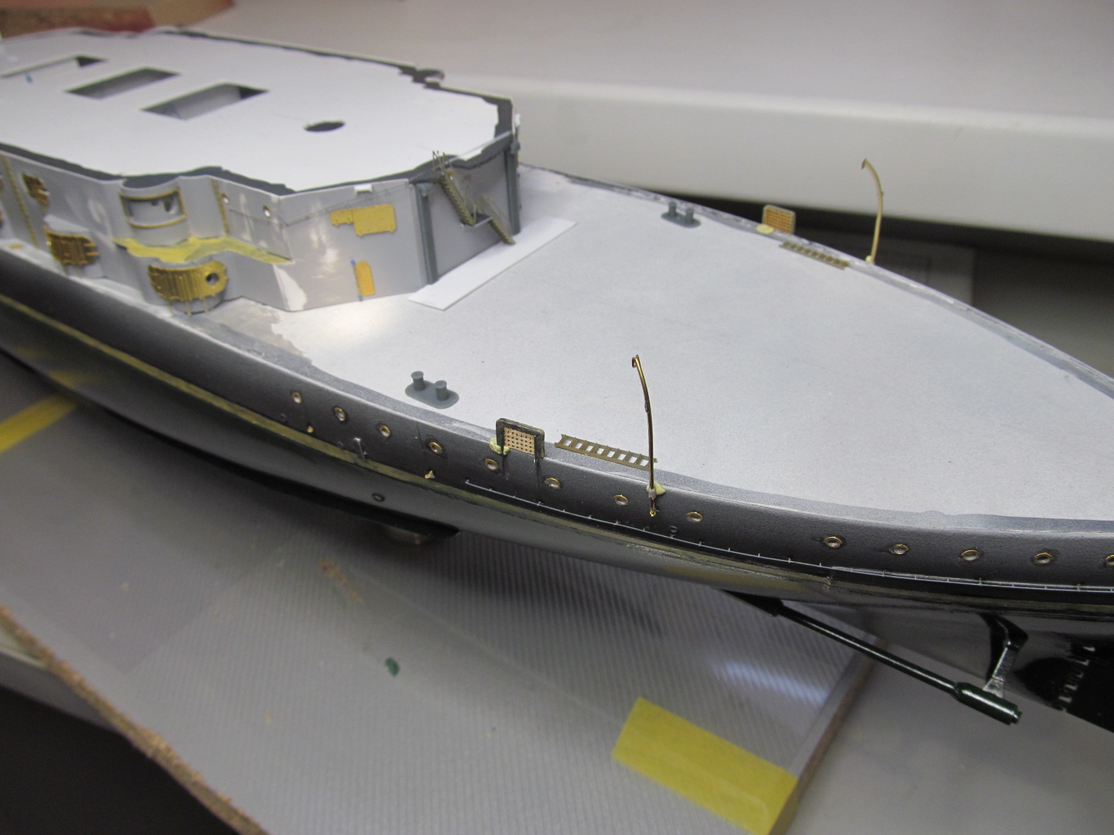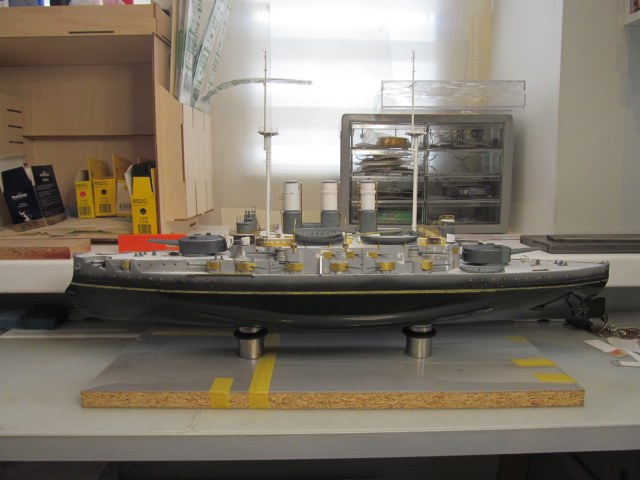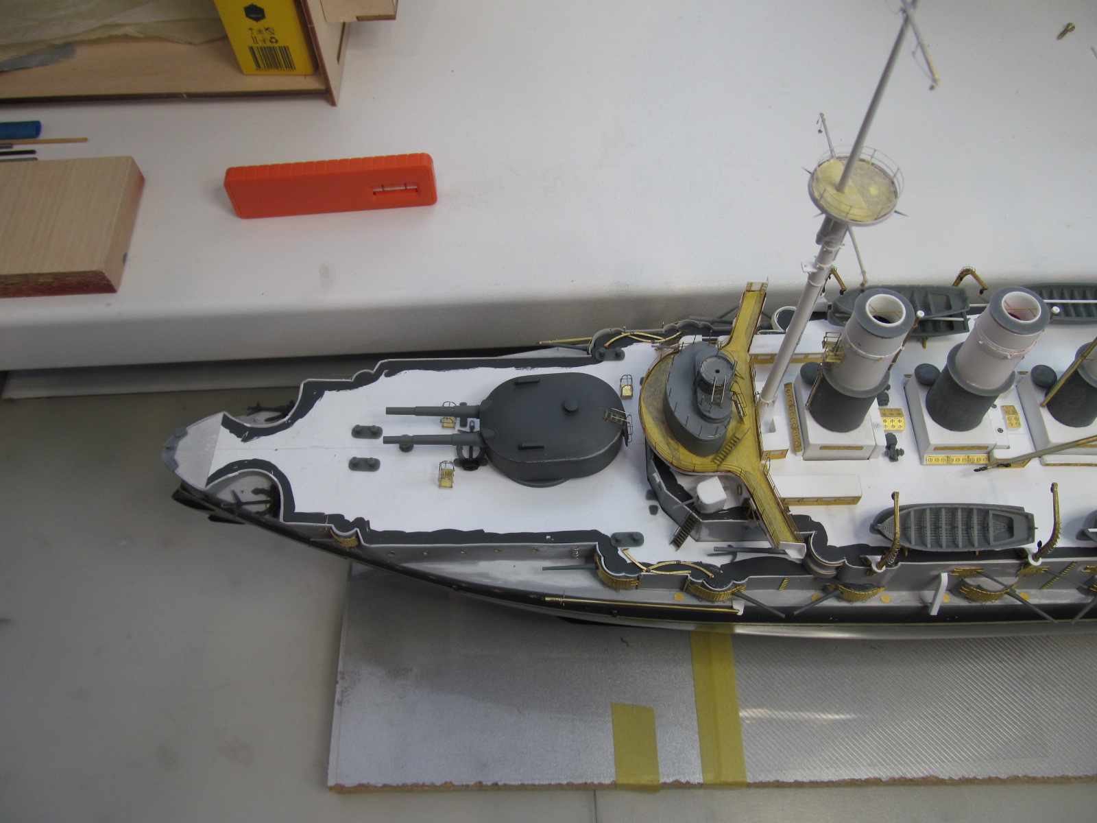- ничего не приклеено кроме кое-каких трапов и створок казематов 75 и 152мм орудий, даже надстройка пока просто на шурупчиках