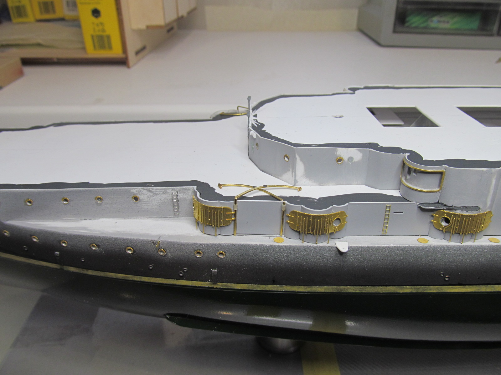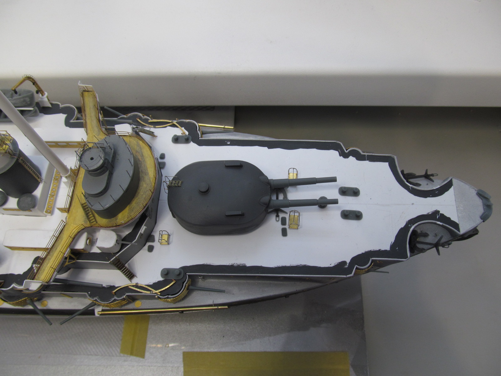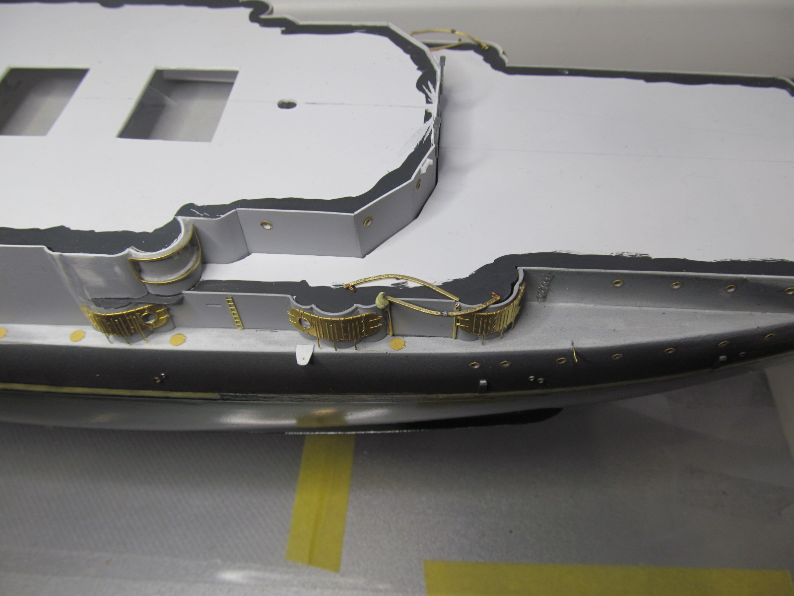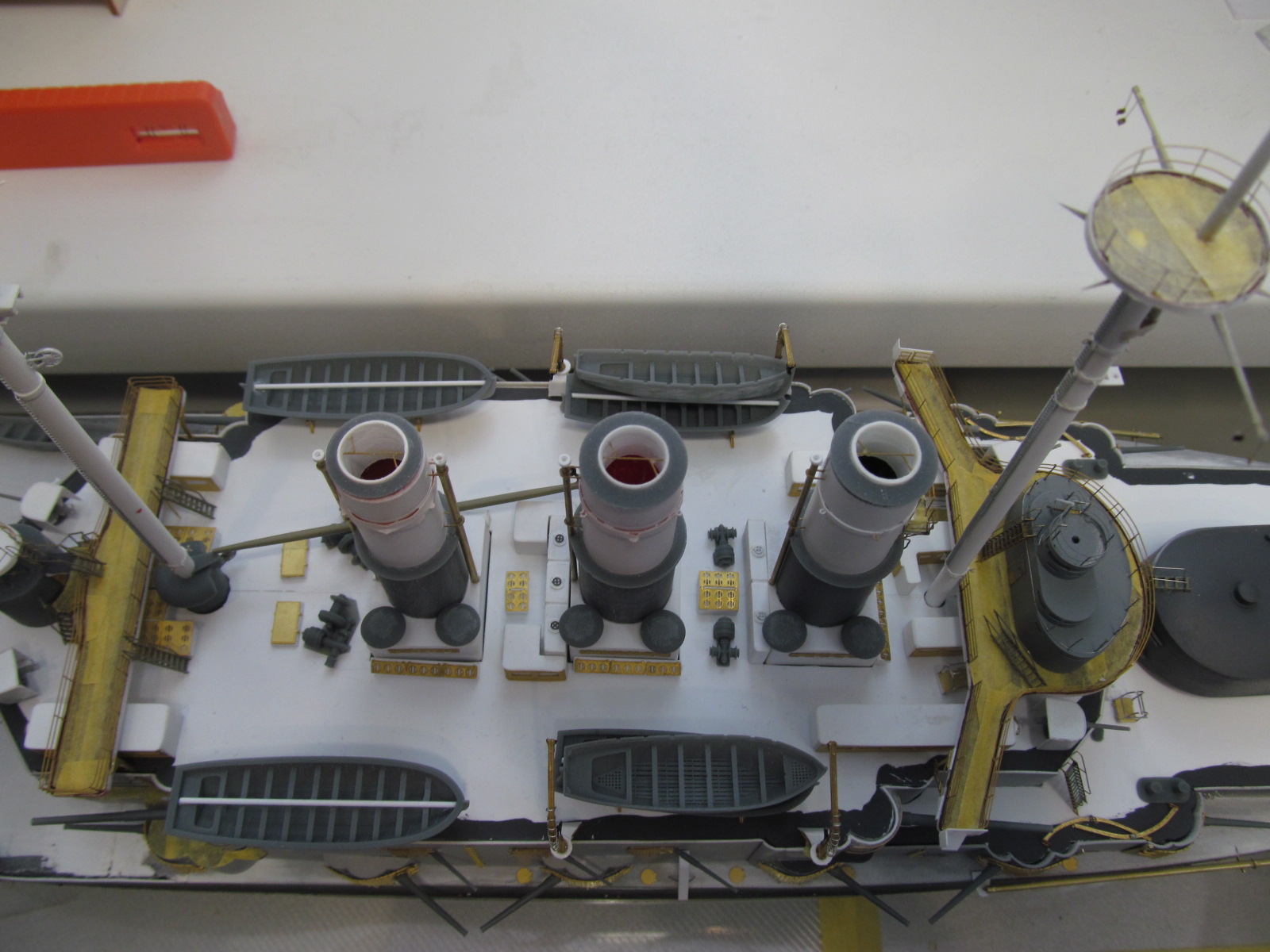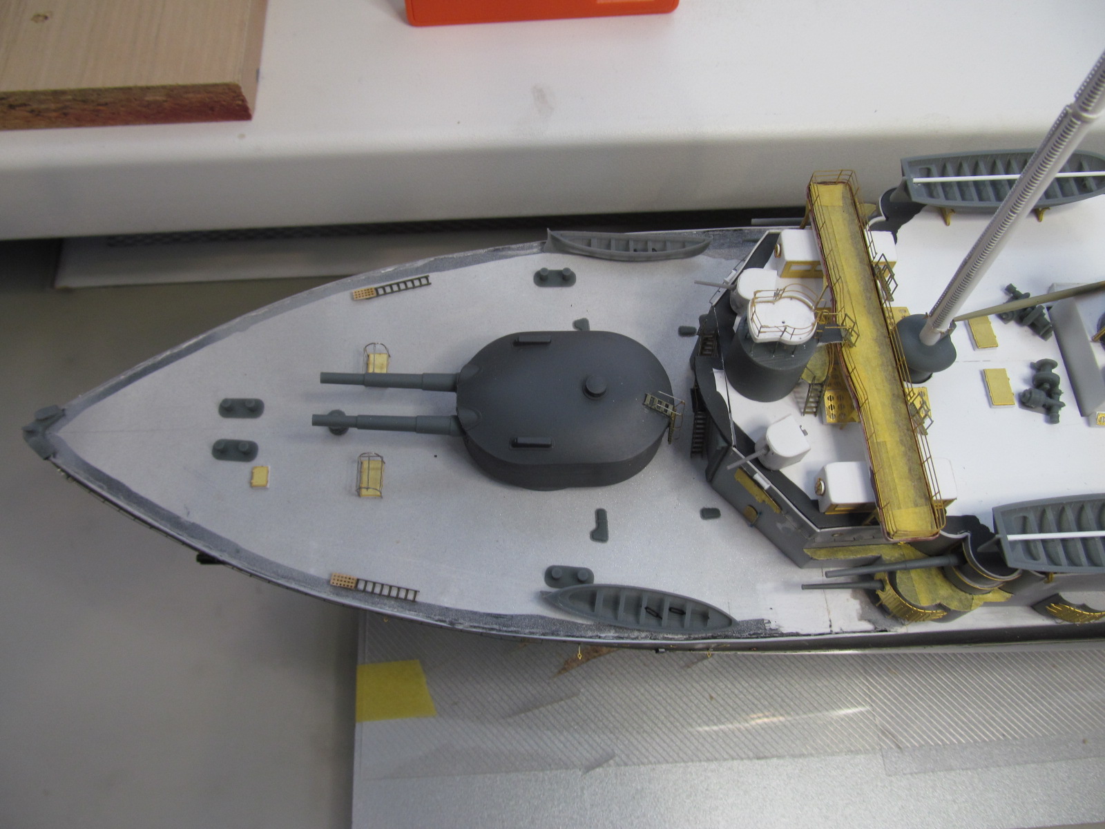 - ничего не приклеено кроме кое-каких трапов и створок казематов 75 и 152мм орудий, даже надстройка пока просто на шурупчиках