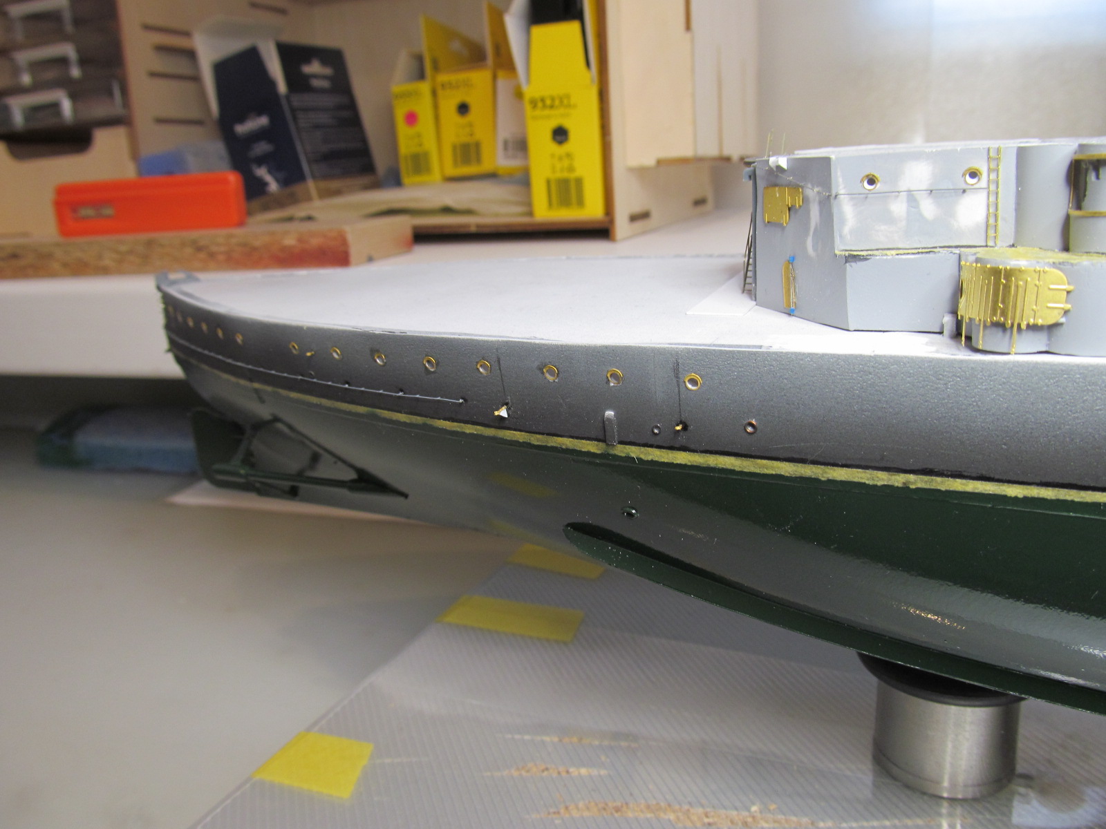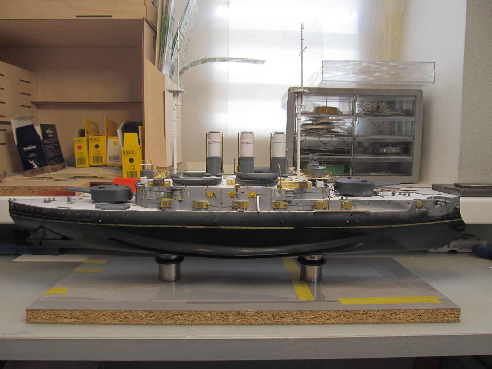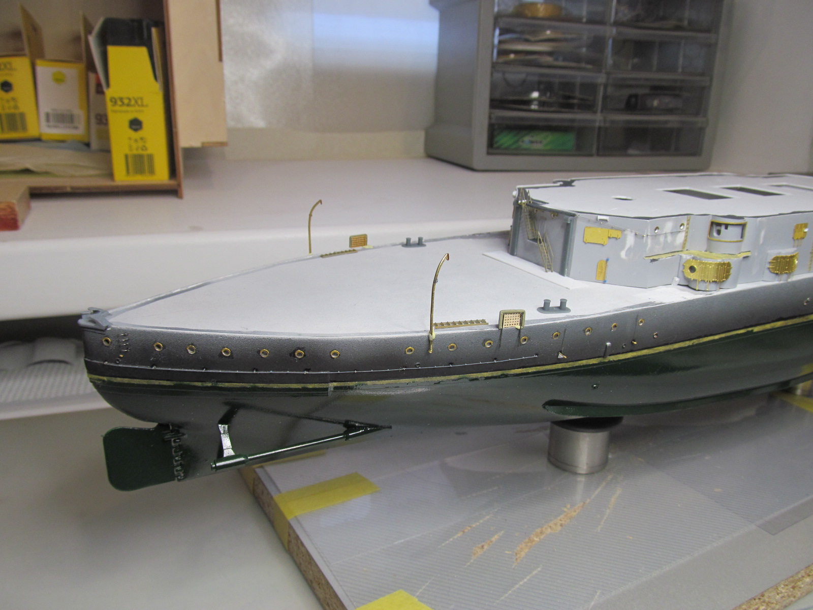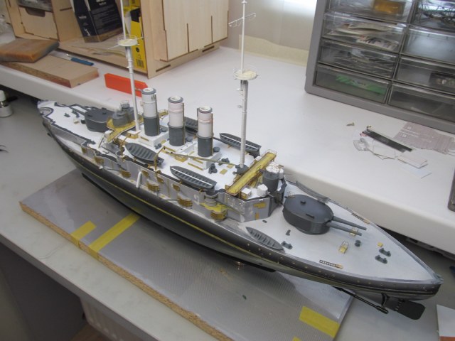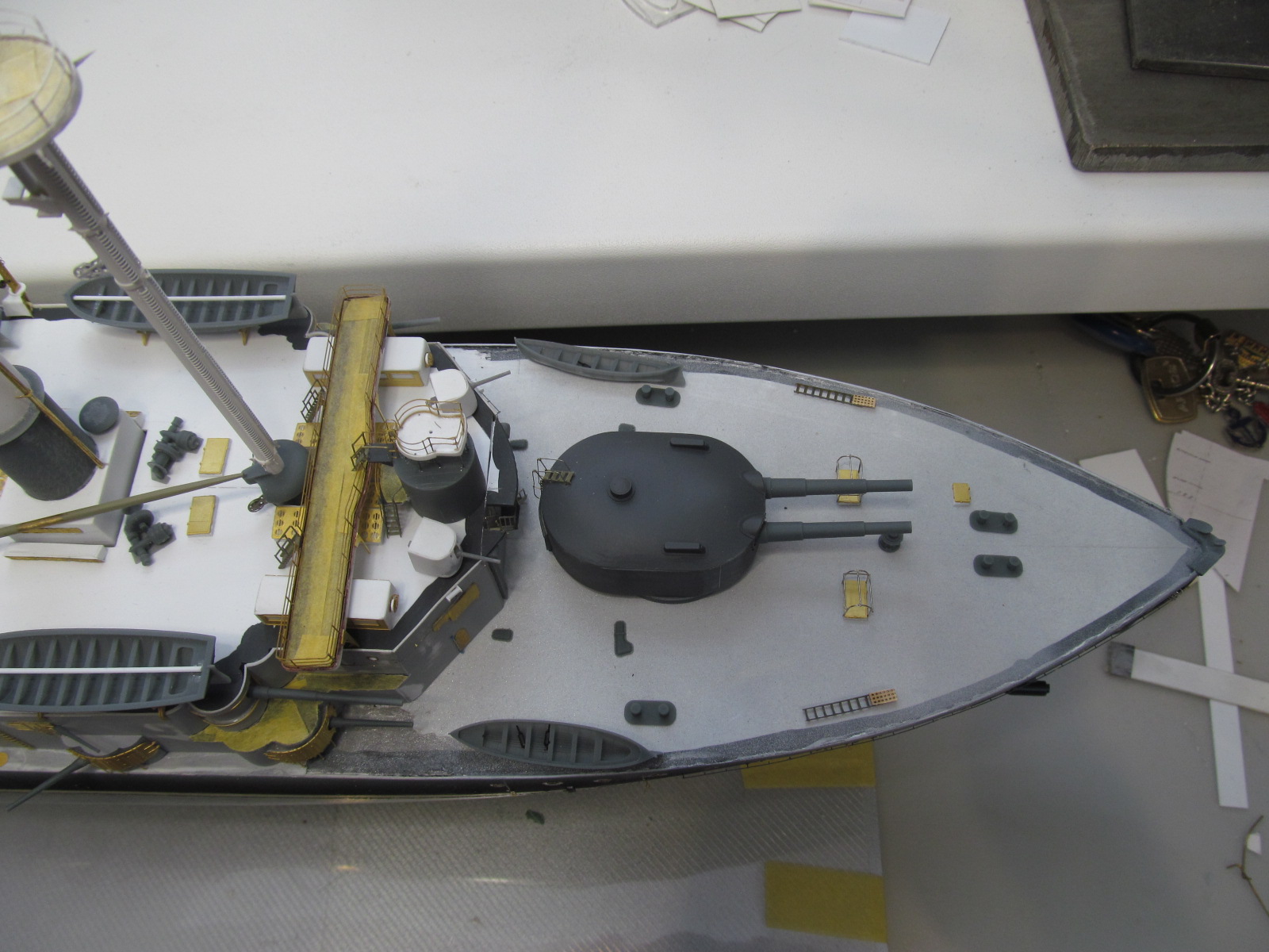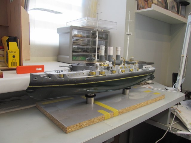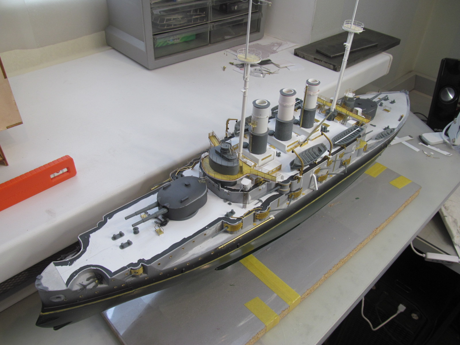 - ничего не приклеено кроме кое-каких трапов и створок казематов 75 и 152мм орудий, даже надстройка пока просто на шурупчиках