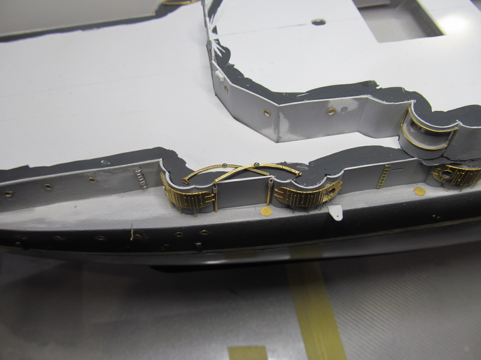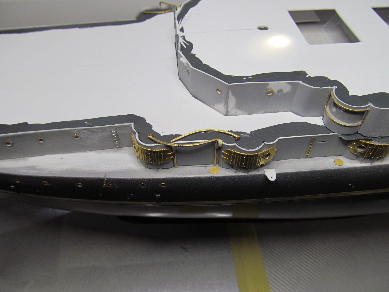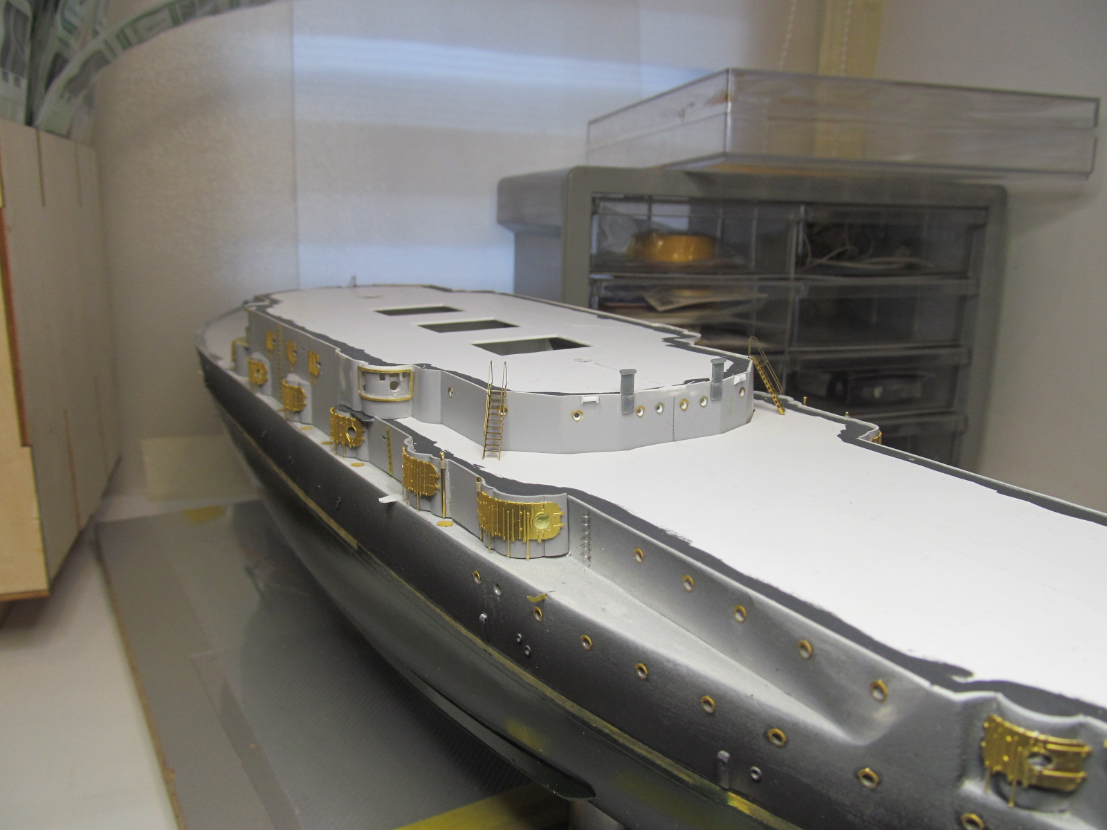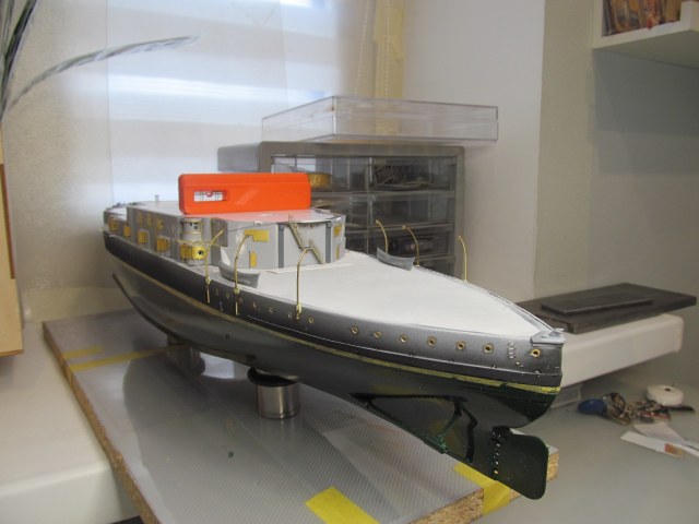 Итак, перед сдачей деталей, деталек, деталюшек и деталищ в покраску, решил ещё раз произвести контрольную примерку (с проверкой правильности мест их установки на корпусе и на палубе) их расположения.