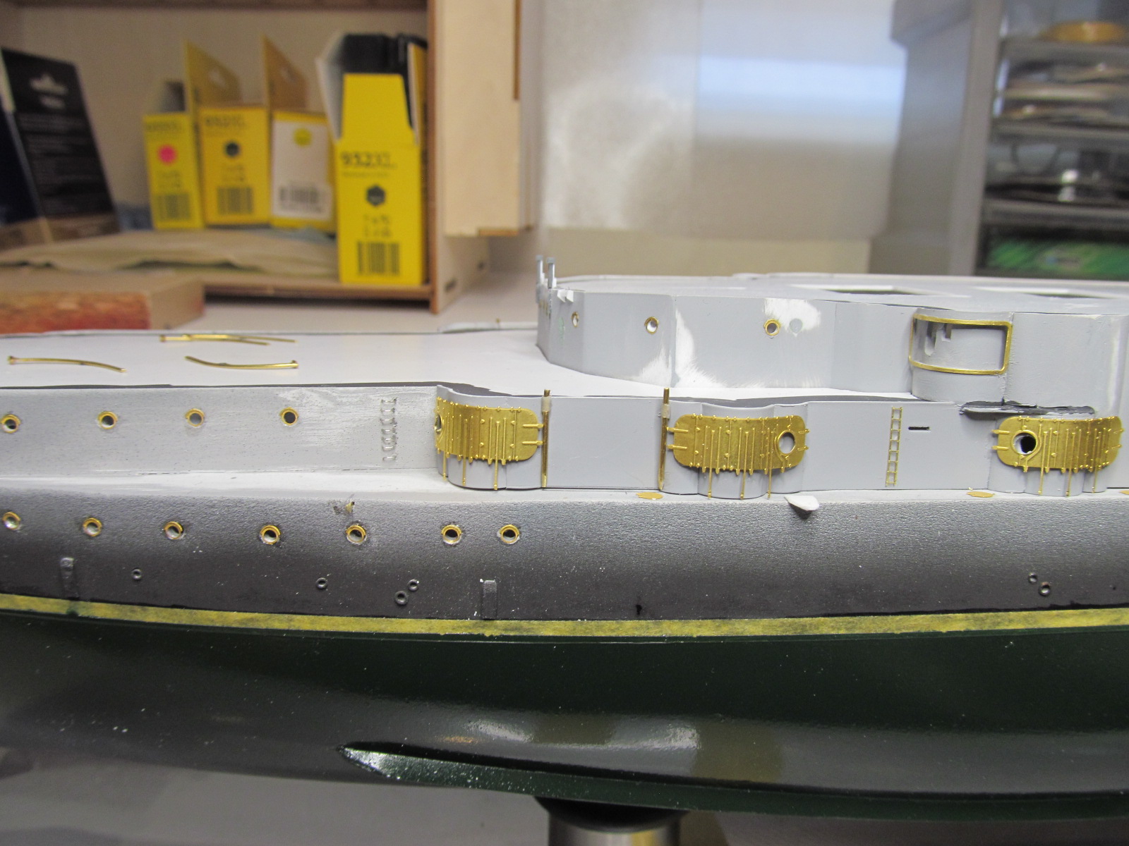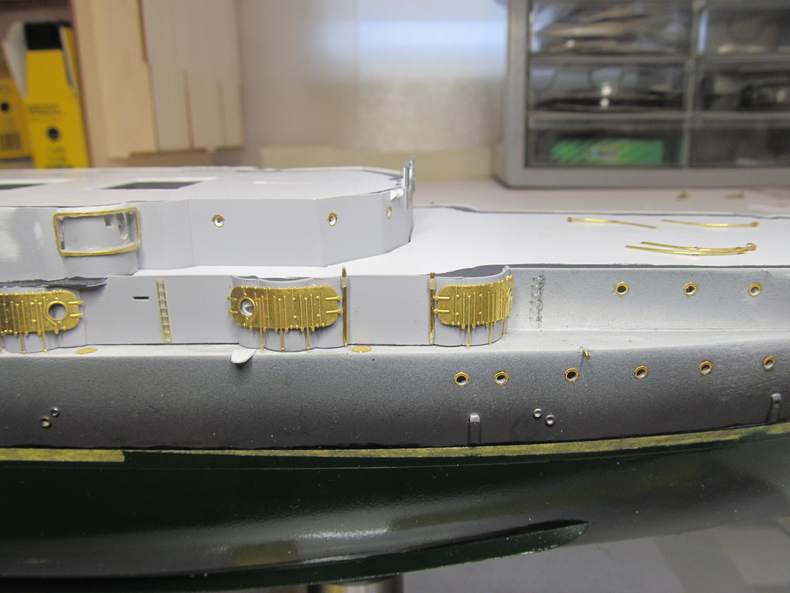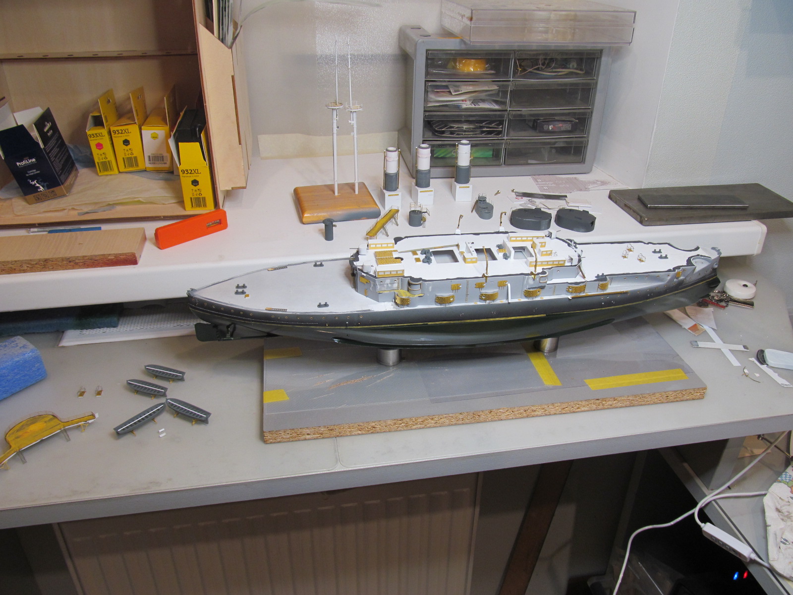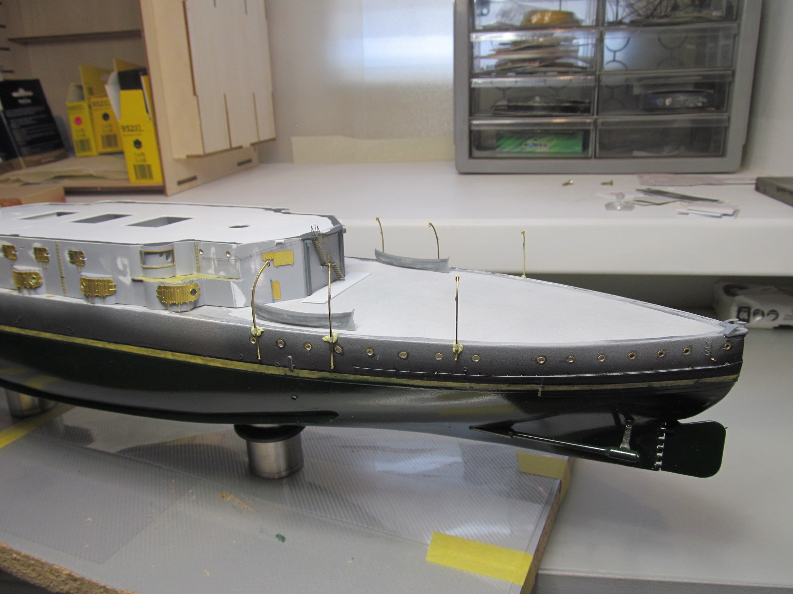 Итак, перед сдачей деталей, деталек, деталюшек и деталищ в покраску, решил ещё раз произвести контрольную примерку (с проверкой правильности мест их установки на корпусе и на палубе) их расположения.