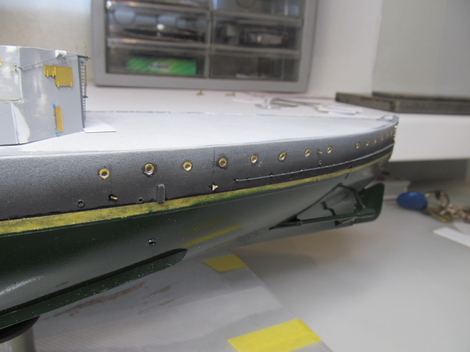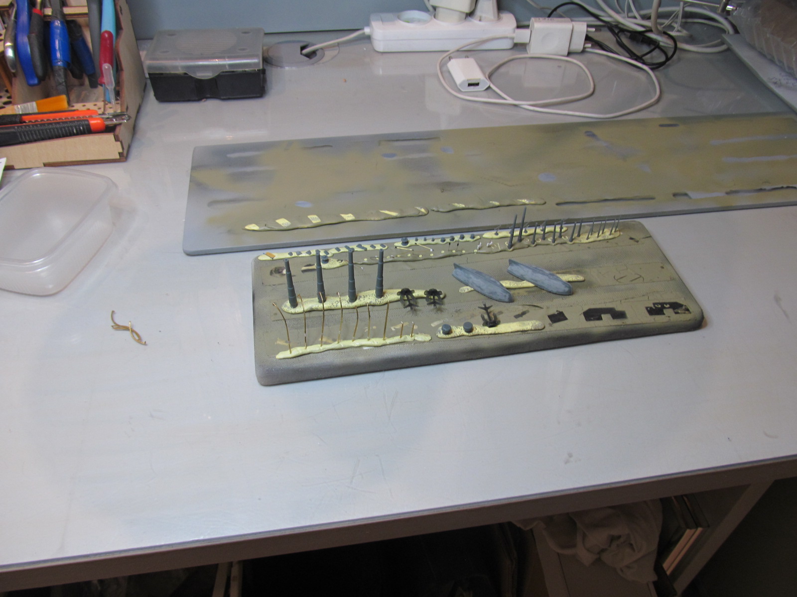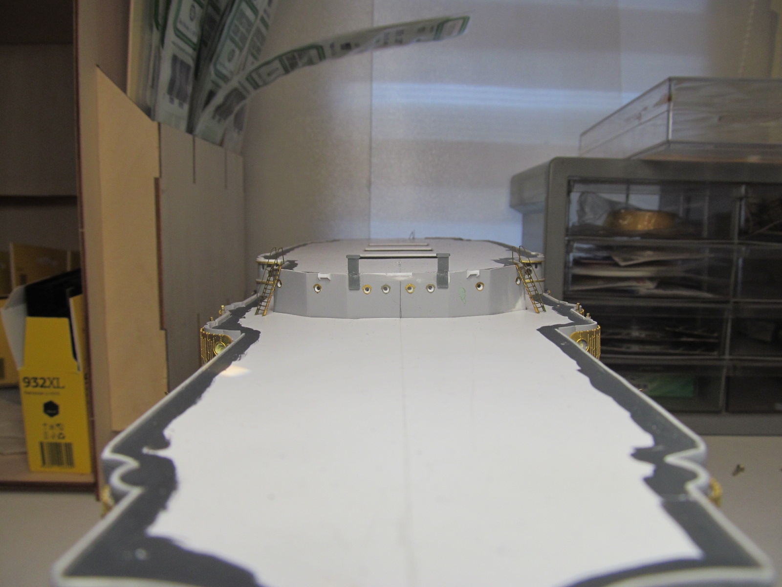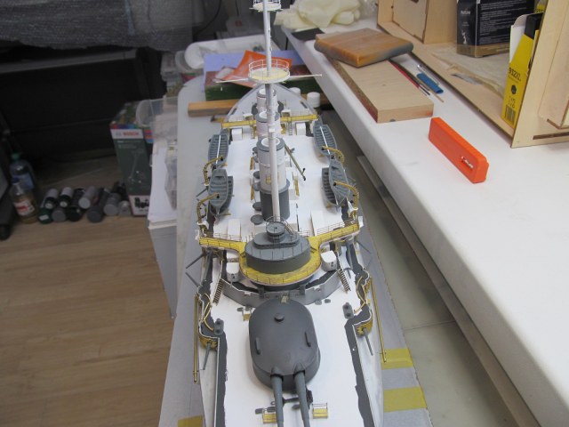 Итак, перед сдачей деталей, деталек, деталюшек и деталищ в покраску, решил ещё раз произвести контрольную примерку (с проверкой правильности мест их установки на корпусе и на палубе) их расположения.