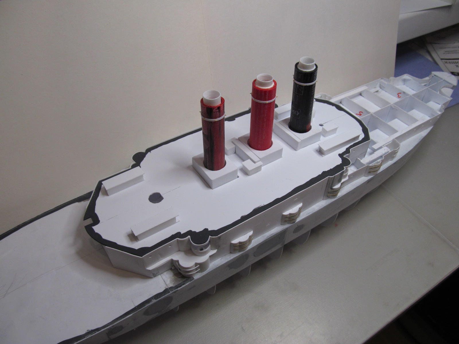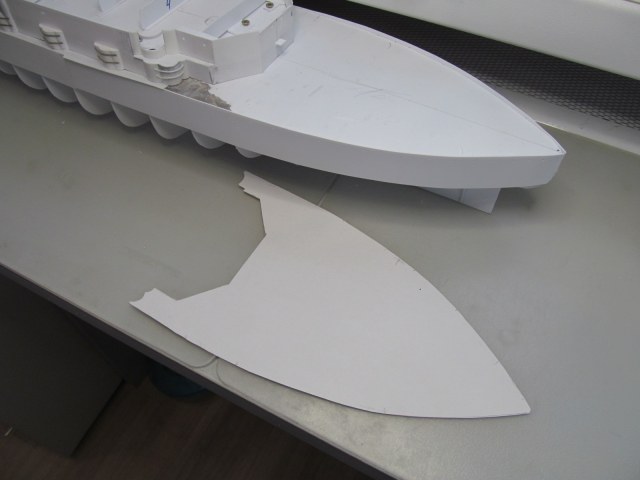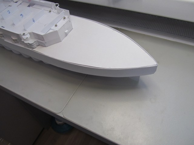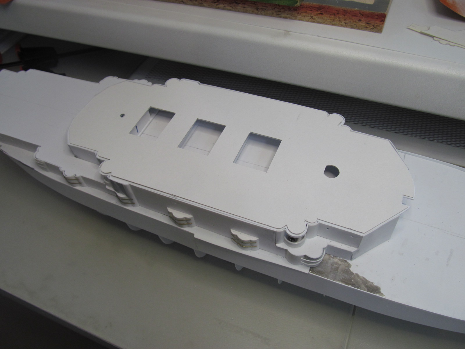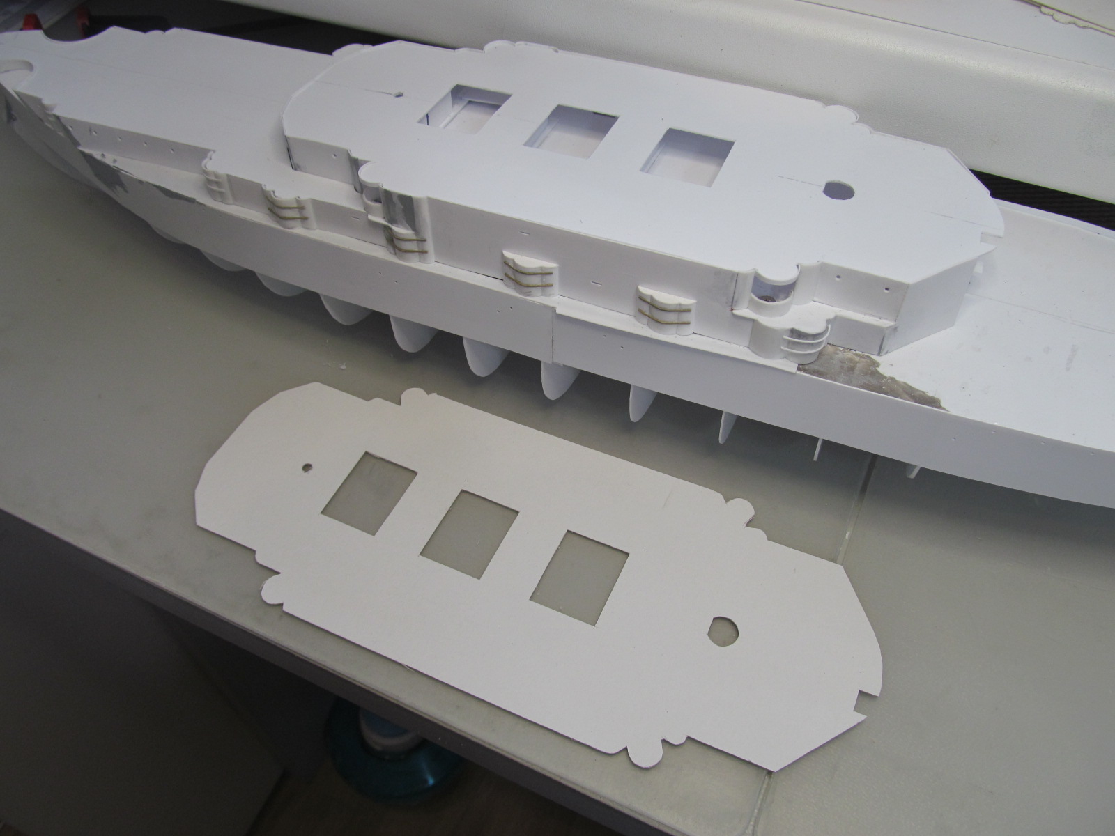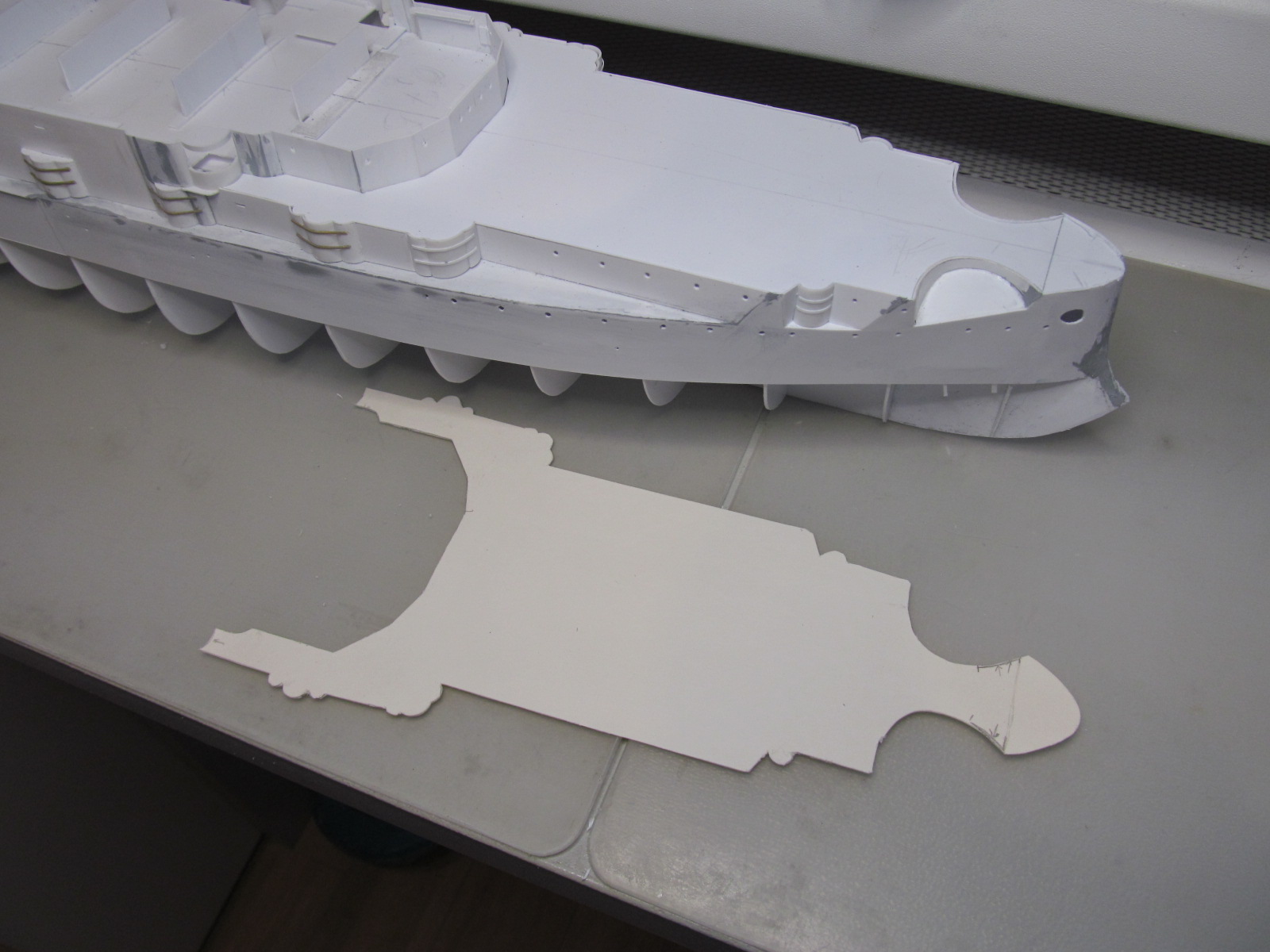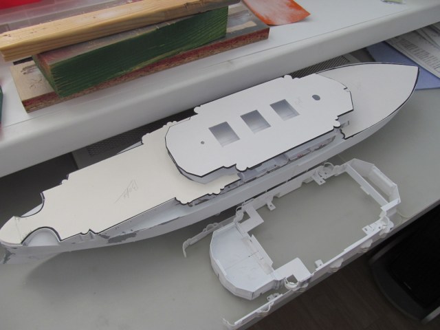 Учитывая то момент, что требуется довольно точное фиксирование габаритов корпуса и надстройки (пока всё это зафиксировано вместе), для заказа лазерной резки для палуб на полубаке, на юте и на спардеке, я и произвёл вырезание трафаретов с фиксированием их контурных габаритов. 1,5 мм зазор на ватервейс теперь обеспечен.