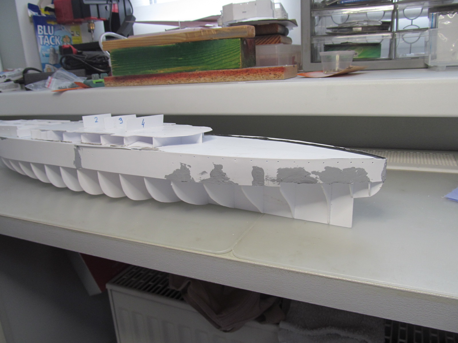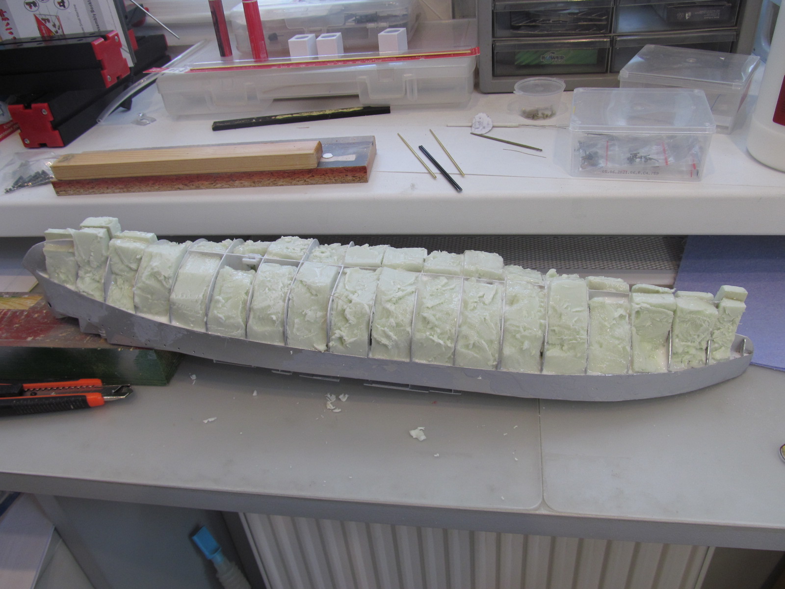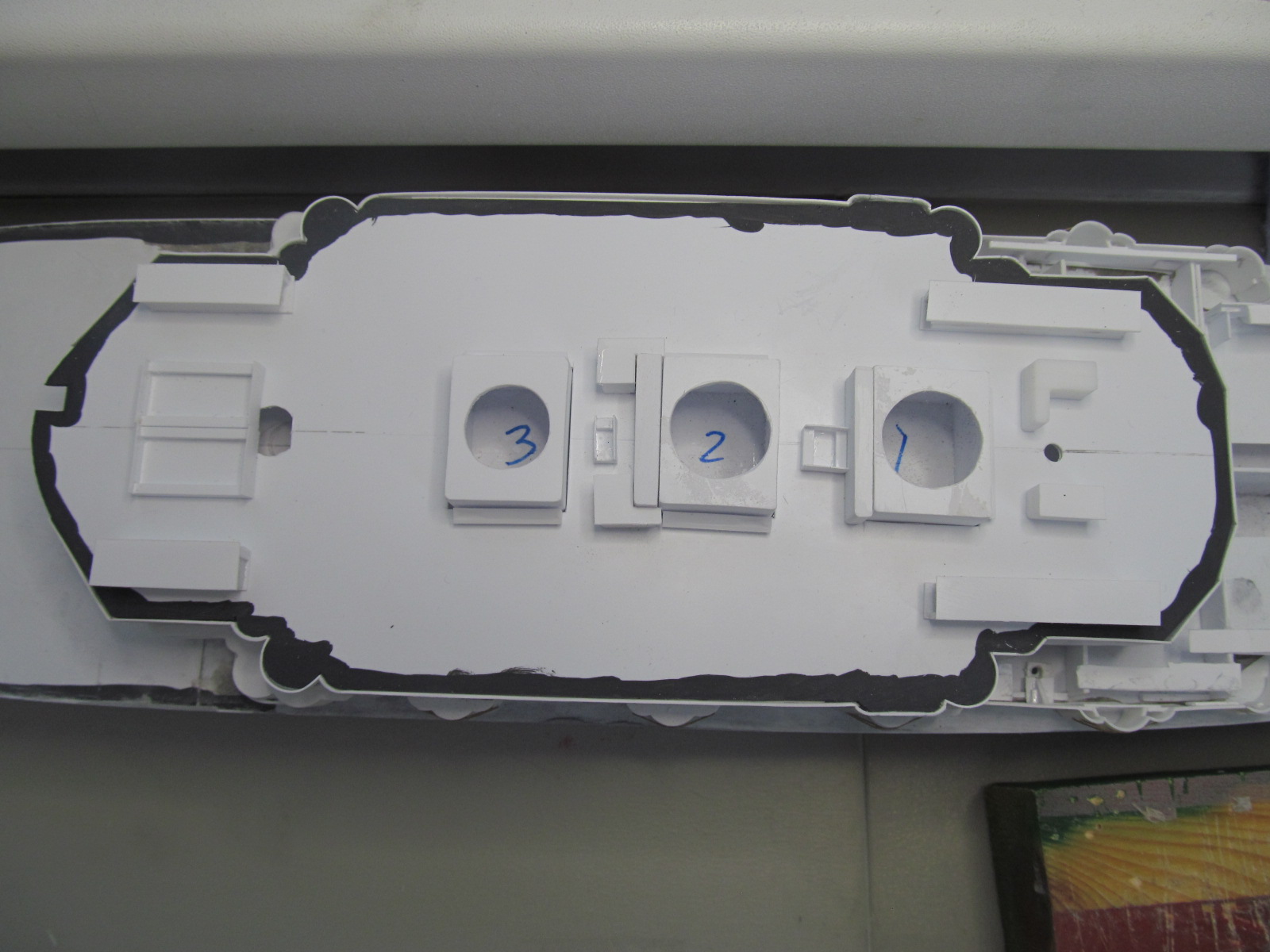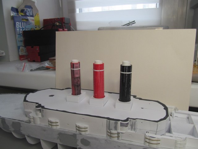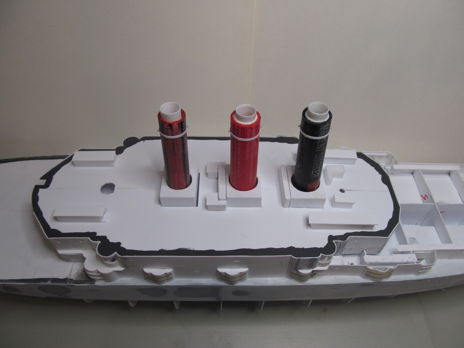 Учитывая то момент, что требуется довольно точное фиксирование габаритов корпуса и надстройки (пока всё это зафиксировано вместе), для заказа лазерной резки для палуб на полубаке, на юте и на спардеке, я и произвёл вырезание трафаретов с фиксированием их контурных габаритов. 1,5 мм зазор на ватервейс теперь обеспечен.