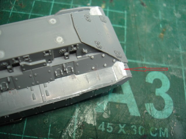 поправил левый борт. Согласен, что до идеала ой как далеко, но уж как смог. Крепление плит брони получились у производителя не совсем четкие, после окончания сборки, все это будет грунтоваться и как не старайся наносить полупрозрачные слои, но потом еще окраска, так что многое просто будет едва угадываться. Сильно различаться не будет, поэтому с бортом все.