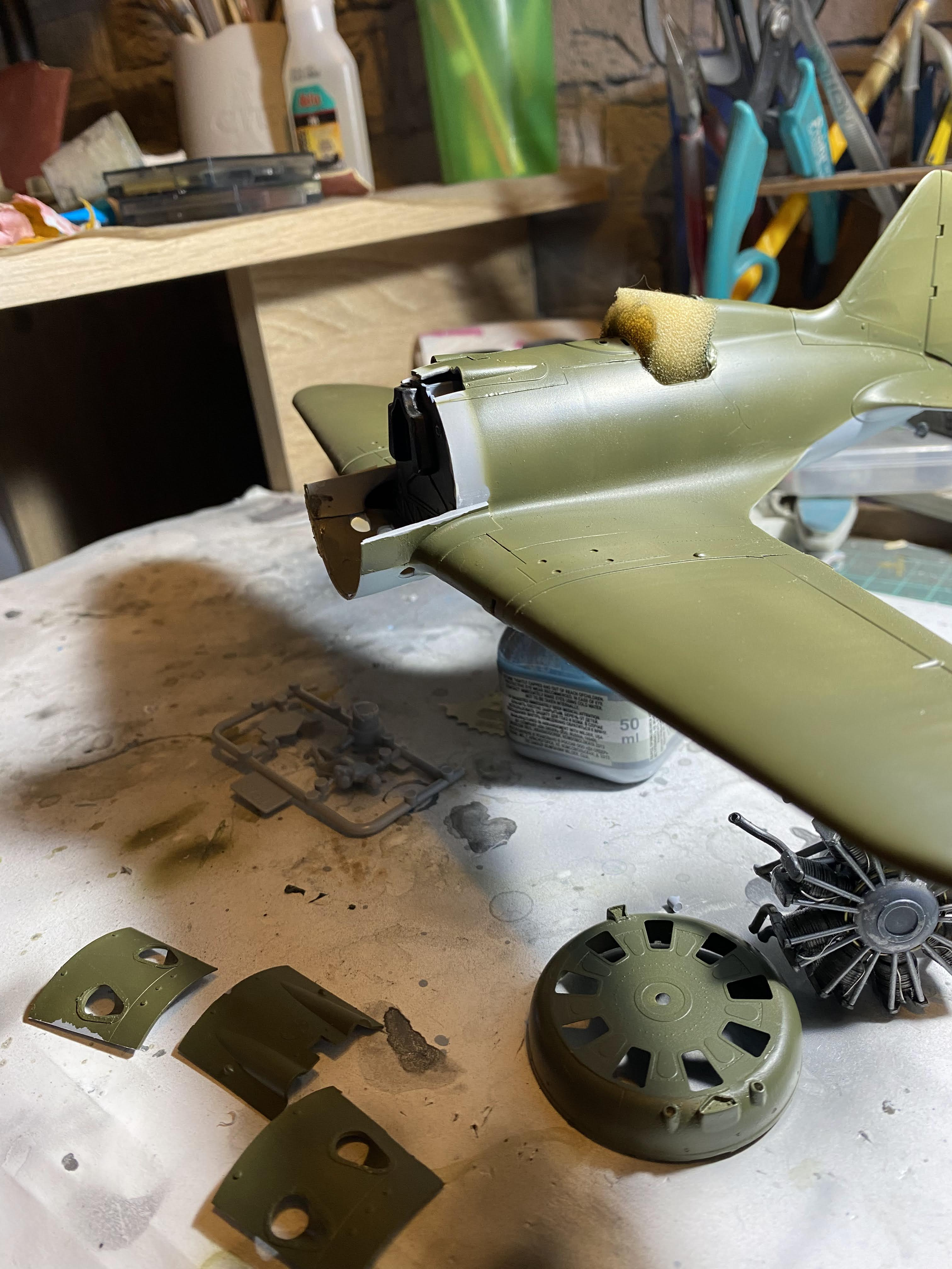 Начал подгонять смоляные колеса к стойкам (посадочные диаметра разные- вклеил отрезки игл), по частям клею "лоб" капота - еще не все приклеил - поэтому на фото щель. Также вожусь с травленым шасси.