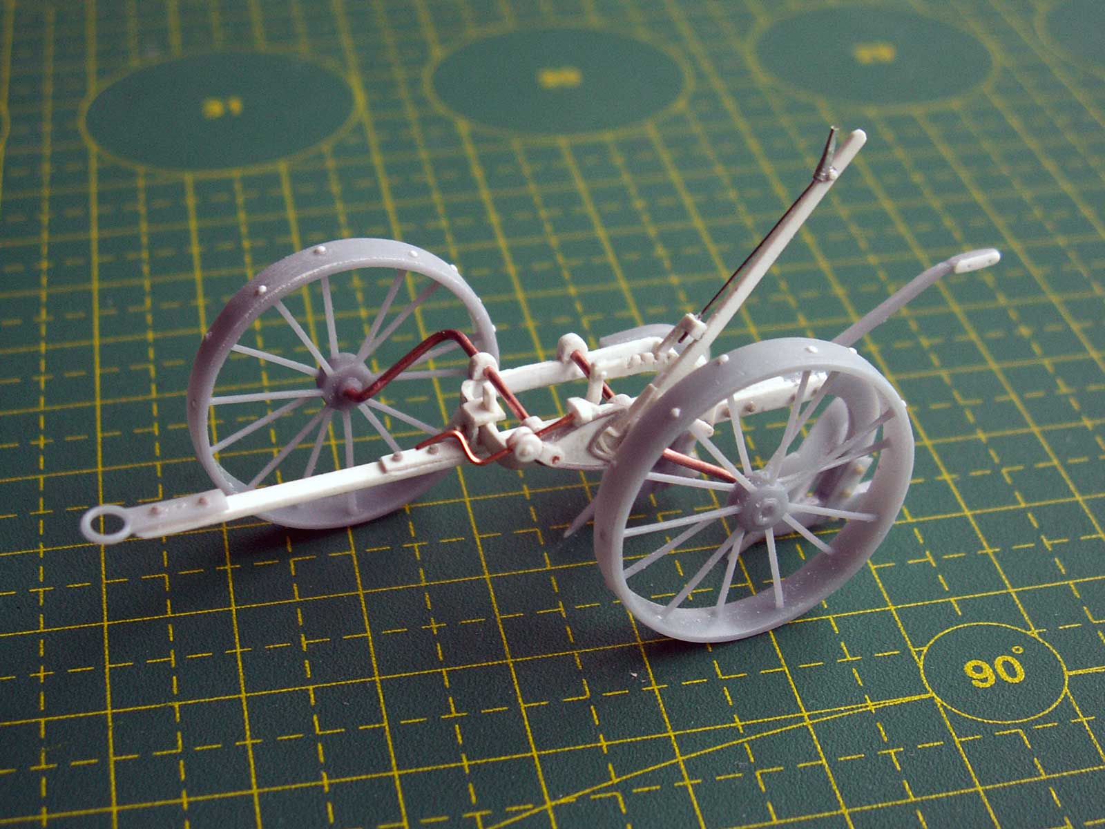 Там где можно собрать крупными модулями (например у танка - башня/корпус/ходовая, у авто - кабина/двигатель/рама/кузов, у пушки - лафет/щит/люлька со стволом) конечно лучше красить эти модули отдельно, но в данном случае отдельно только задние колеса, остальное открыто и окрашивать мелкие детали вполне удобно.