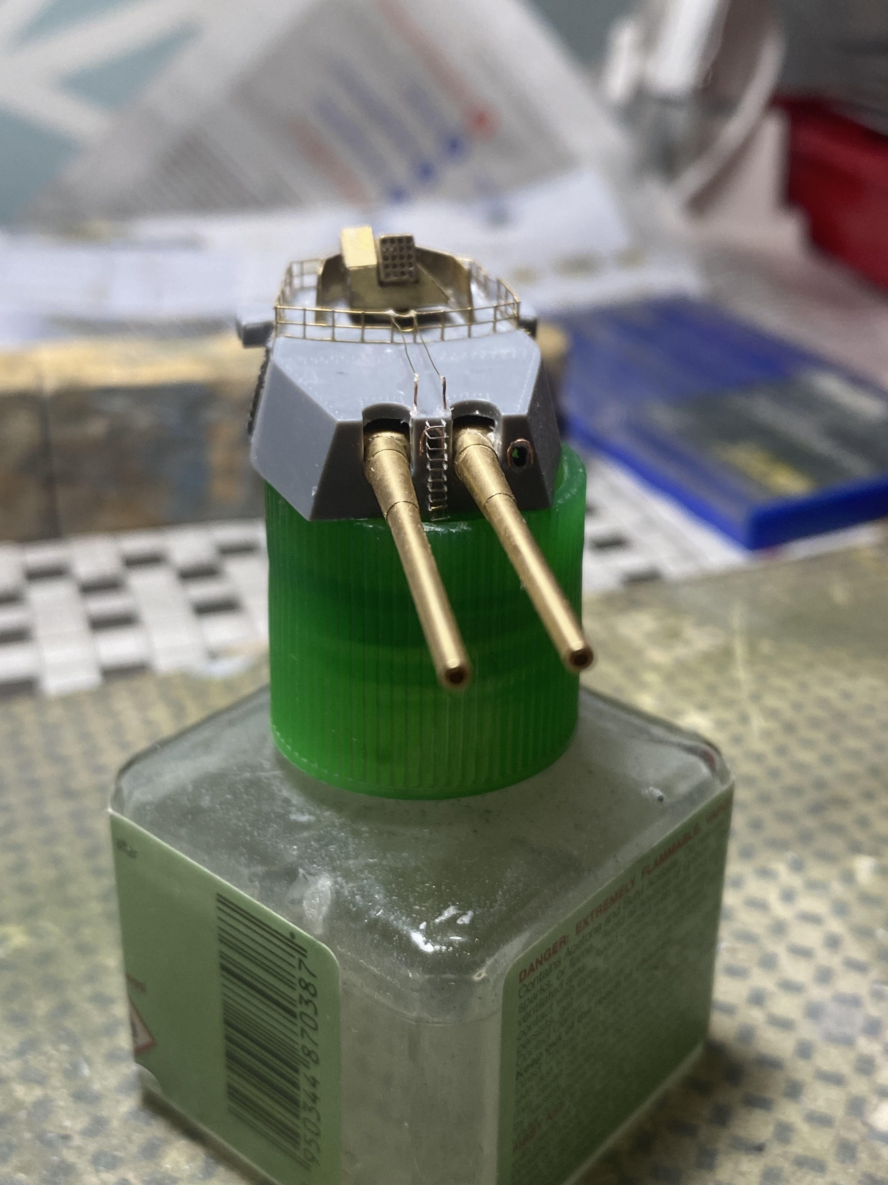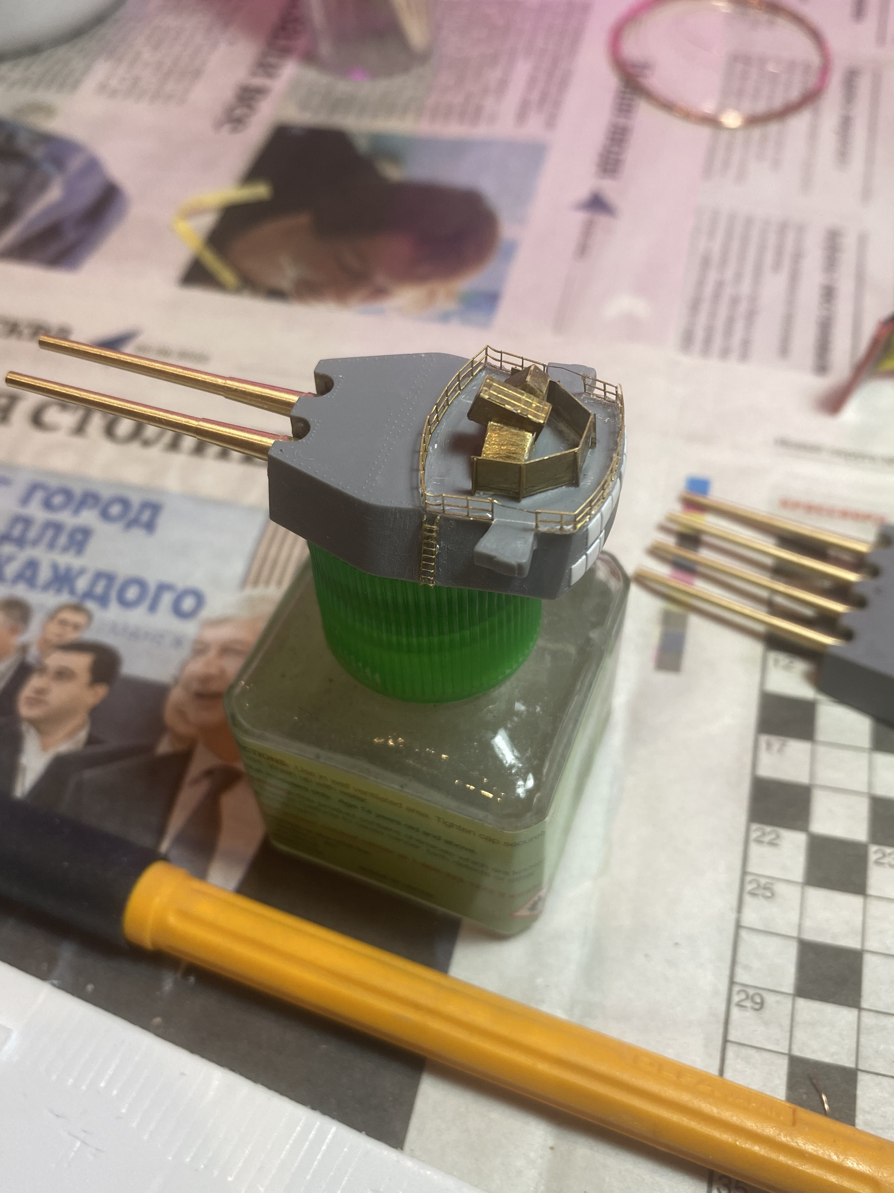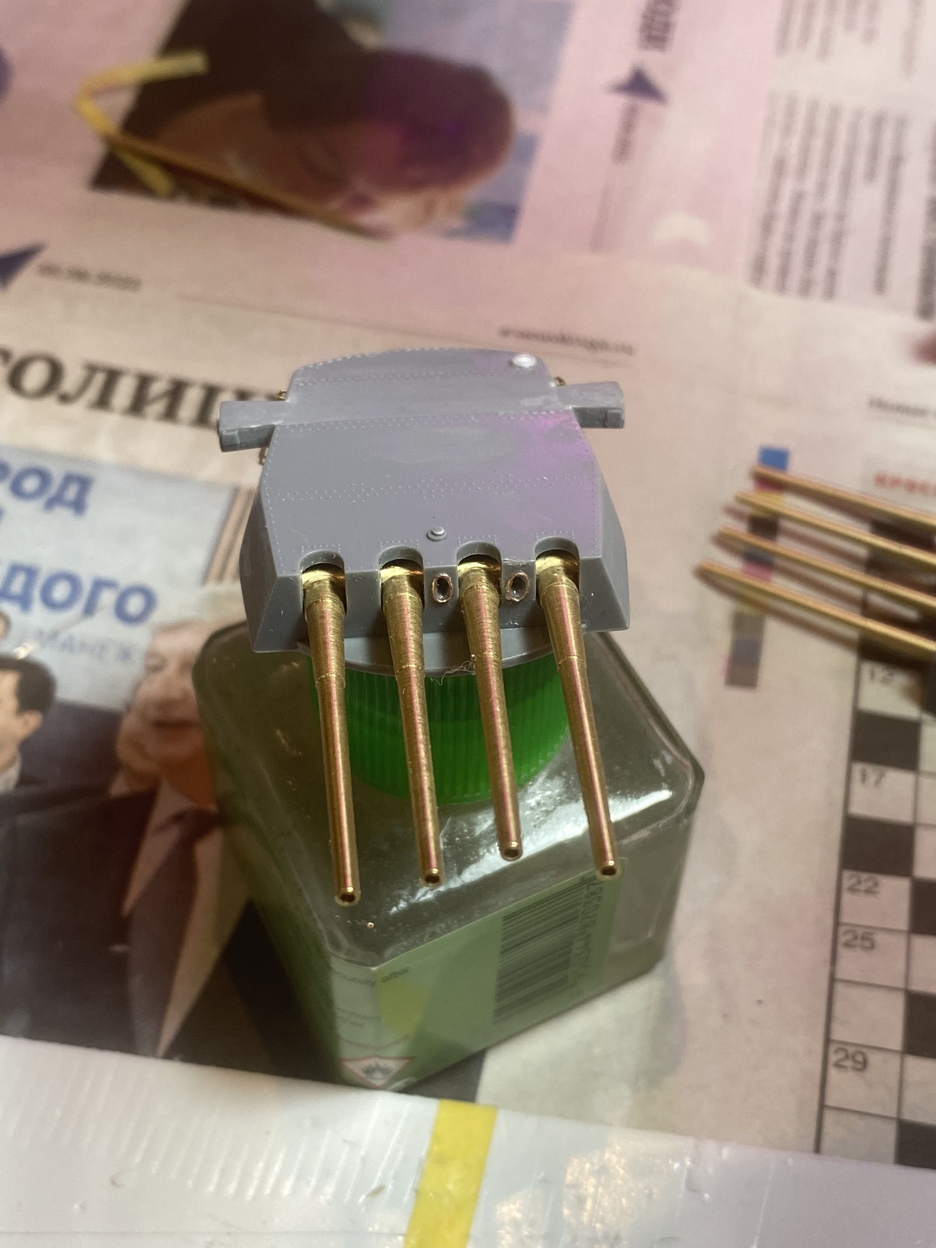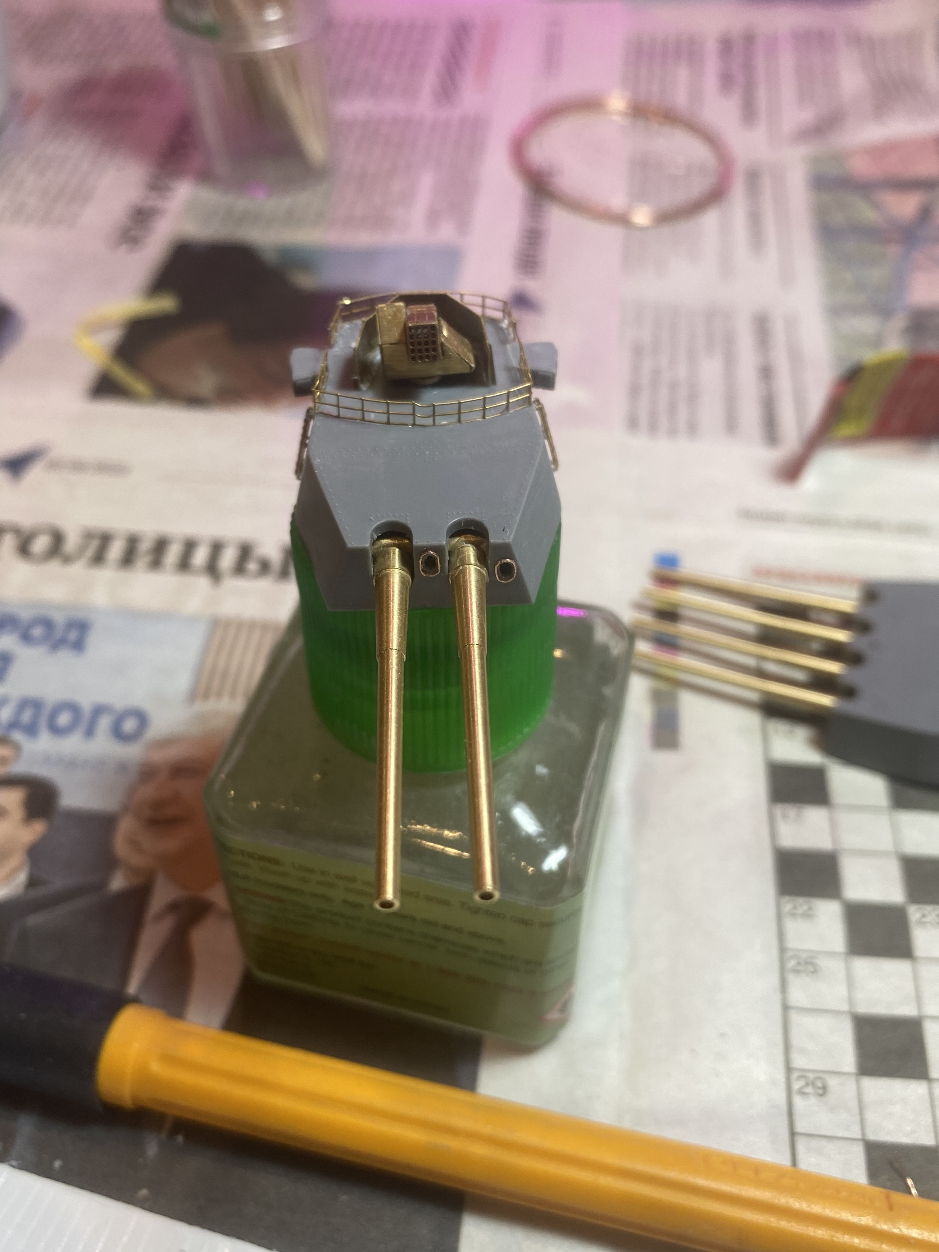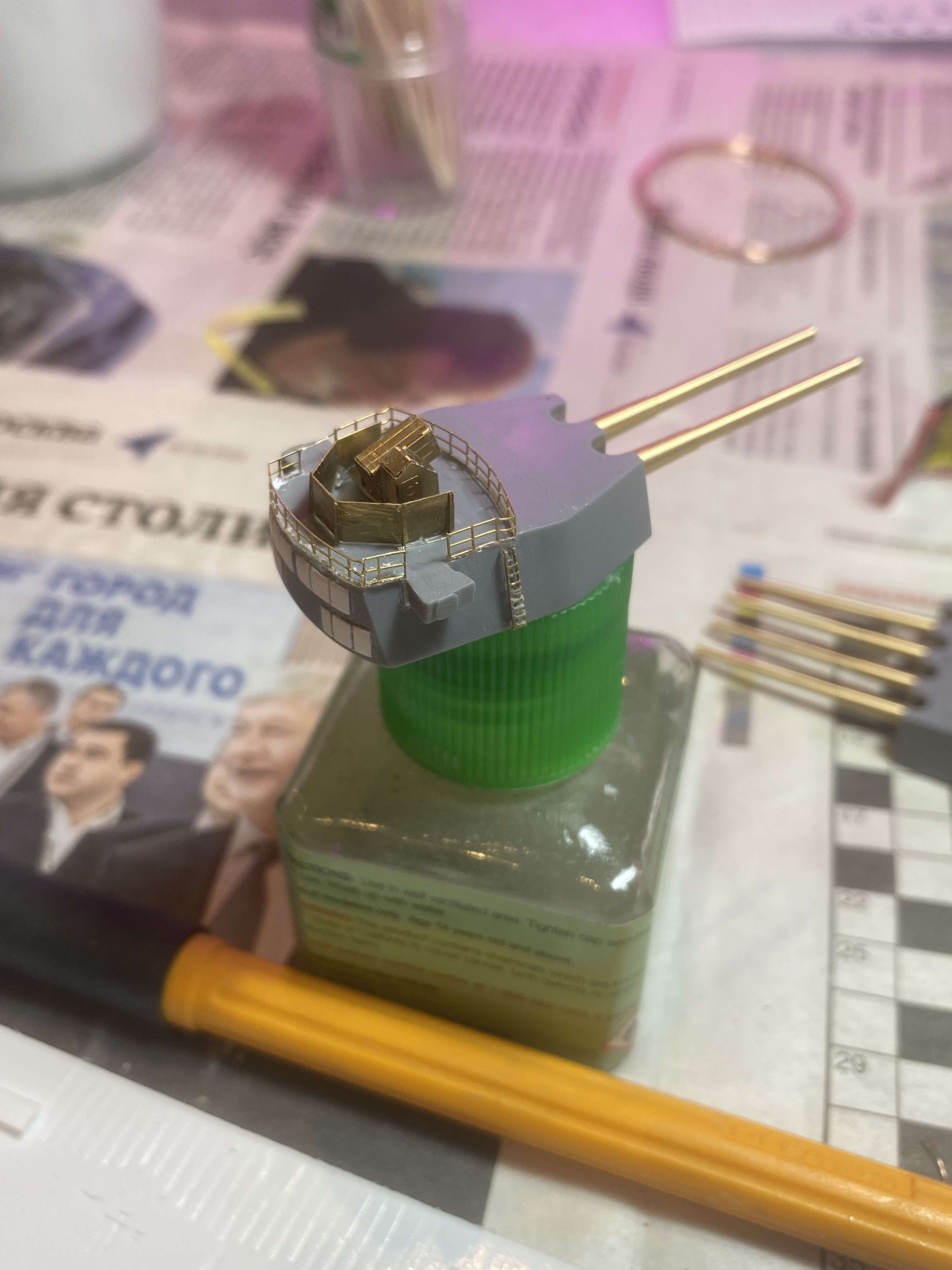 Вот пока прикрепил проволку вместо гребёнки…уж сорян….Голову сломал всю…. Плюс из пластика уголки сварные поставил снизу башни и сделал толи перископ, толи воздуховод….