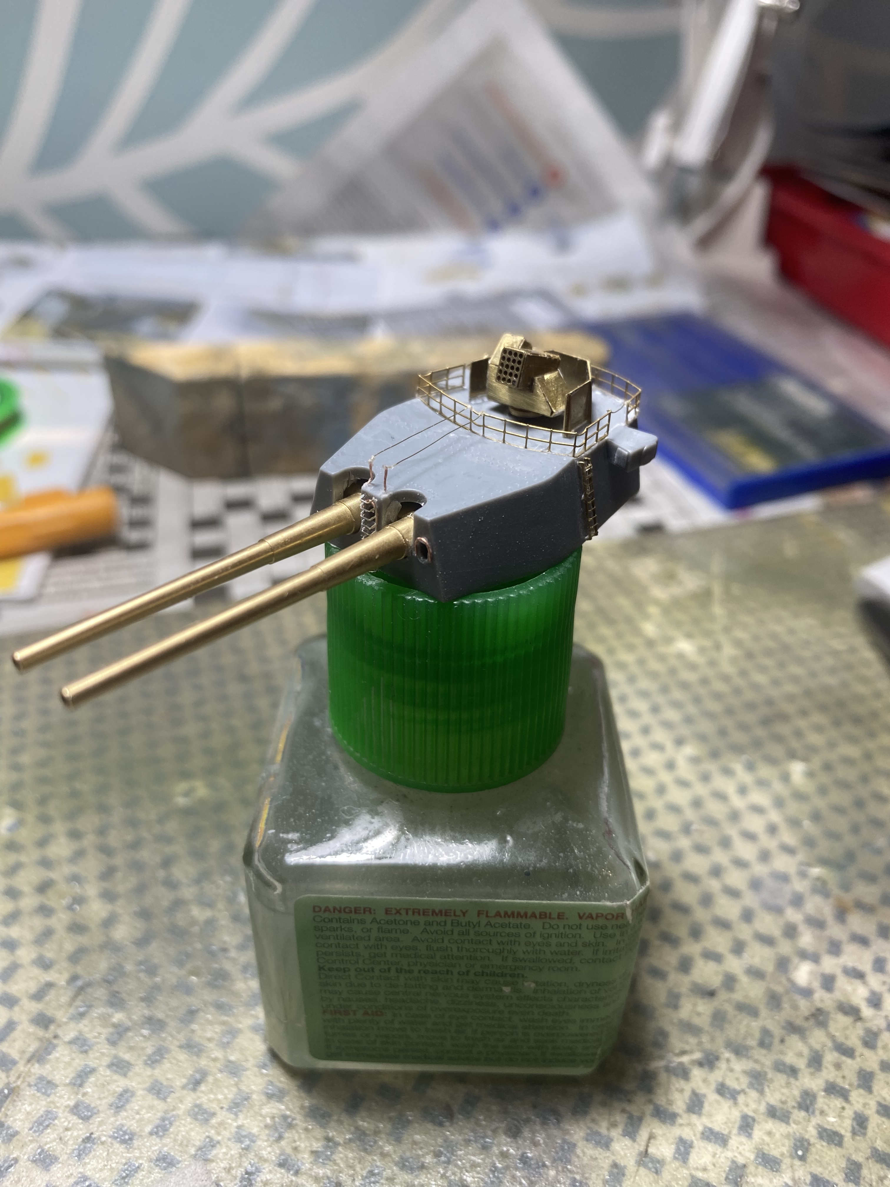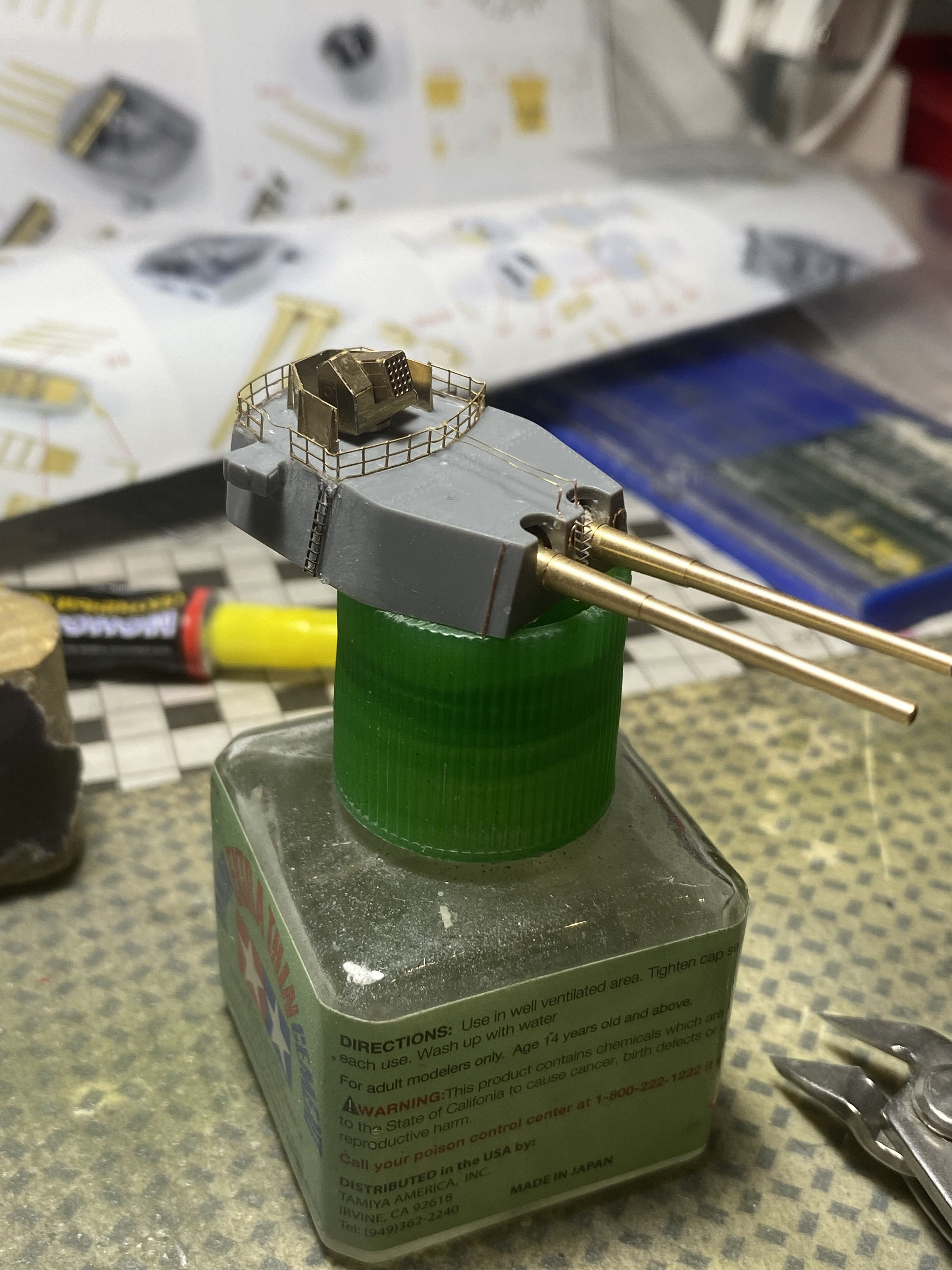 Олег, длинный леер на башне который ведет к стойкам у лестницы надо или переделать или пока убрать. Он не ровный и на точках крепления много клея. После покраски будет не красиво. Его бы желательно сделать из упругой проволоки типа Modelkasten, сейчас ее много фирм подобную делают. Даже Трамп по моему. На Алиэкспресс есть. Ее и красить не надо и она по любому прямая и приклеить ее можно после покраски.