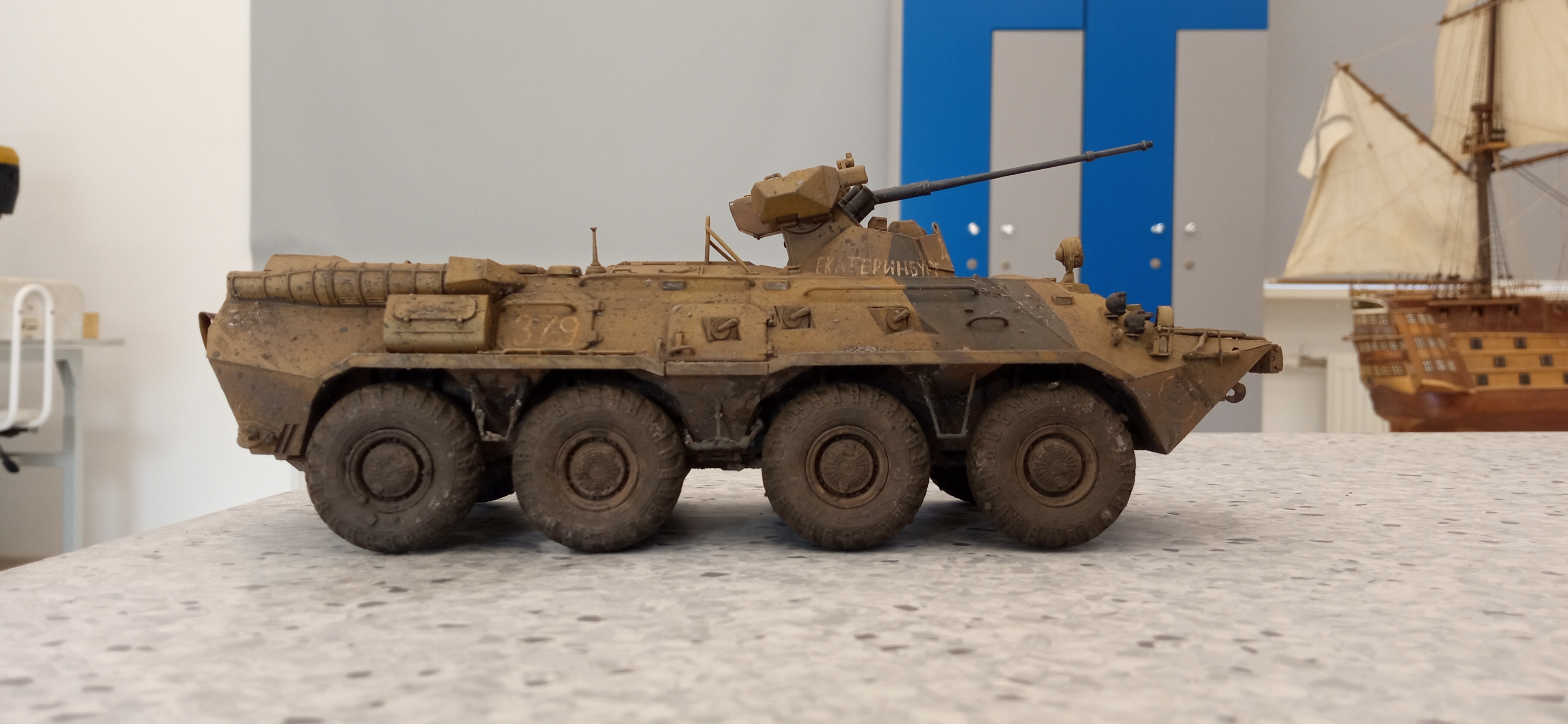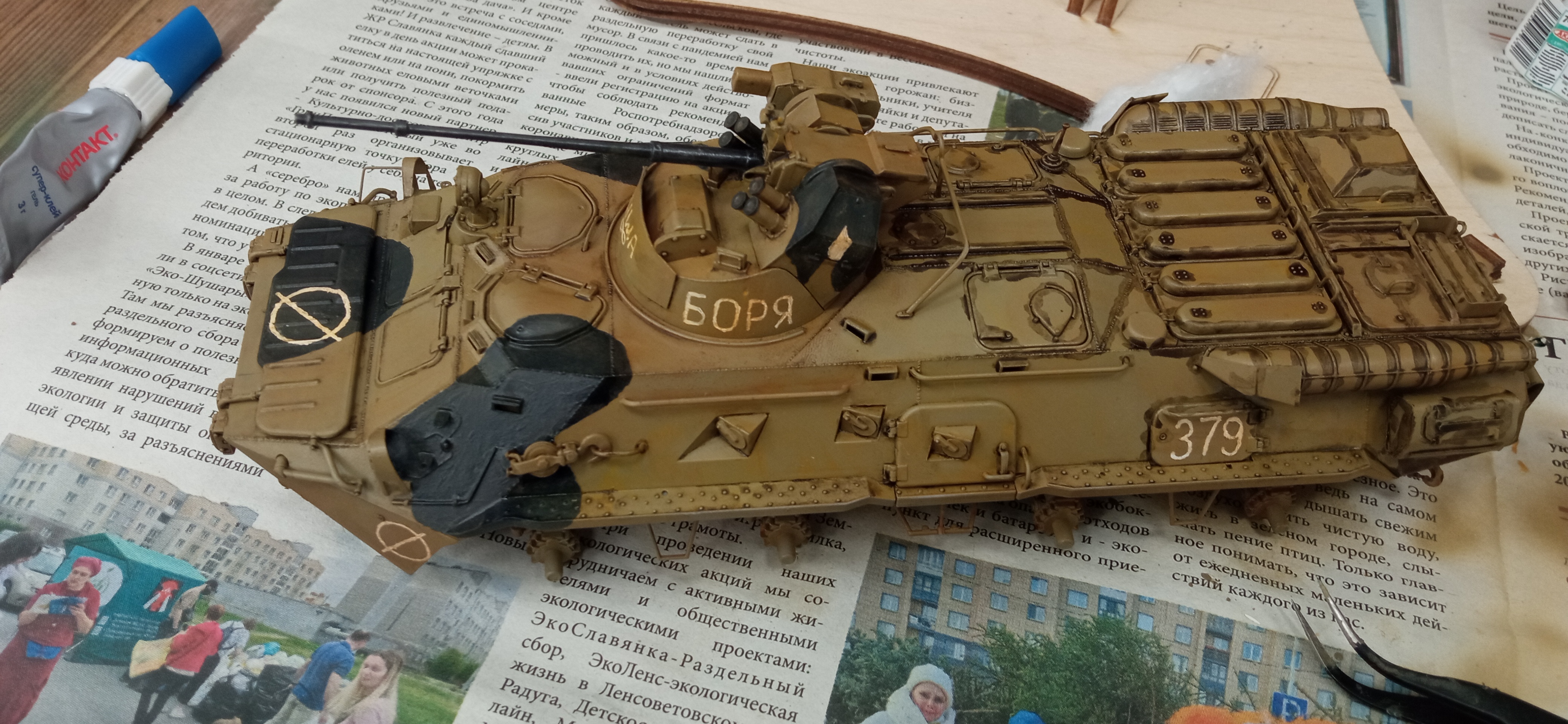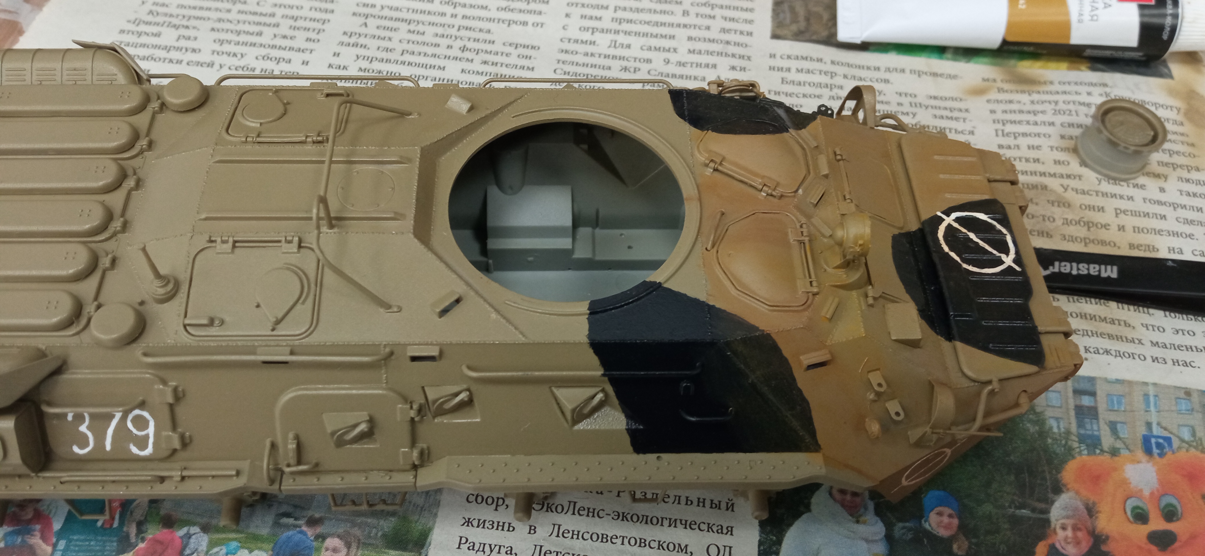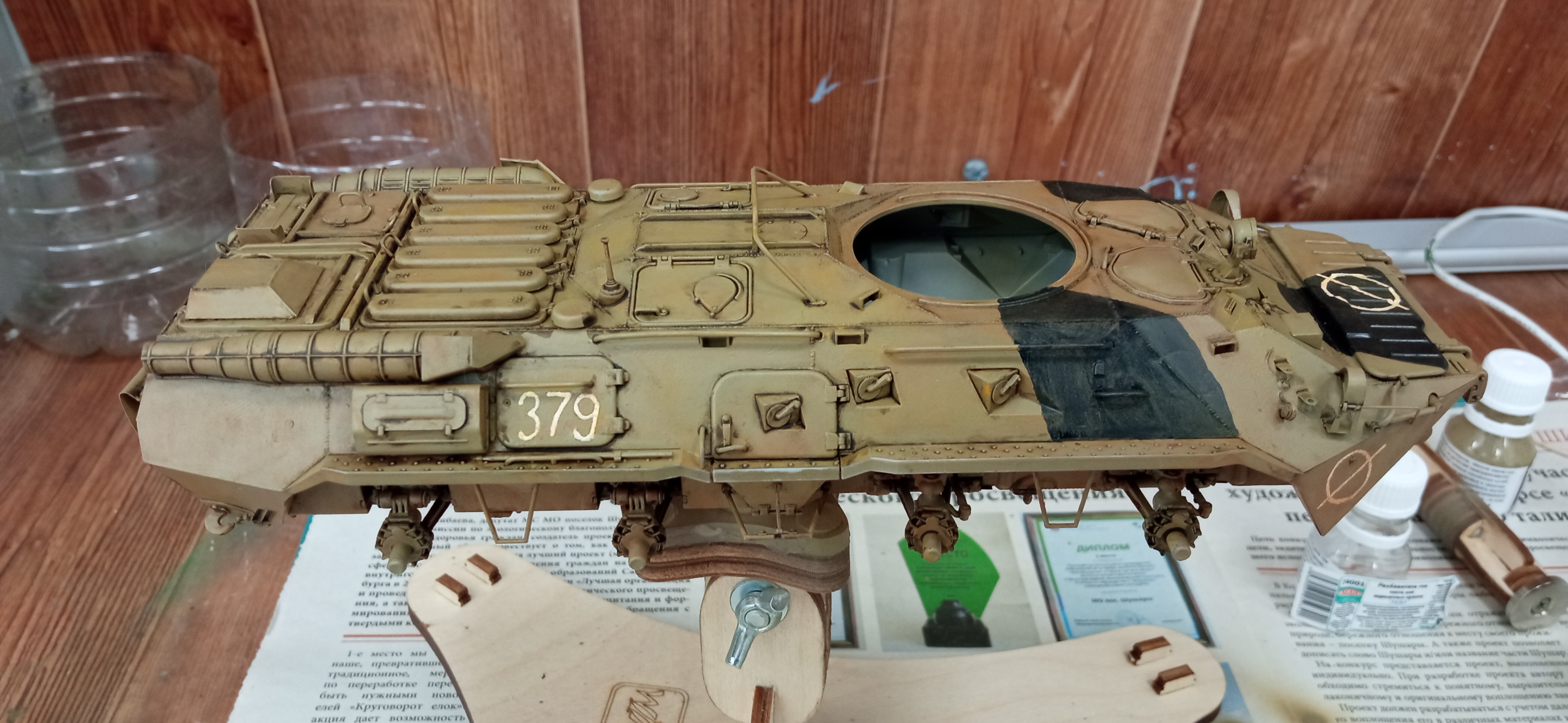 После долгого перерыва появилась возможность заняться подарком. База аэрографом задута. Надписи сделаны от руки по фото и просьбам заказчика (на боковинах башни). Камуфляж кистью.