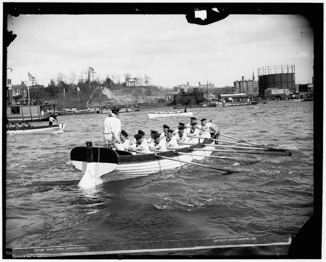 В гонке участвуют шлюпки с корвета "Рында", на фотографии они справа (слева - англичане, по центру - американцы). У "Рынды" шлюпки имели и полностью окрашенные в белый внутренние борта, и с волноотбойными бортиками, окрашенными изнутри в другие цвета (это заметно и на групповом фото на борту корабля того же дня, ниже). Такой нюанс относится и к иностранным шлюпкам, запечатлённым в период данных мероприятий, посвященных 400-летию открытия Америки и одновременно проведения Всемирной выставки.