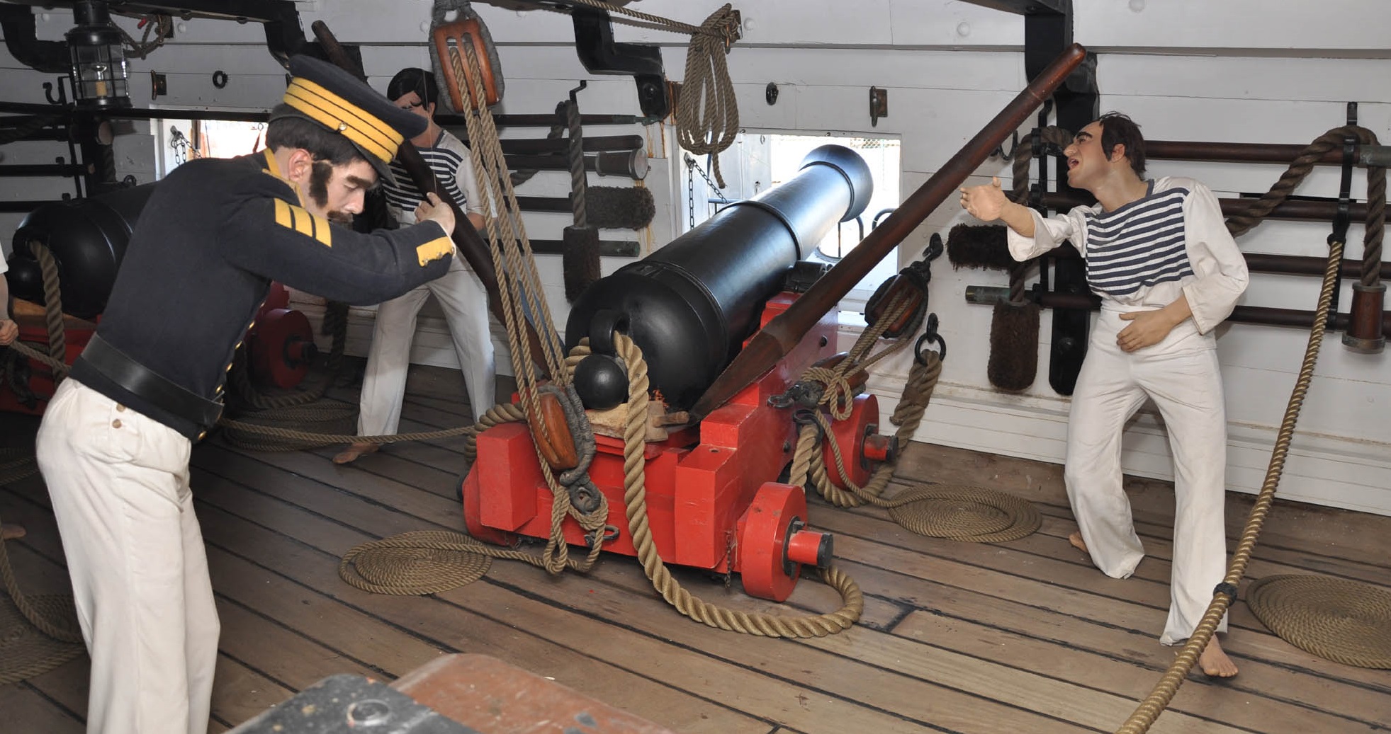 Это клин. Совершенно верно, Виталий, клин отвечал за наводку орудия по вертикали. В походном положении клин хранился между постелью и щекой станка. В бою, при наводке, обслуга приподнимала казенную часть ствола с помощью гандшпугов (специальных деревянных рычагов), опирая гандшпуги на выступы, расположенные "лесенкой" на верхней части щеки станка, и наводчик легко перемещал клин, не испытывая тяжести ствола. Горизонтальная наводка осуществлялась опять гандшпугами, - просовывая гандшпуг под специальный выступ станка за задними катками и опираясь им на палубный настил, обслуга перемещала орудие вправо-влево методом, скажем так, "поднятия-толкания".