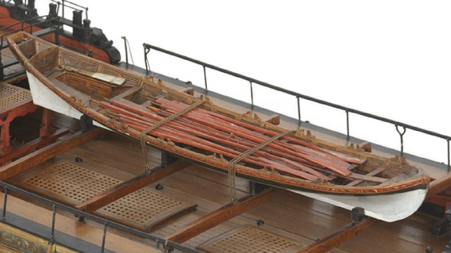 В группе Мастер-корабел ВК вчера выложили фотографии 1893 года, там видно, что шлюпка изнутри окрашена в белый ниже подлегарса. Конечно, эпоха не та, но это косвенно подтверждает, что шлюпки могли краситься таким образом.