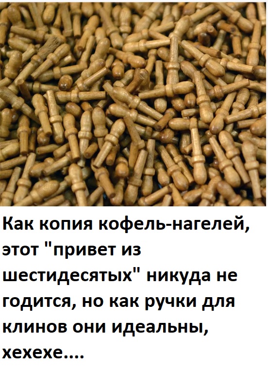 Виталий, да! Буквально сегодня ночью "погулял" по любимому интернет-магазину "Верфь на столе", думаю, прикупить, какие запасы подходят к концу, и вдруг вспомнил: блиииин, надо было Виталию подсказать, где этих самых ручек - пруд пруди! Конечно же, эти дурацкие кофель-нагели, что зарубежные фирмы пачками суют в свои наборы, и которые не кофель-нагели ни разу, а чистое издевательство над бедными ни в чём не повинными моделистами, так они на Верфи чуть ли не мешками продаются по просто смешной цене "ни о чём", чуть ли не даром. Короче, наши с тобой мысли сошлись... Старые совершенно не копйные кофель-нагели в магазине на Верфи по двести рублей за тонну - отличный материал для ручек клинов!