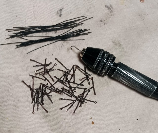 Взял жилы 0,3мм от кабеля и почернил. Потом накрутил за 15 минут 60 рымов. На весь кораблик с запасом.