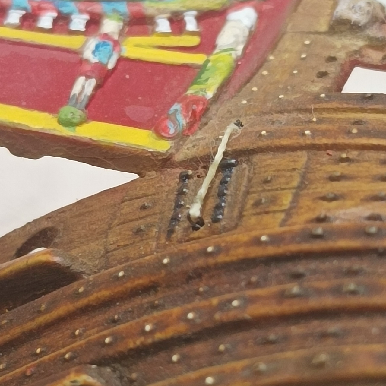 Теперь надо делать тали портов. Тали из китайских нитей 0,2 мм. Шлаги огонов - нитки Гутерманн Скала 240 - 0,1 мм примерно или менее.